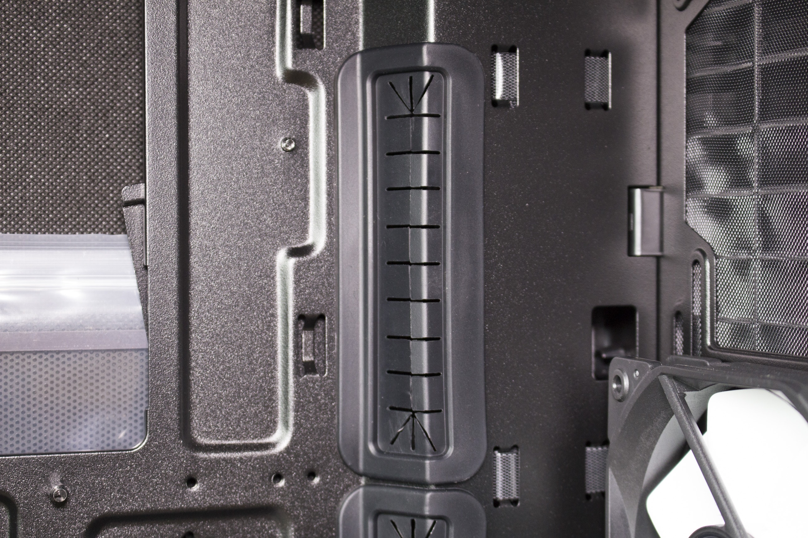 Mittig im Innenraum, direkt auf Höhe des Hecklüfters, findet sich eine große Aussparung im Mainboard-Tray. Dies ermöglicht die einfache Montage von Mounting-Kits für den CPU-Kühler. Außerdem befinden sich um das Mainboard-Tray herum vier Durchführungen, die mit Gummi geschützt sind. Dort können Kabel ideal verlegt werden. Für ein positives Kabelmanagement weist das Gehäuse im Vorderbereich einen Bogen auf. Hier lassen sich sämtliche Kabel verstauen. Hinter dem CPU-Kühler findet ihr eine Montageschiene. Auf dieser lassen sich drei 2,5″-Festplatten montieren.