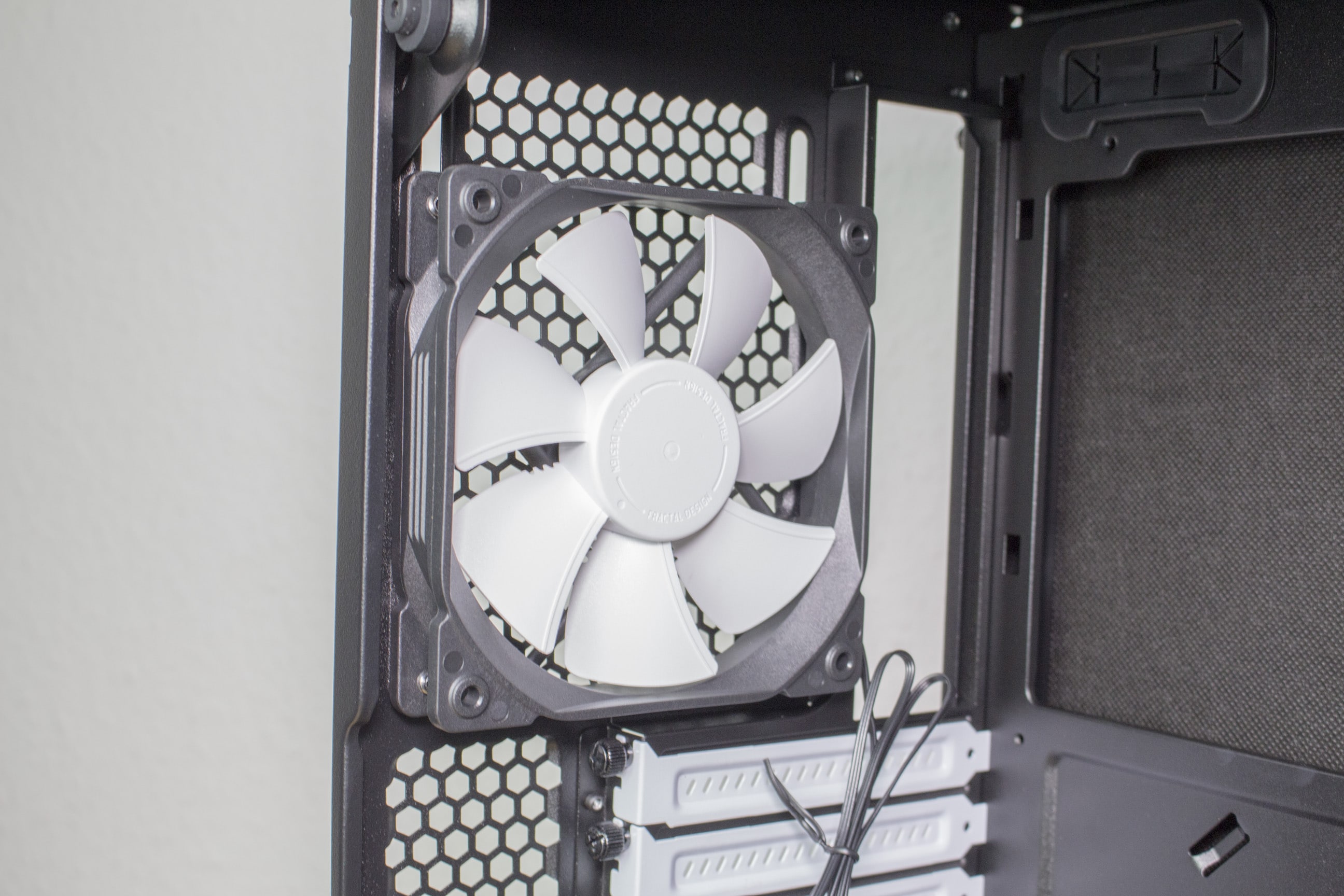 Im oberen Bereich des Fractal Design Define C Tempered Glass* Gehäuse finden wir eine Aussparung für die Mainboardblende. Weiterhin eine solche für den vorinstallierten 120 mm-Lüfter. Darunter befinden sich sieben weiße PCI-Slotblenden und ein weiterer Platz für das Netzteil inklusive Abdeckung.