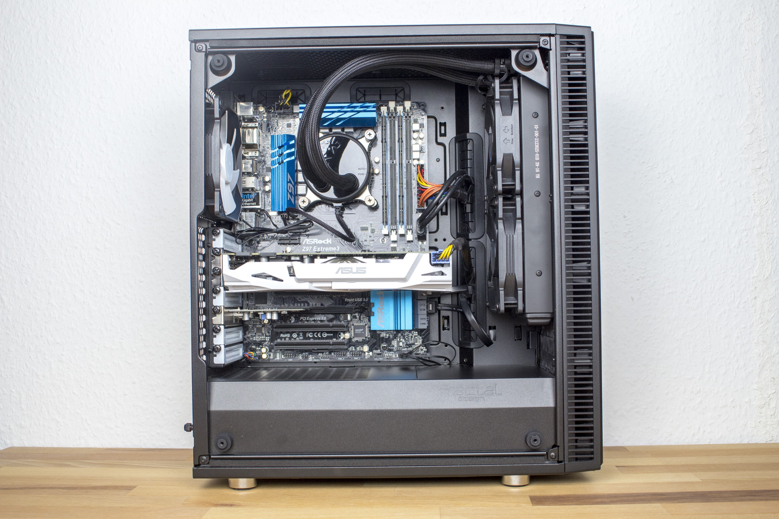 Wer ein einfach zu handhabendes Gehäuse mit minimalistischen Außenmaßen und dennoch großem Innenraum sucht, ist mit dem Fractal Design Define C Tempered Glass* Gehäuse durchaus gut beraten. Hier passt die Gaming-Hardware eines durchschnittlichen Zockers auf jeden Fall rein. Besonders prädestiniert ist es dabei für eine AiO-Kompaktwasserkühlung, wie ihr unserem Foto entnehmen könnt. Das einzige was noch fehlt sind vorverlegte RGB-Stripes.