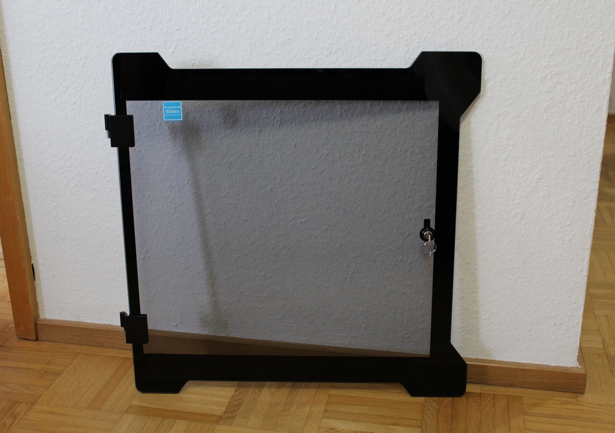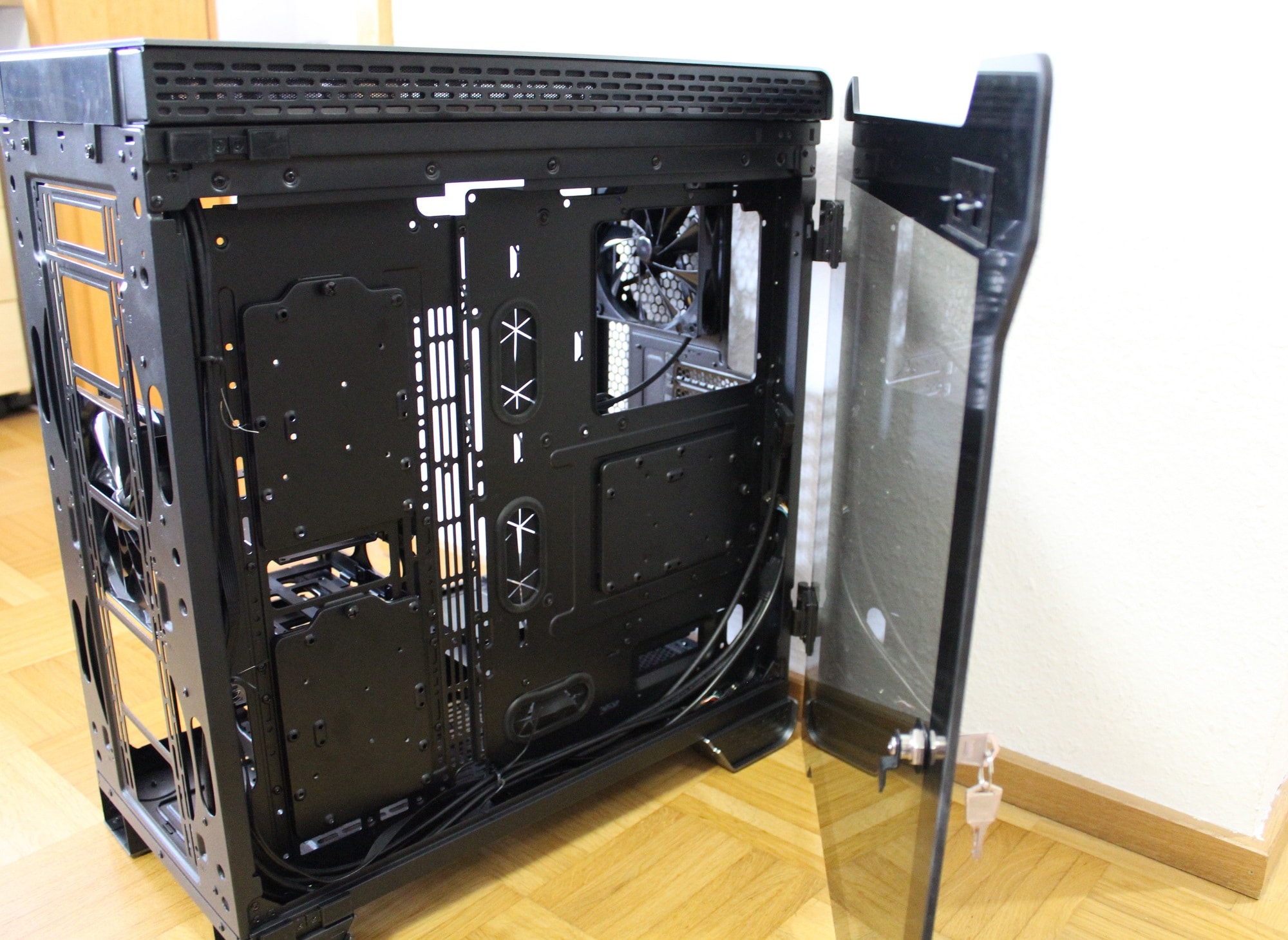 Optisch auffällig sind die beiden Glaselemente des Gehäuse. Sowohl die linke, als auch rechte Seite bestehen aus einem einzigen 5 mm dicken und 3,6 kg schweren Tempered-Glass-Element. Damit sind die beiden zusammen schon schwerer als manche ATX-Gehäuse. Die Glaselemente sind wie eine Tür aufklapp- und mit einem Schlüssel verschließbar. Durch einen metallischen Außenrahmen werden diese im geschlossenen Zustand zusätzlich magnetisch am Gehäuse fixiert – es klappert somit nichts.