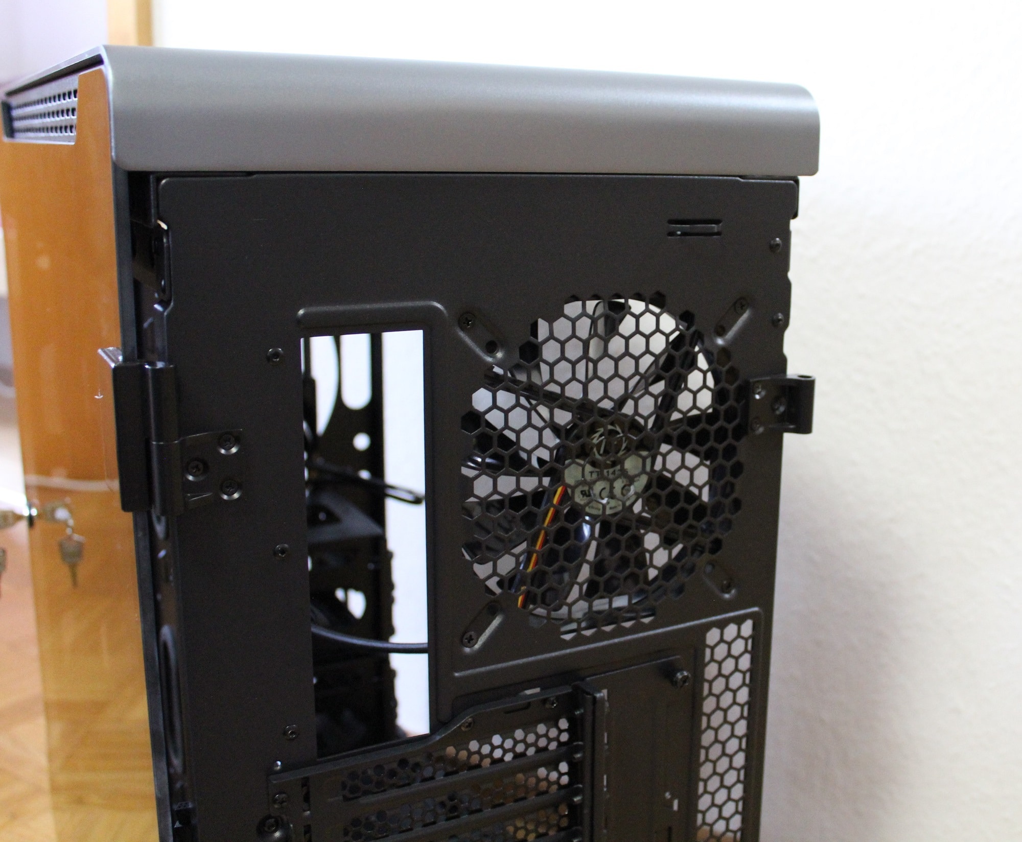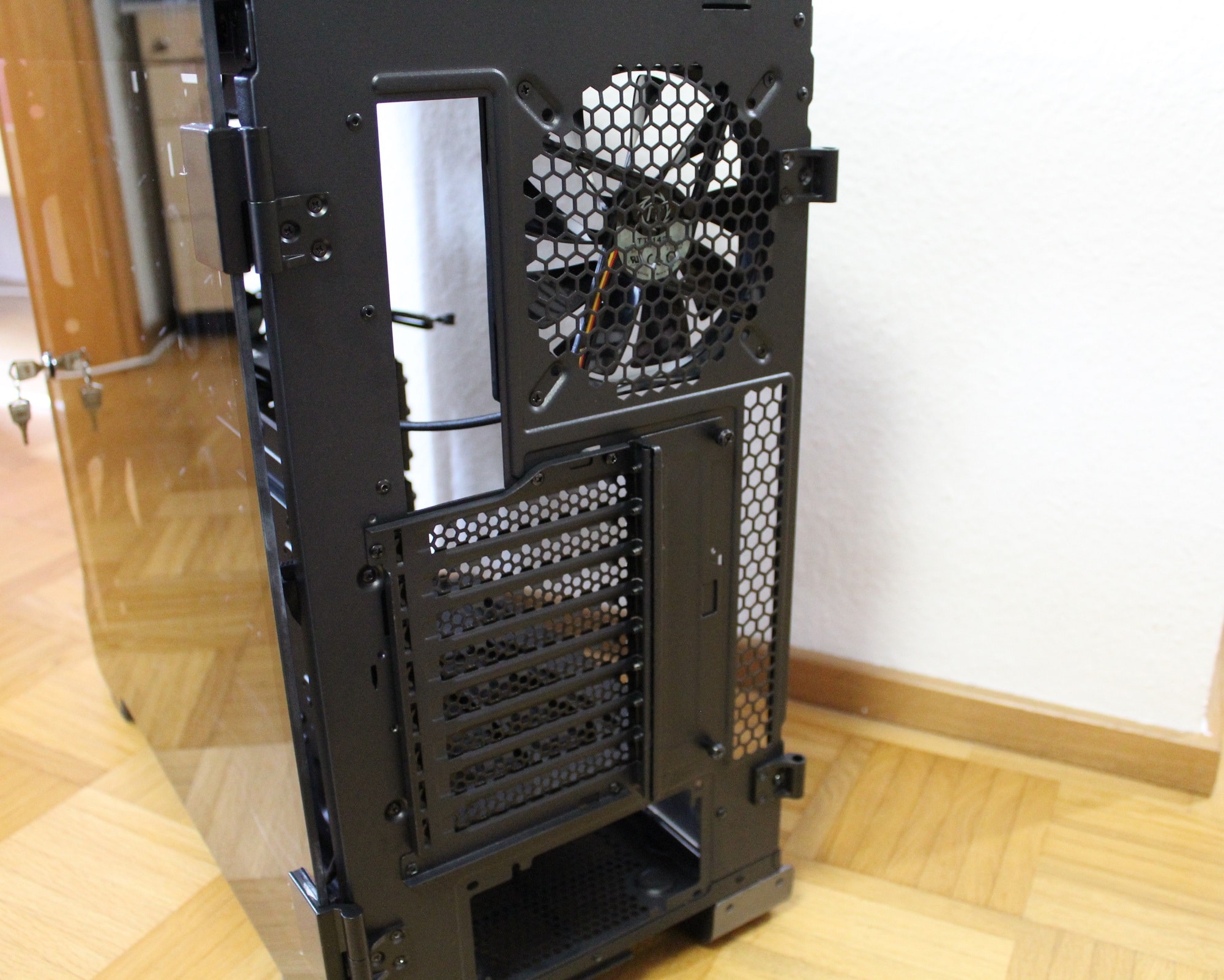 Die Rückseite des A700 besteht hauptsächlich aus schwarzem Stahl. Im oberen Teil ist der bereits mitgelieferte schwarze 140-mm-Lüfter zu sehen. Darunter sind die acht modularen PCI-Slots zu sehen. Optional kann auch beispielsweise eine Grafikkarte vertikal montiert werden.