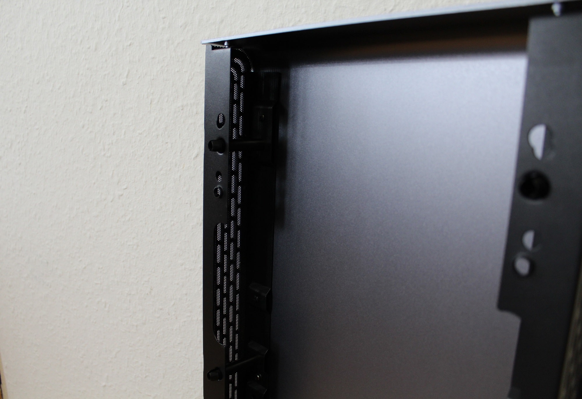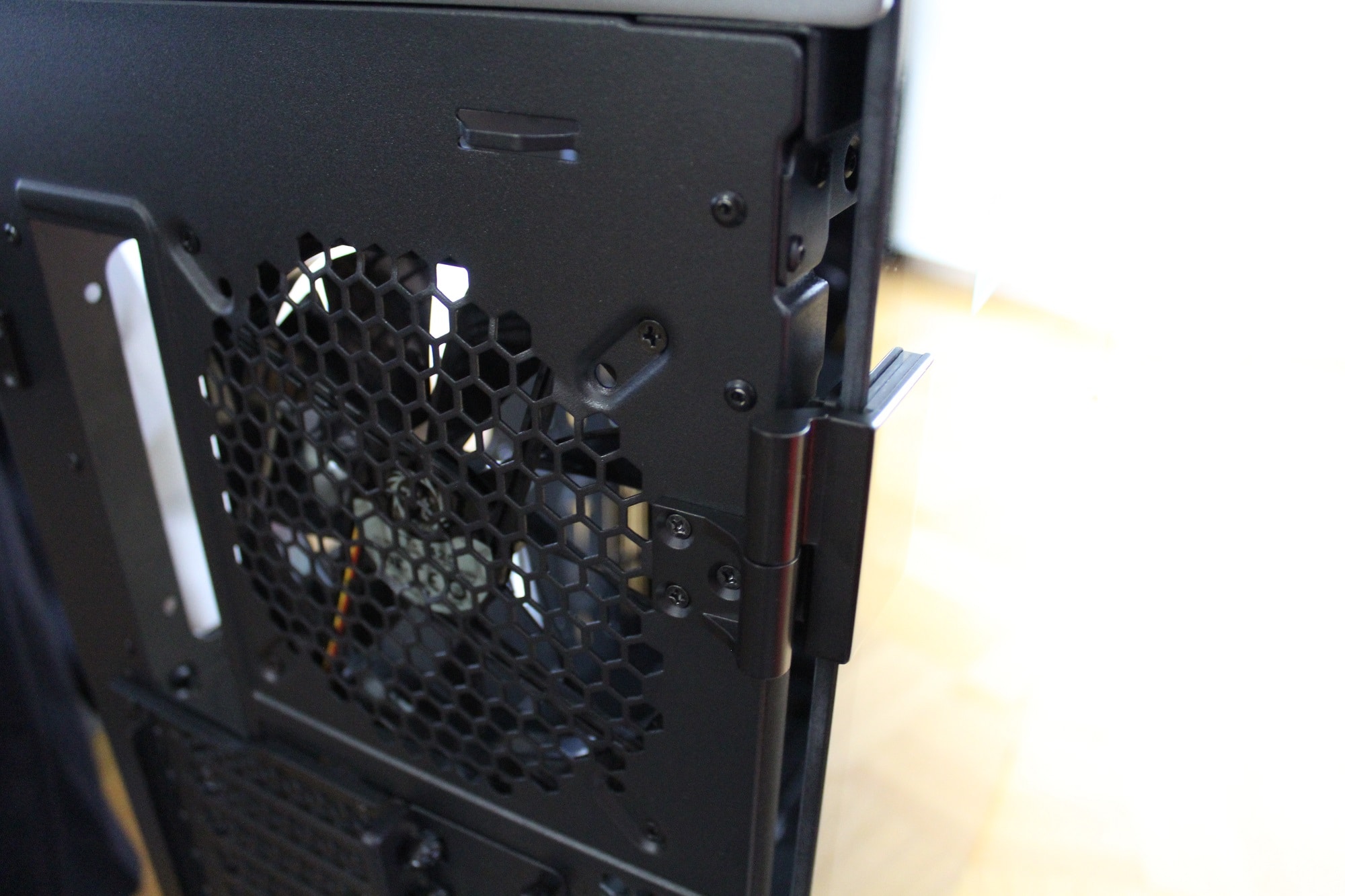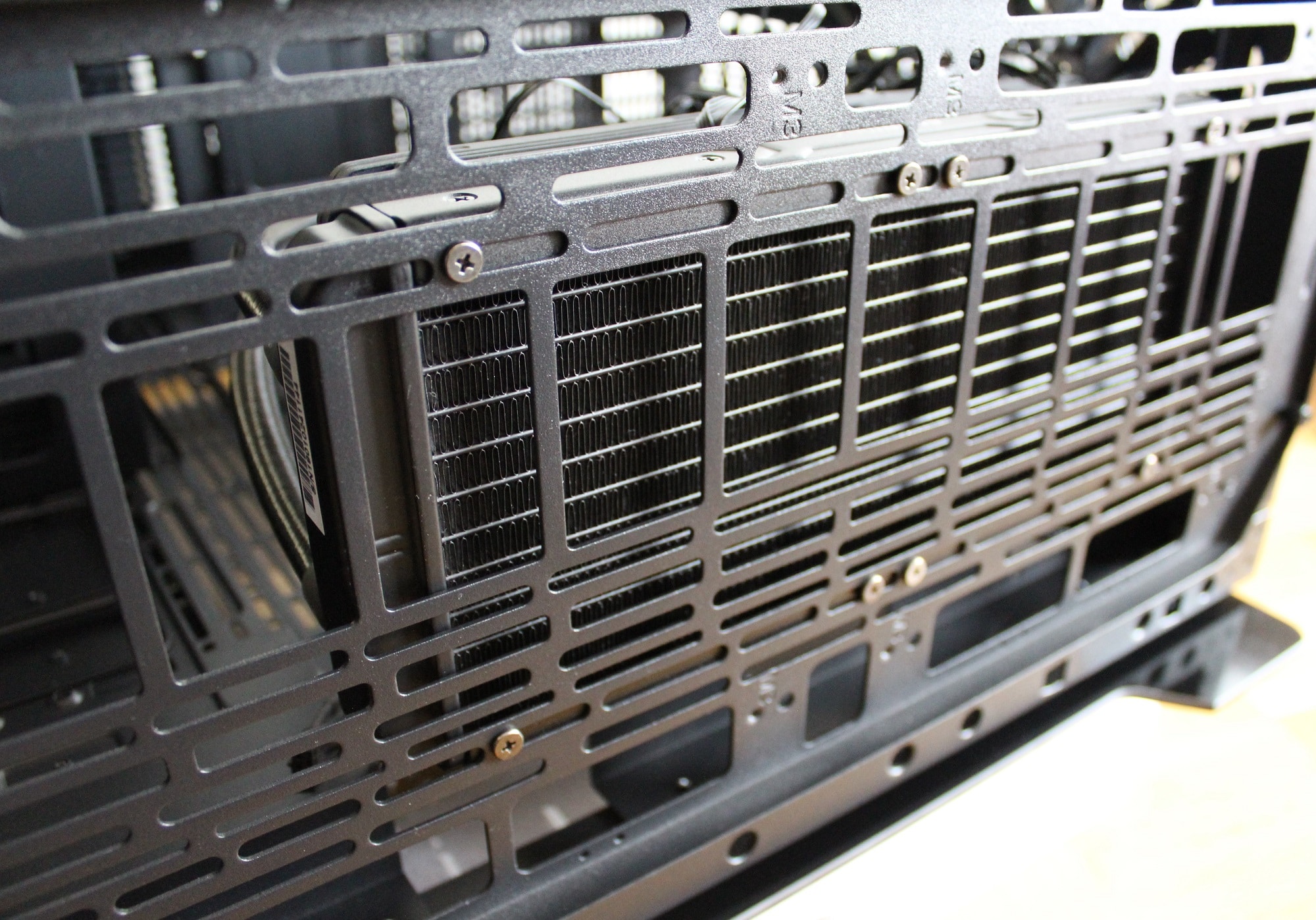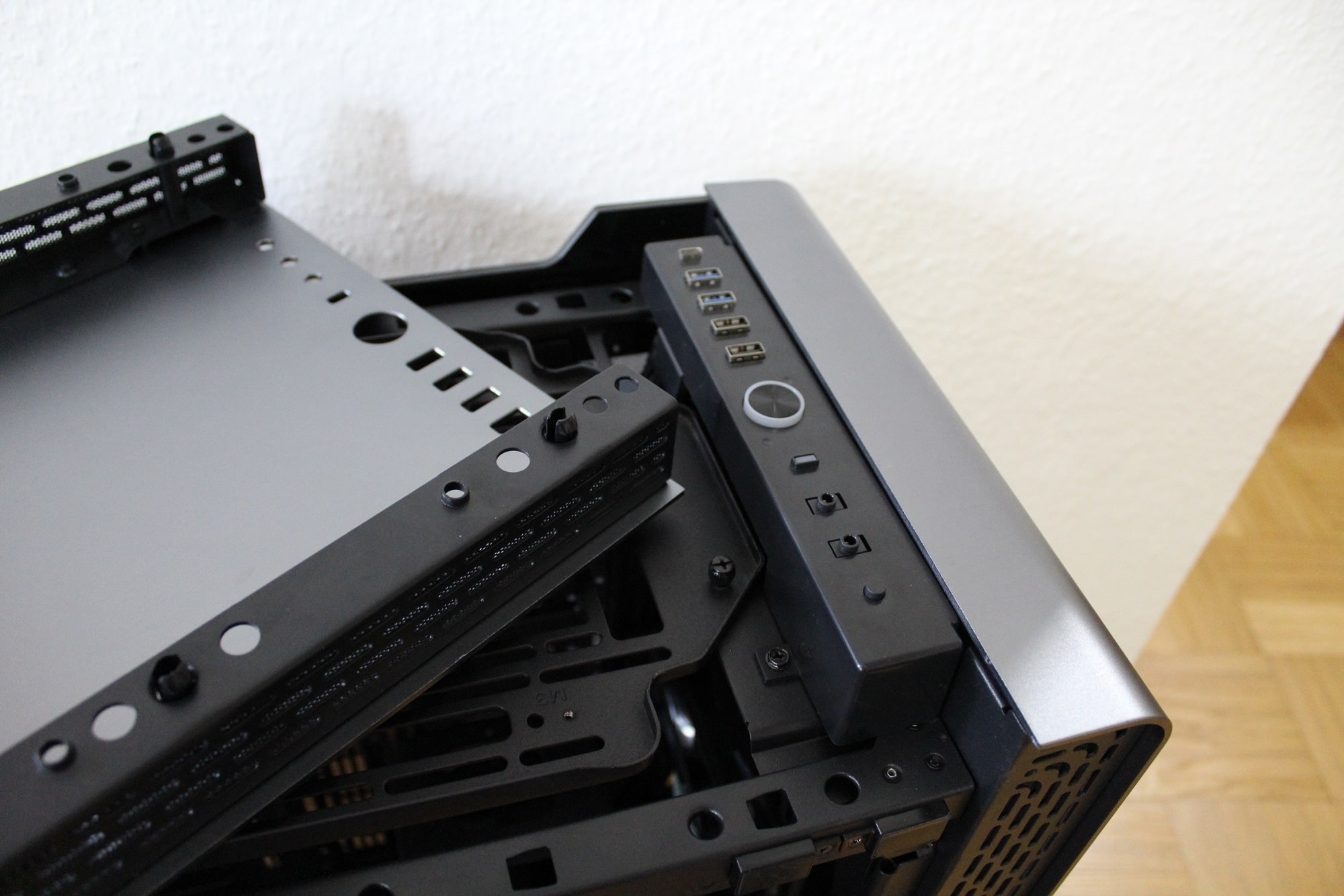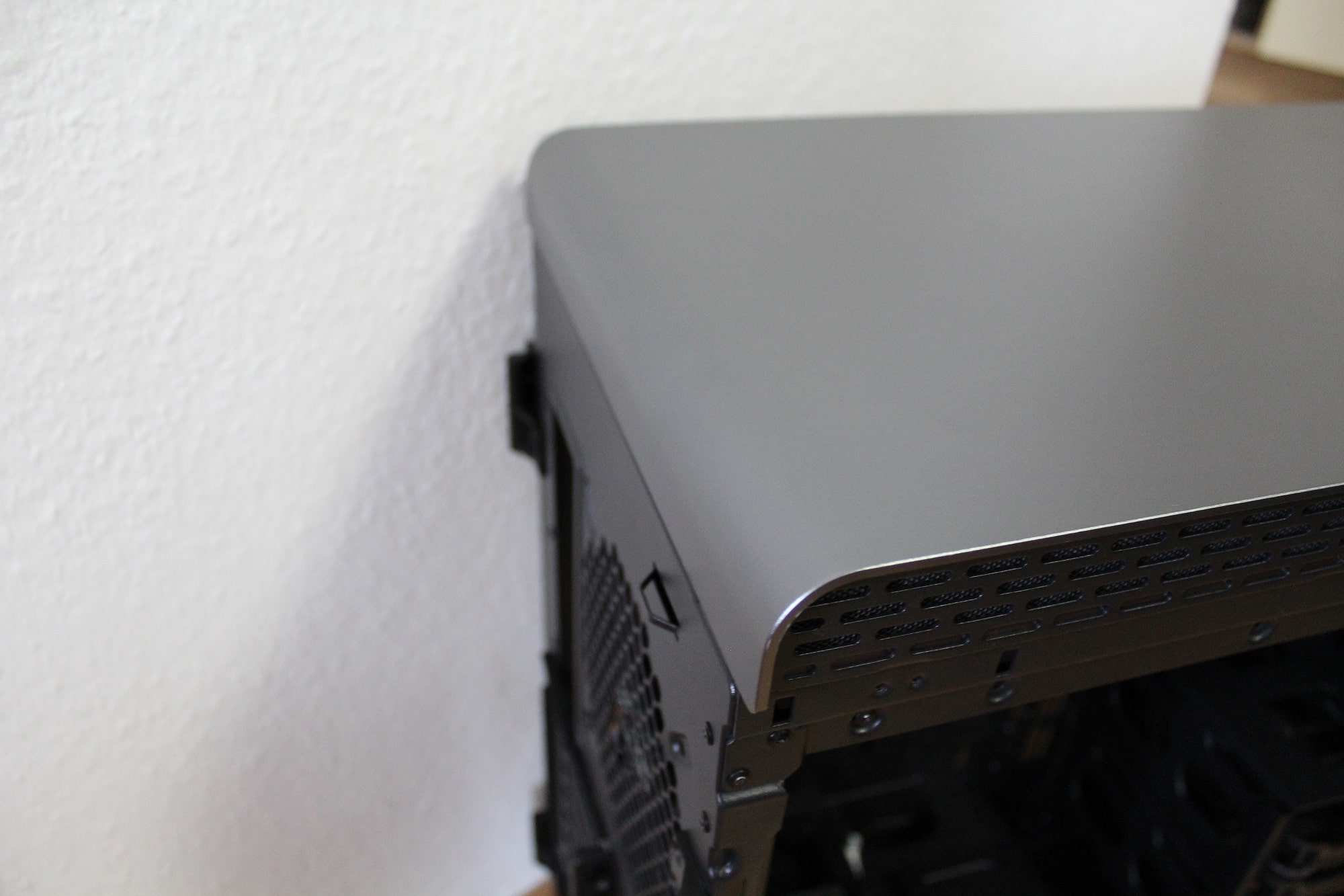 Sowohl das vordere als auch das obere Element besteht aus Aluminium. Beide tragen einiges zum Gesamtgewicht des Gehäuses bei (das vordere Element wiegt alleine bereits 2,2 kg) und sind ohne Werkzeug abnehmbar. Anschließend können problemlos Lüfter oder Radiatoren befestigt werden. Die Luft wird seitlich angezogen.