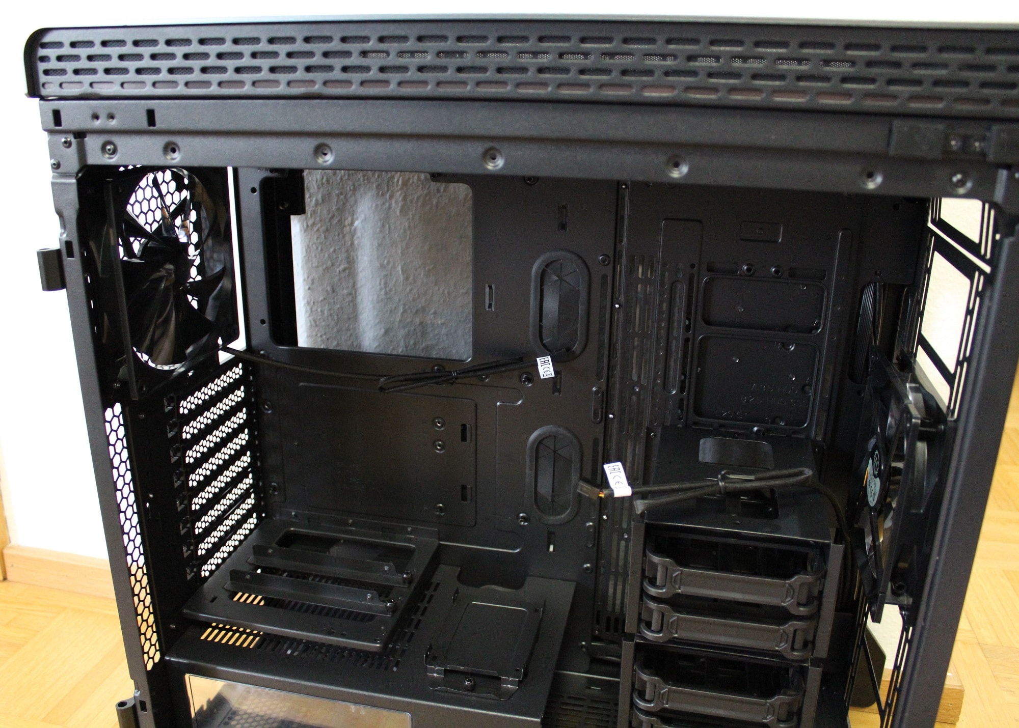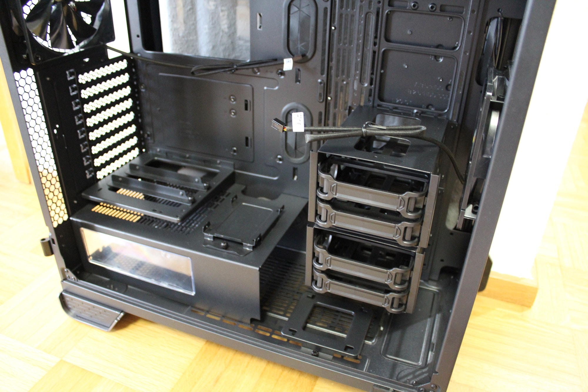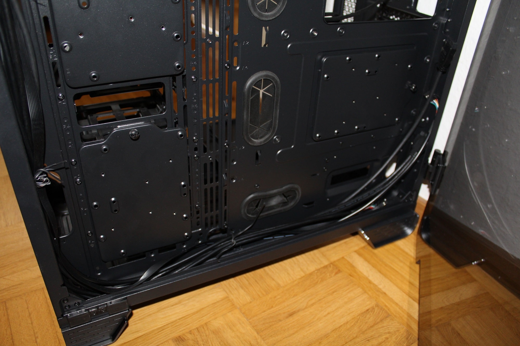 Die Raumtrennung zwischen dem Netzteil- und Mainboardbereich und die gut platzierten Kabeldurchführungen erlauben ein gutes Kabelmanagement im sichtbaren Bereich.