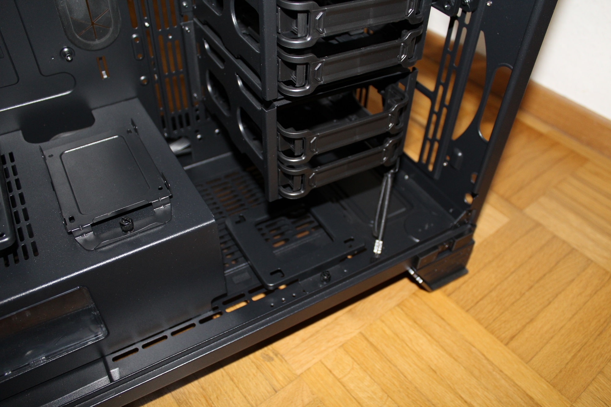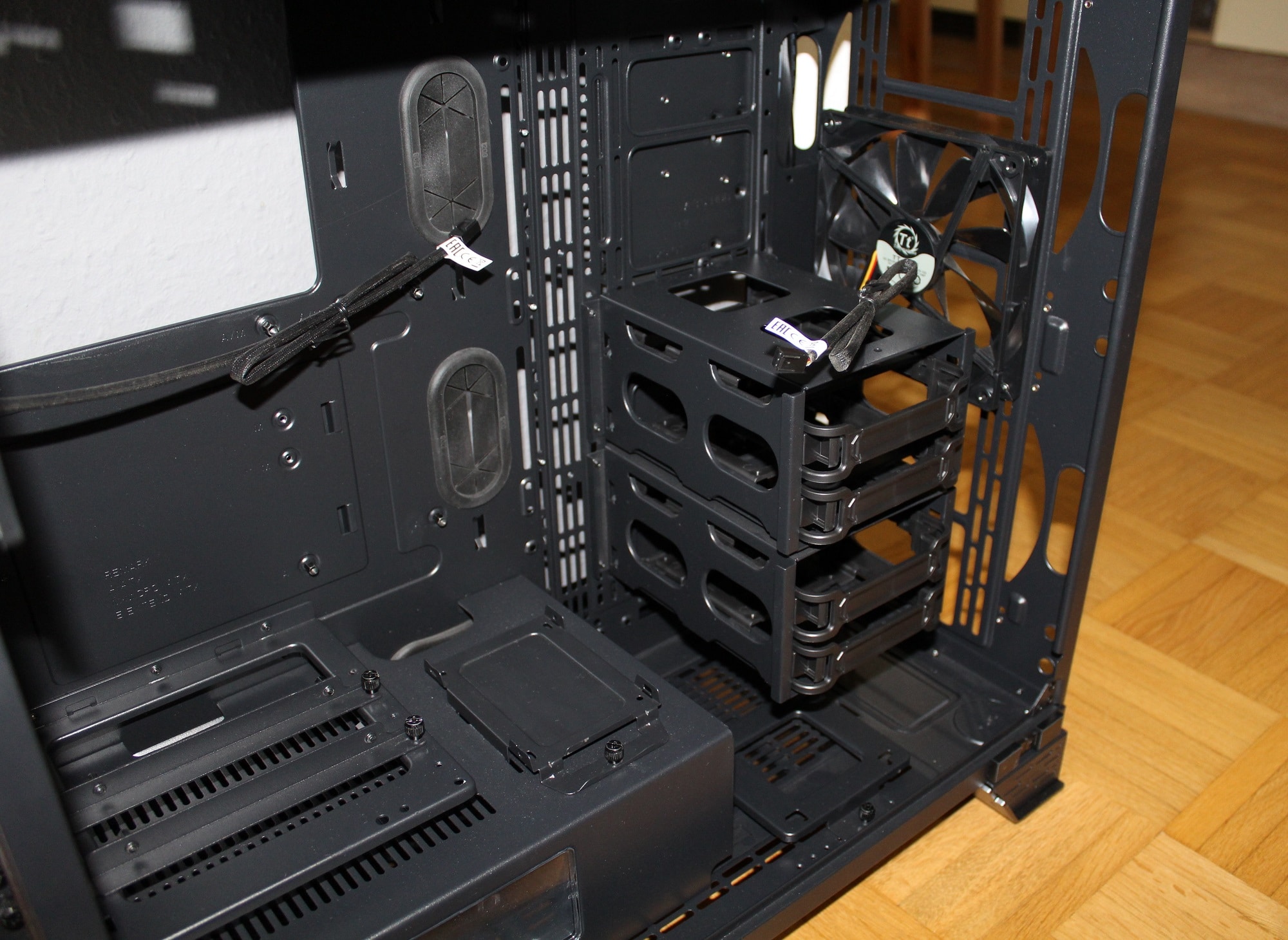 Thermaltake spendiert seinem A700 zwei modulare Festplattenkäfige. Die Montage-Höhe ist frei auswählbar. Zudem existieren sehr viele Möglichkeiten für die Montage von Wasserkühlungs-Elementen. Daneben sind zwei große gummierte Kabeldurchführungen platziert.