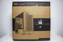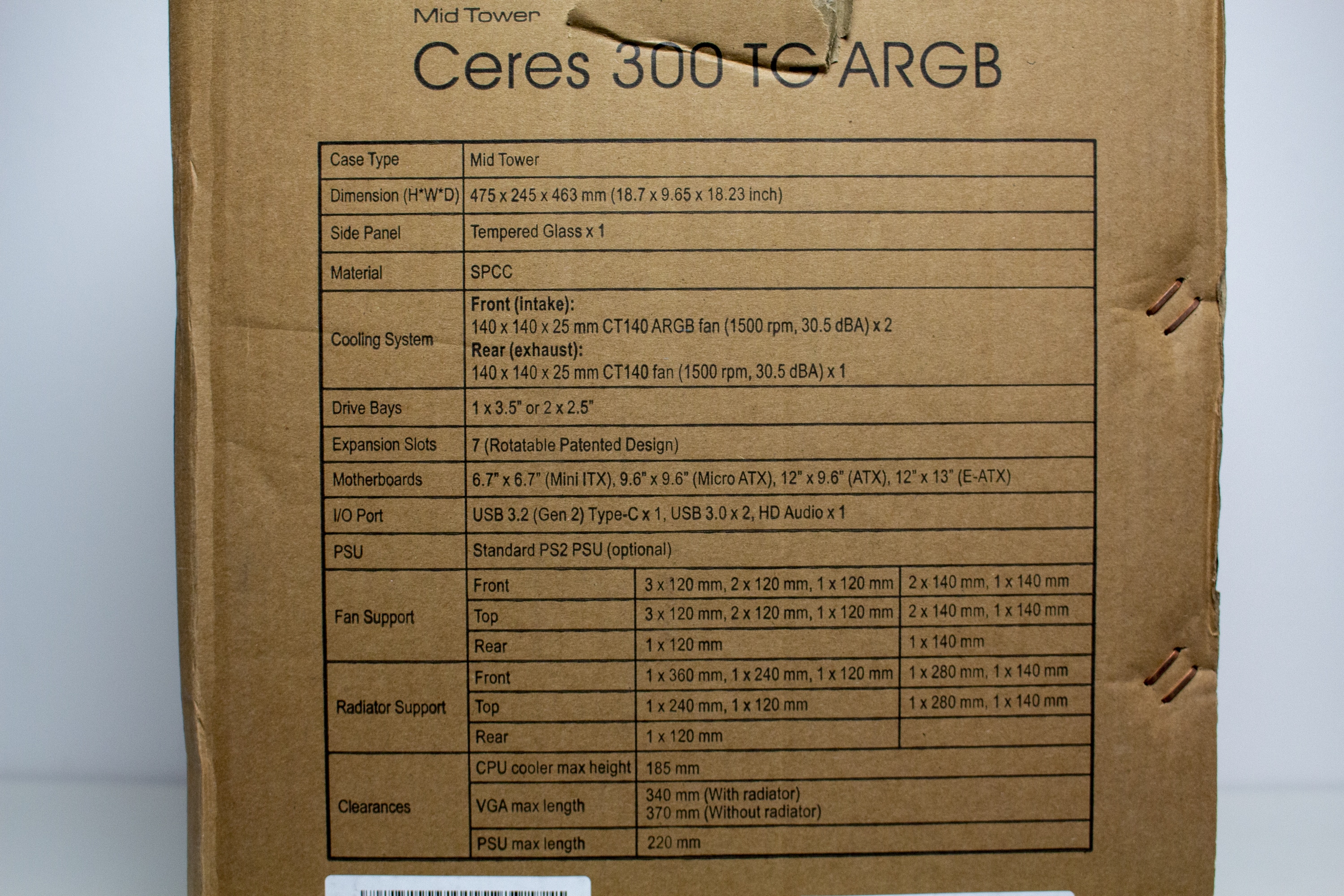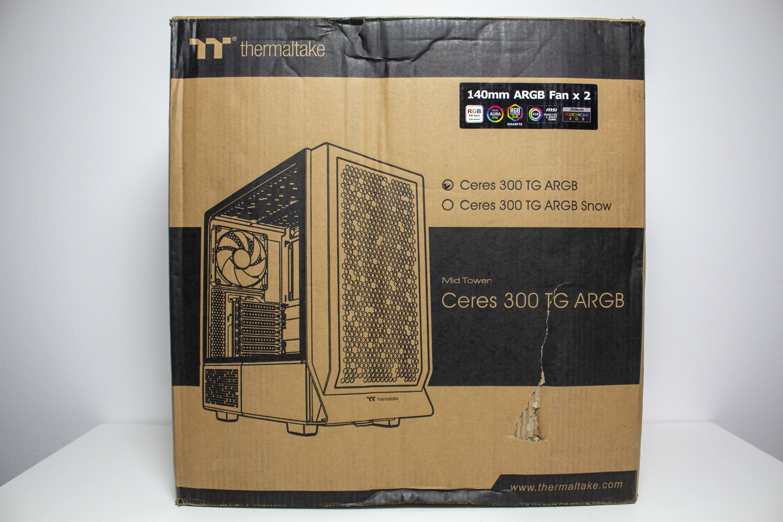 Wie üblich versendet Thermaltake das Ceres 300 in einem schlichten Karton aus brauner Pappe. In schwarzer Farbe wurden das Logo, einige Abbildungen des Gehäuses sowie eine Tabelle mit allen technischen Daten aufgedruckt. Außerdem wurde ein farbiger Aufkleber auf die Verpackung geklebt, welcher explizit darauf hinweist, dass im Ceres 300 TG ARGB zwei ARGB-Lüfter verbaut sind. Weiterhin finden wir auf der Kartonage einen Hinweis darauf, ob im Inneren die weiße oder schwarze Version des Gehäuses zu finden ist.