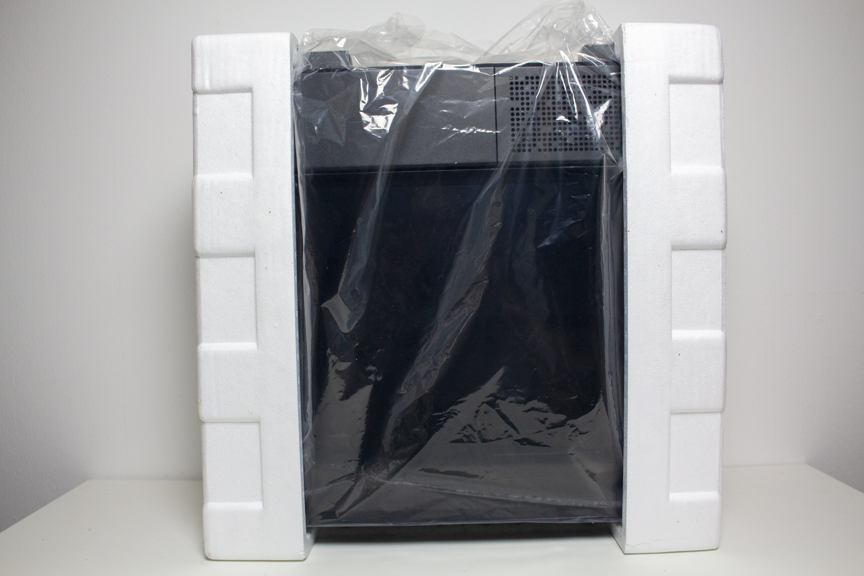 Im Inneren umhüllt Thermaltake den Midi-Tower mit einer Folie aus Kunststoff sowie mit zwei Blöcken aus herkömmlichen Styropor. Das Montagezubehör platziert der Hersteller in einer kleinen braunen Schachtel, die auf der Vorderseite des Mainboard-Trays mit einem Kabelbinder befestigt wurde. Inhalt der Schachtel sind eine Montageanleitung, einige Kabelbinder sowie ein Beutel mit allen notwendigen Montageschrauben. Außerdem gehören zum Lieferumfang drei vorinstallierte 140-mm-Lüfter und drei Staubfilter für Front, Deckel und Boden.