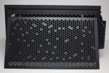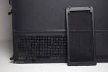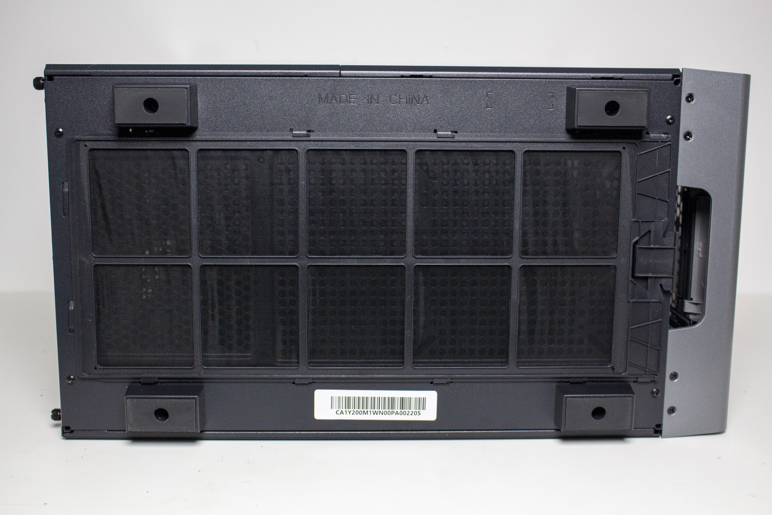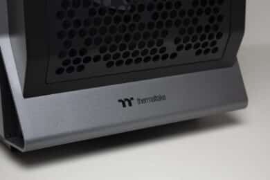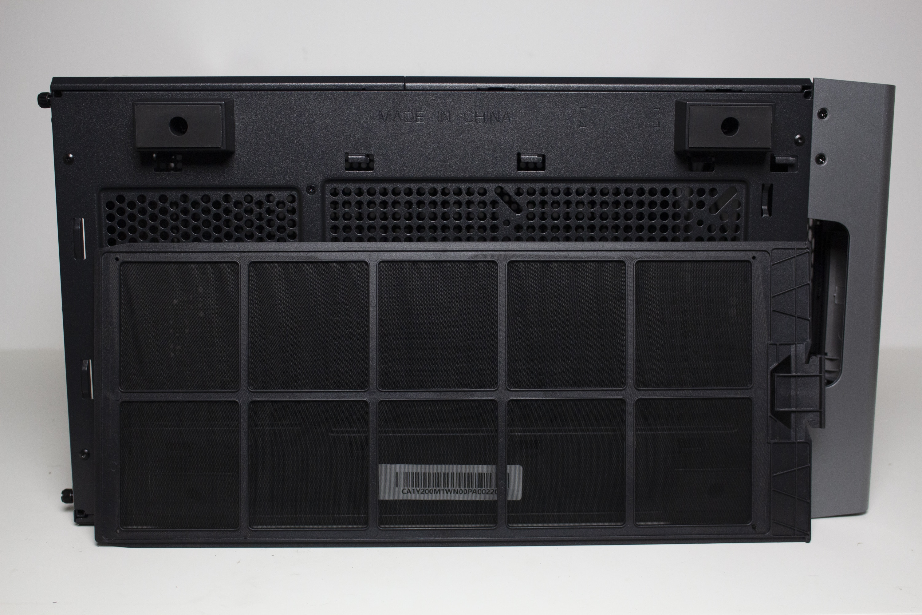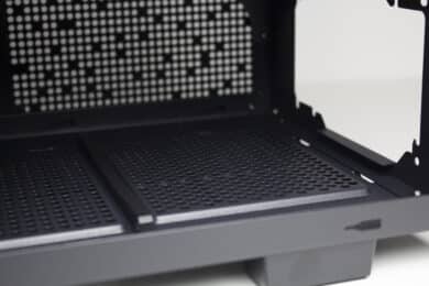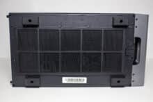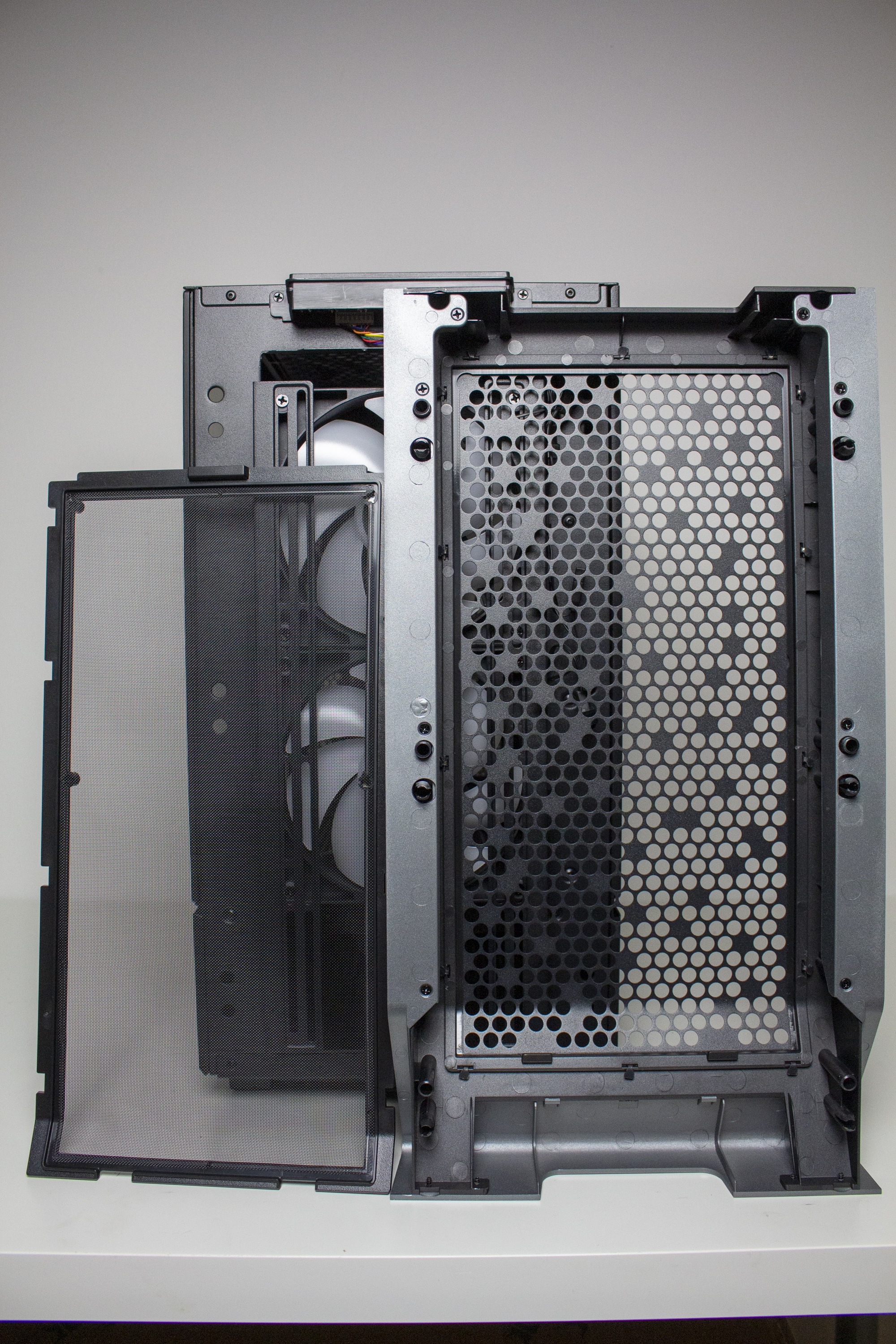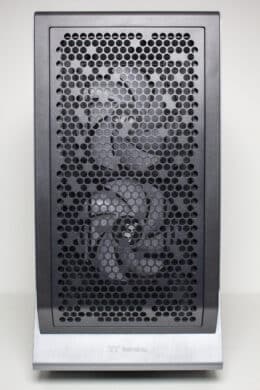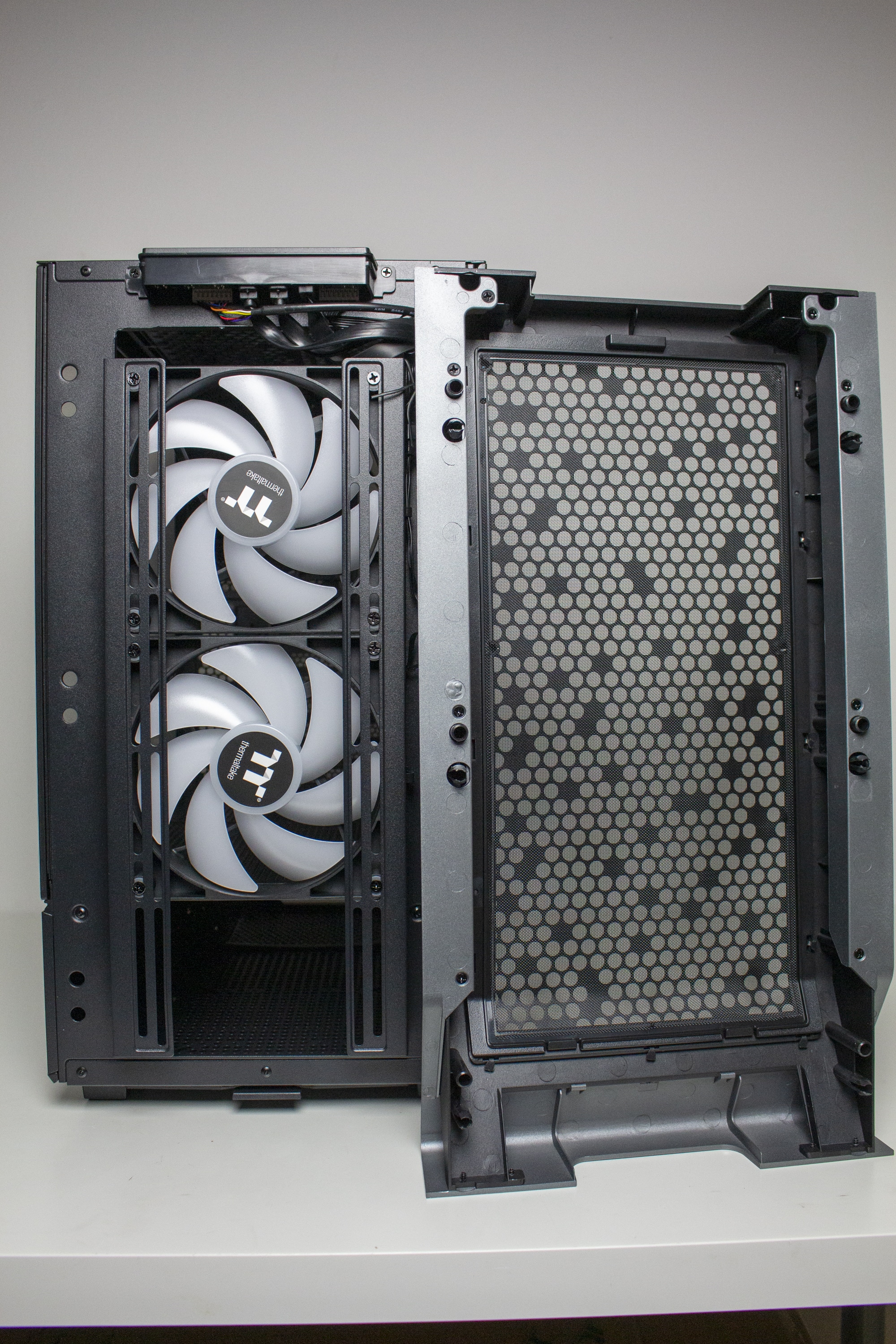 Hinter dem Gitter platziert Thermaltake einen feinmaschigen Staubfilter, der den Innenraum sowie die zwei vorinstallierten 140-mm-Lüfter vor Staub schützen soll und über Magnete arretiert wird. Um die entsprechenden Montageschienen sowie den Staubfilter erreichen zu können, muss das Frontpanel mit einem kräftigen Ruck abgezogen werden. Alternativ können an der Front auch drei 120-mm-Lüfter bzw. ein 360-mm-Radiator verbaut werden.