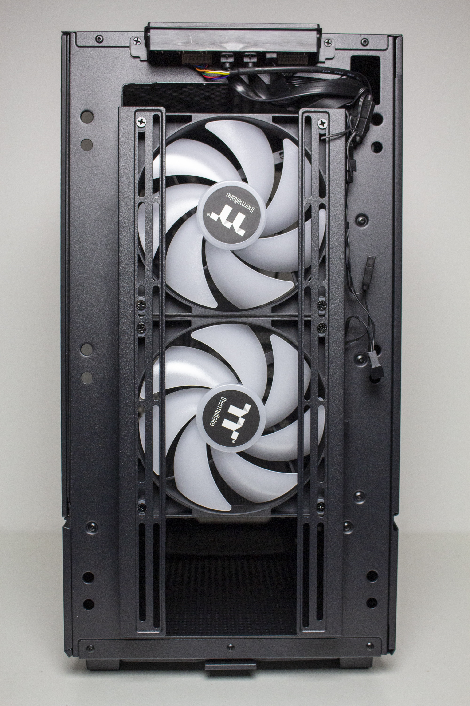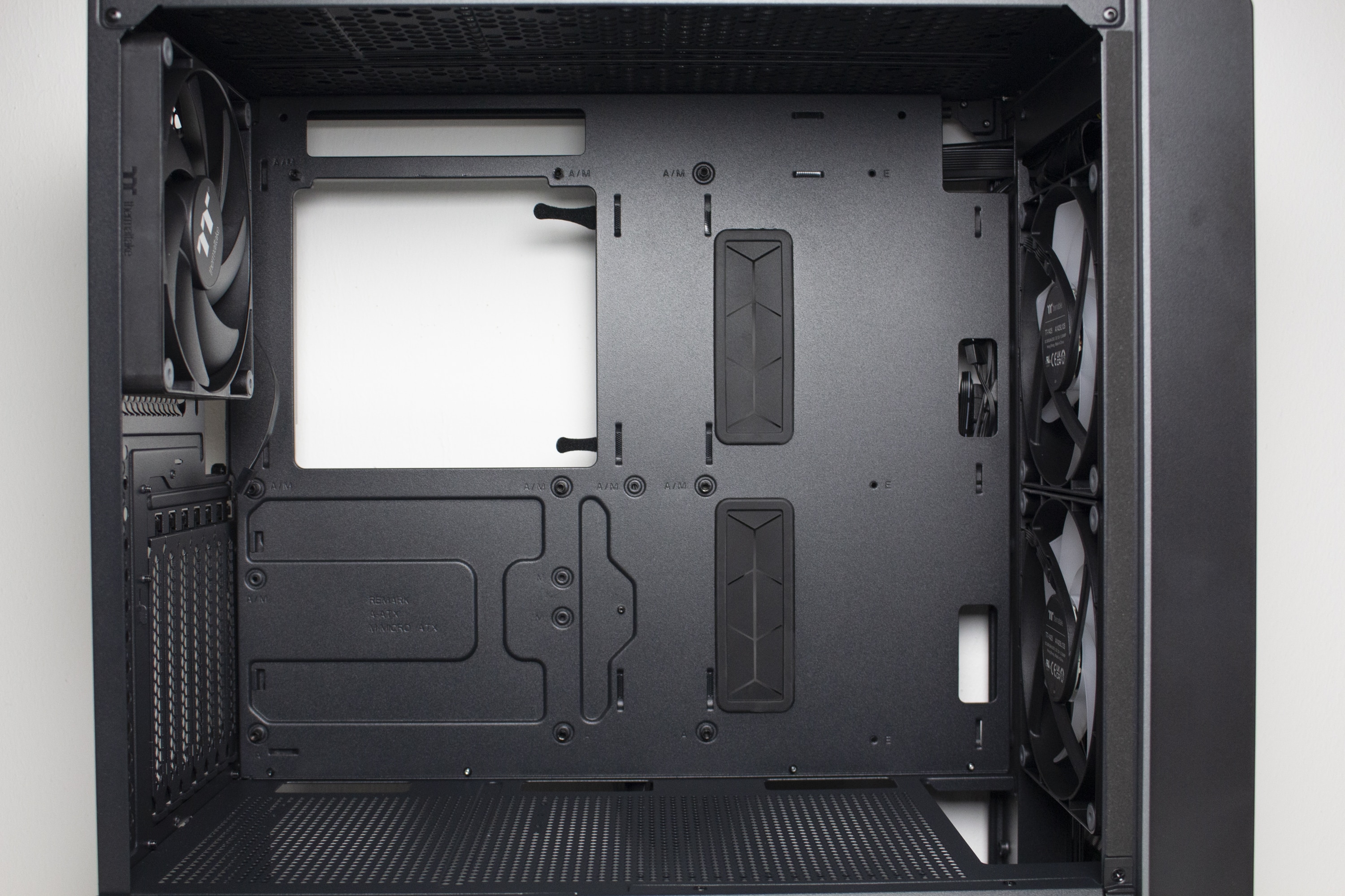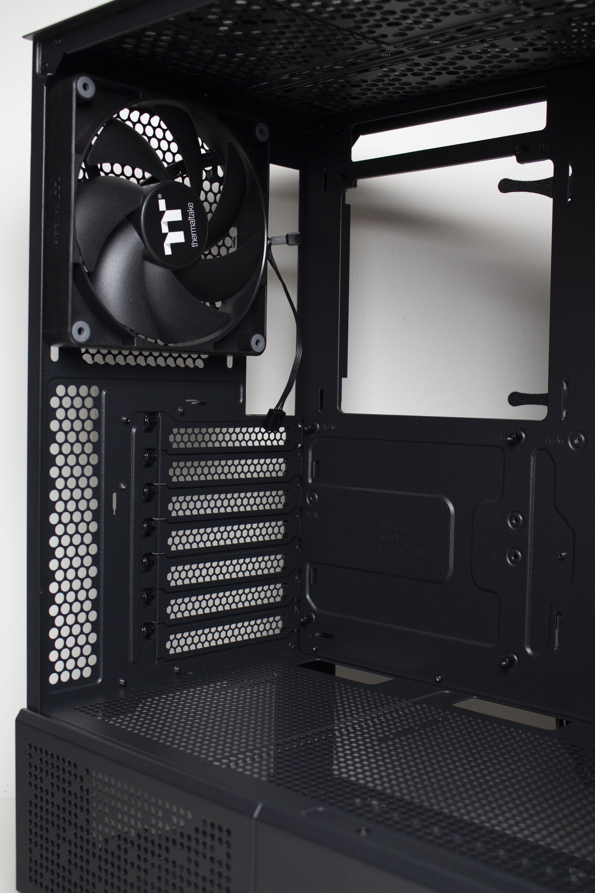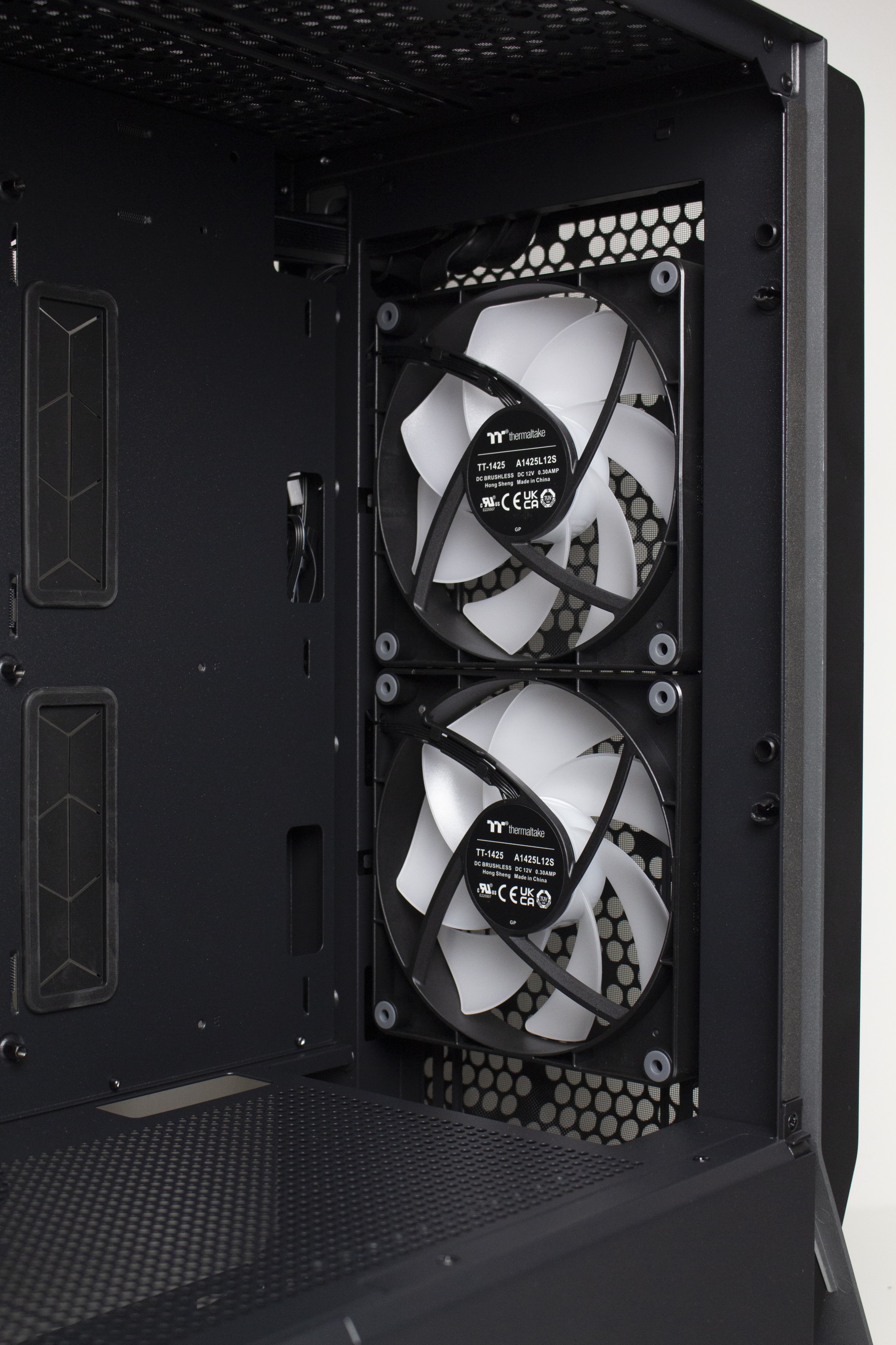 Im vorderen Bereich des Innenraums erhält man einen ungetrübten Blick auf die Rückseite der zwei vorinstallierten Lüfter. Diese können aufgrund fehlender Festplattenschlitten oder -käfige ungehindert Luft in den Innenraum befördern. Der dritte Lüfter an der Rückseite bläst die erwärmte Luft dann wieder nach außen. Leider spart sich Thermaltake hier den Einsatz einer ARGB-Variante. Perforationen unterhalb des Lüfters sorgen zudem für eine zusätzliche Luftzirkulation.