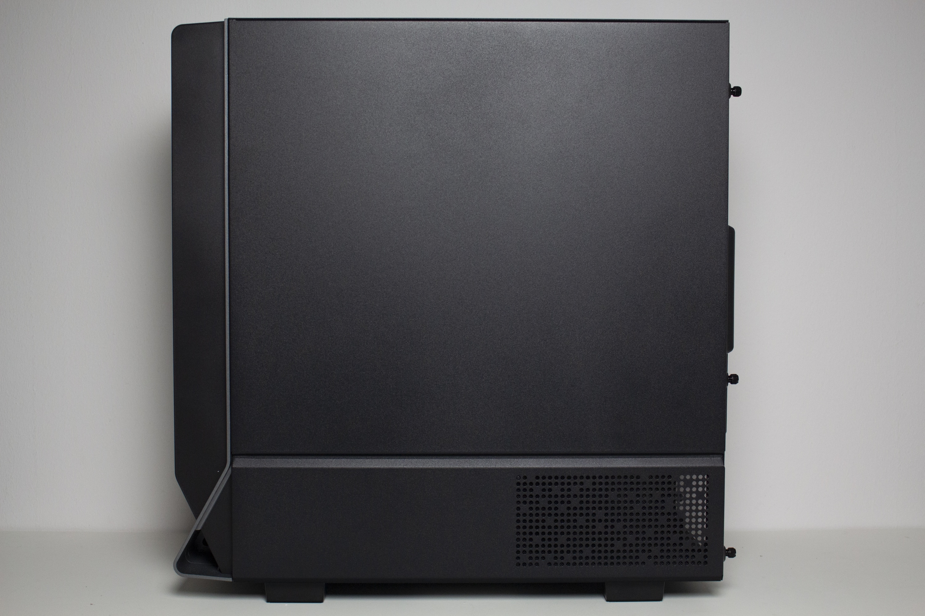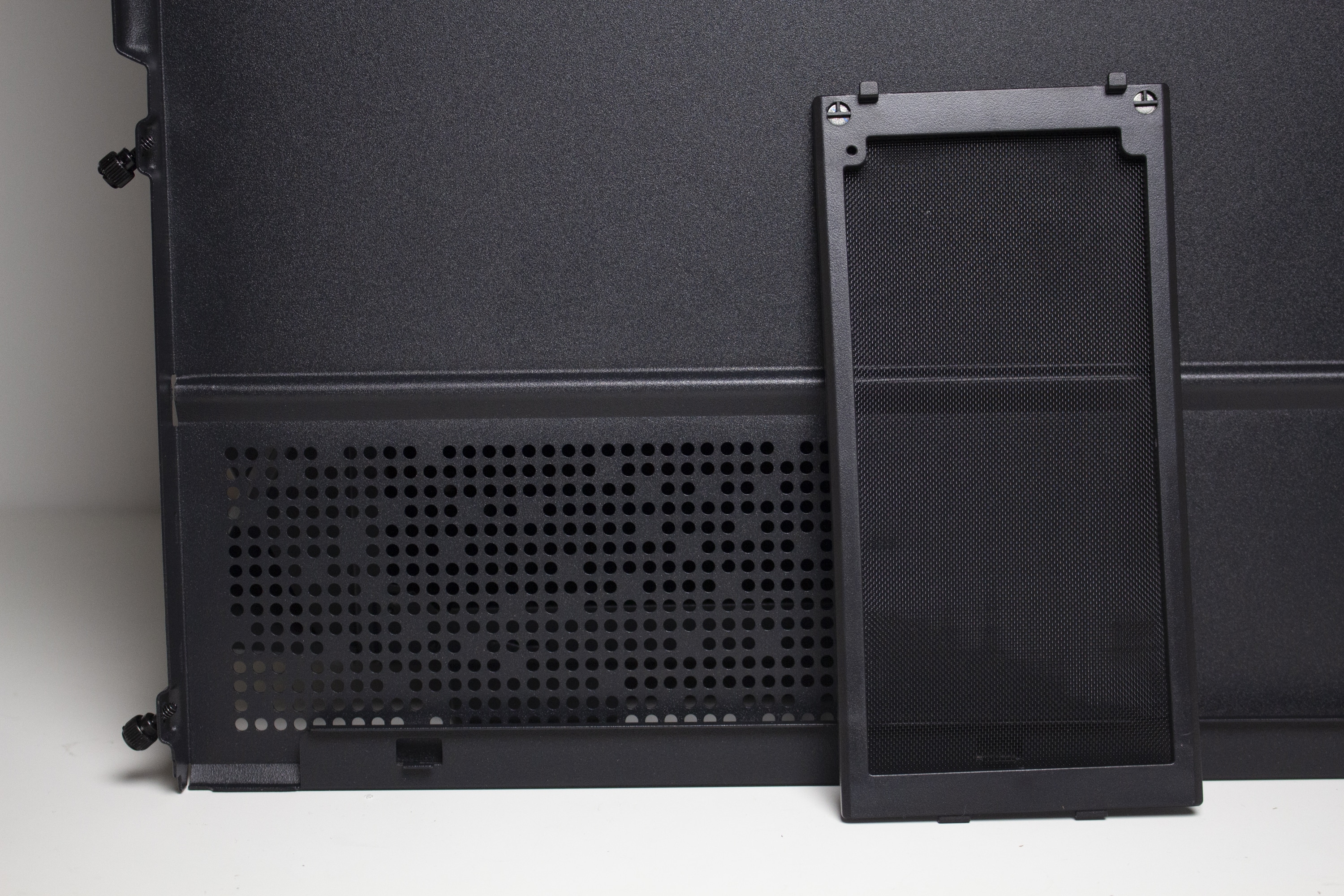 Das linke Seitenteil des Ceres 300 besteht aus einem 4 Millimeter starkem Hartglas, welches nur sehr leicht getönt wurde. Das Glas klebt dabei auf einem Stahlrahmen um die Montage des gesamten Panels zu vereinfachen. Befestigt werden muss es nämlich lediglich mit zwei Rändelschrauben an der Rückseite. Der untere Bereich der linken Seite besteht aus Stahl und verfügt über Belüftungsöffnungen im hinteren Bereich. Das rechte Seitenteil besteht klassisch aus Stahl und wird ebenfalls mithilfe von zwei Rändelschrauben montiert. Die Materialstärke wurde solide gewählt. Auch hier finden sich im unteren rechten Bereich Belüftungsöffnungen, die ab Werk beide mit einem kleinen magnetischen Staubfilterrahmen ausgestattet wurden.
