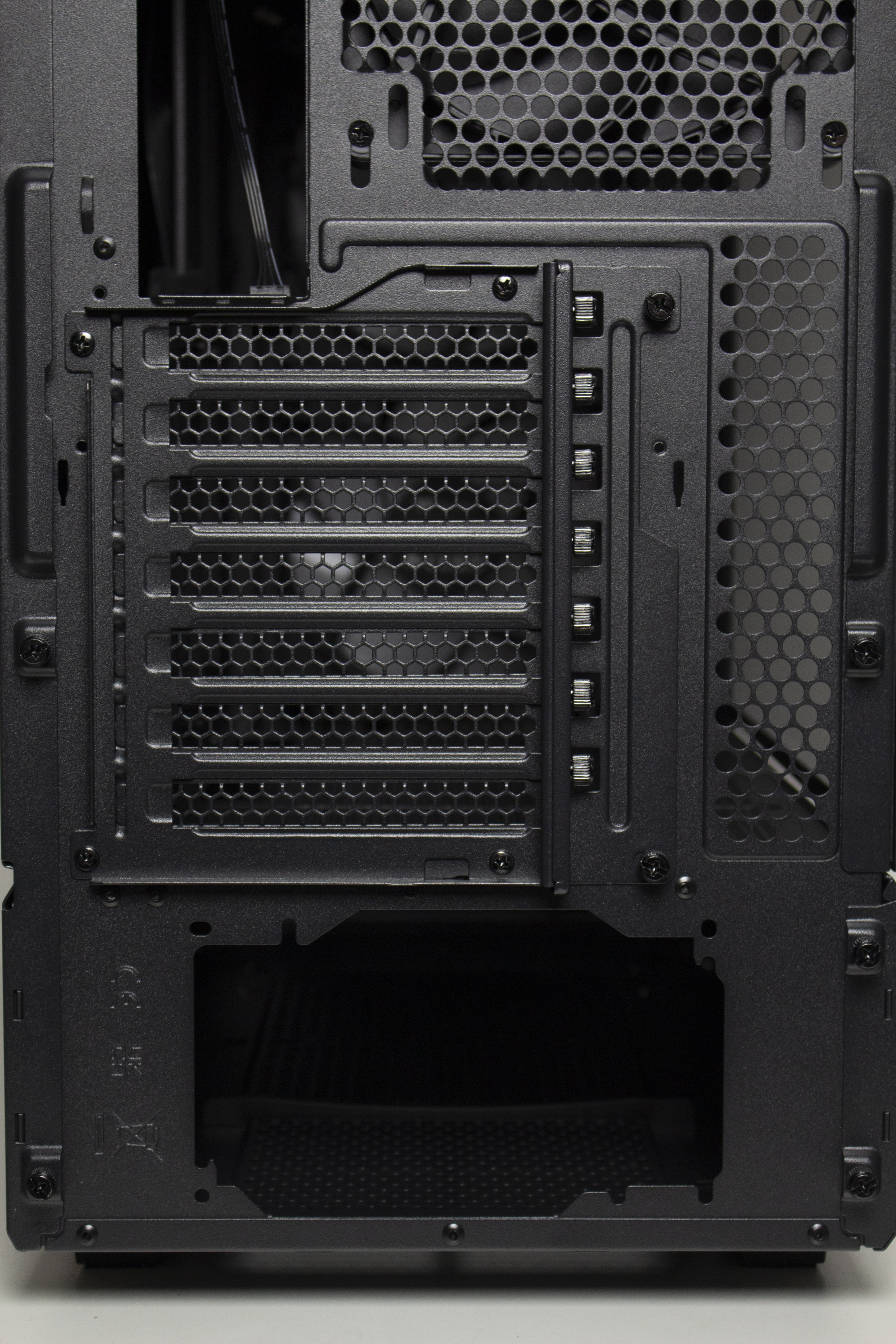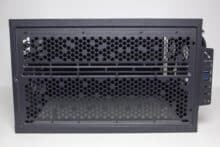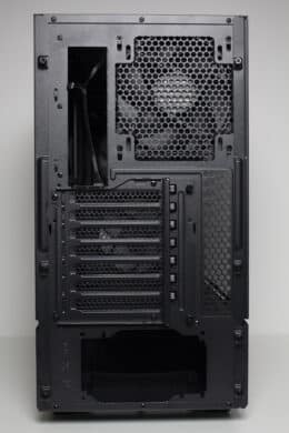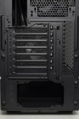 Besonders erwähnenswert ist an der Rückseite aber, dass sich mit der Entfernung weniger Schrauben der Slotblenden-Bereich um 90 Grad drehen lässt. Das ermöglicht die vertikale Befestigung einer Grafikkarte, wenn ein optionales Riser-Kabel vorhanden ist. Letzteres liegt dem Ceres 300 ab Werk nicht bei. Dennoch ist er sehr löblich, dass man für die vertikale Montage der Grafikkarte neben dem Riser-Kabel nicht zusätzlich noch einen entsprechenden Rahmen kaufen muss. Zudem ermöglicht die Umsetzung eine variable Platzierung der Grafikkarte.