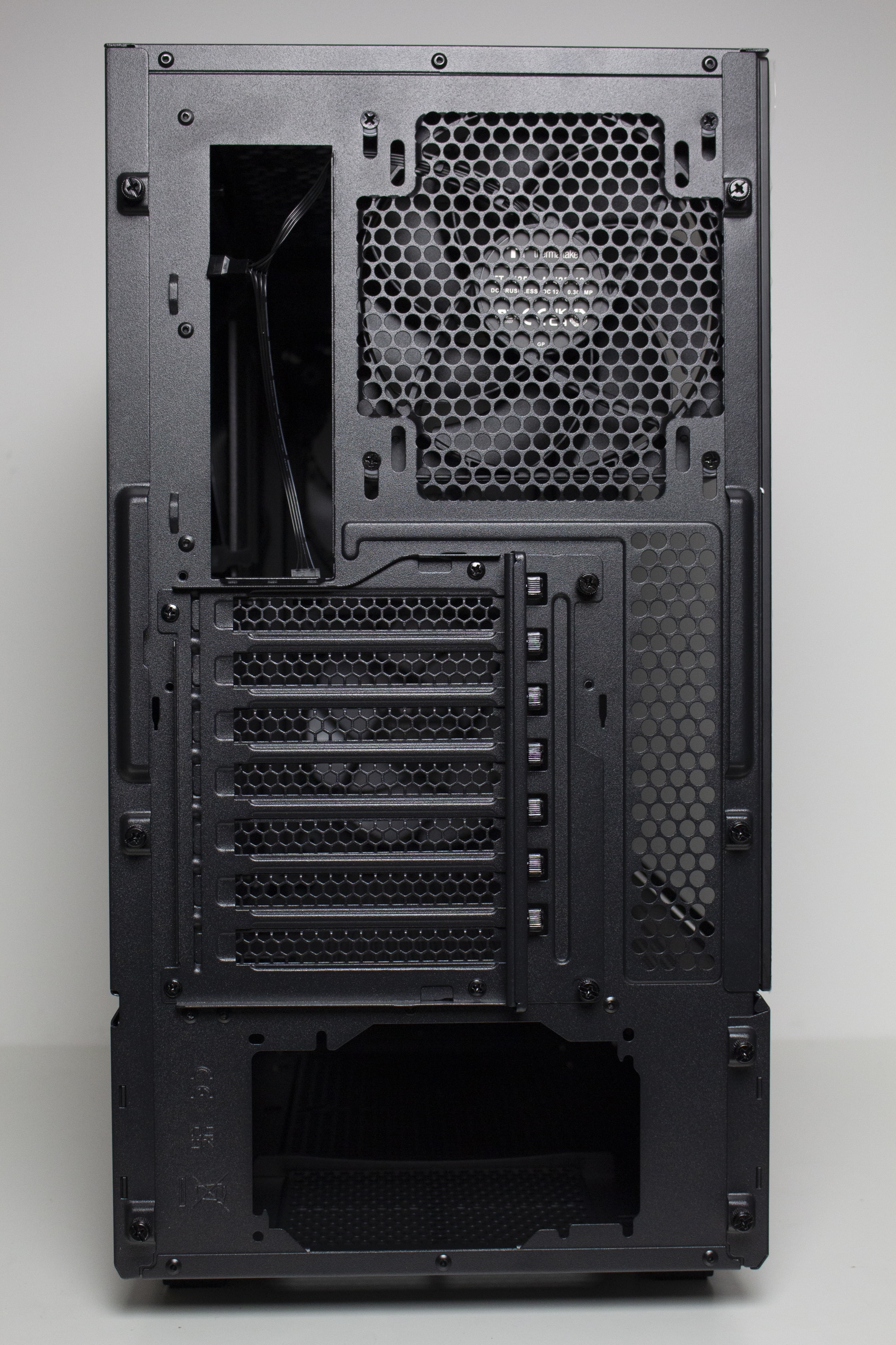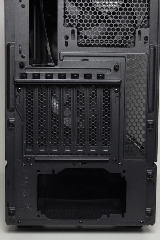Die Rückseite zeigt ein für Midi-Tower typisches Erscheinungsbild. Das Netzteil wird ganz unten platziert und darüber sind insgesamt sieben wiederverwendbare Slotblenden zu erkennen. Auch diese verfügen über zahlreiche Belüftungsöffnungen. Zur Befestigung kommen durchgehend Rändelschrauben zum Einsatz, die ab Werk allerdings sehr festgezogen wurden. Im oberen Bereich finden wir dann noch den Ausschnitt für das I/O-Shield des Mainboards sowie den dritten 140-mm-Lüfter. Am Heck hat Thermaltake jedoch auf eine ARGB-Beleuchtung des Lüfters verzichtet.