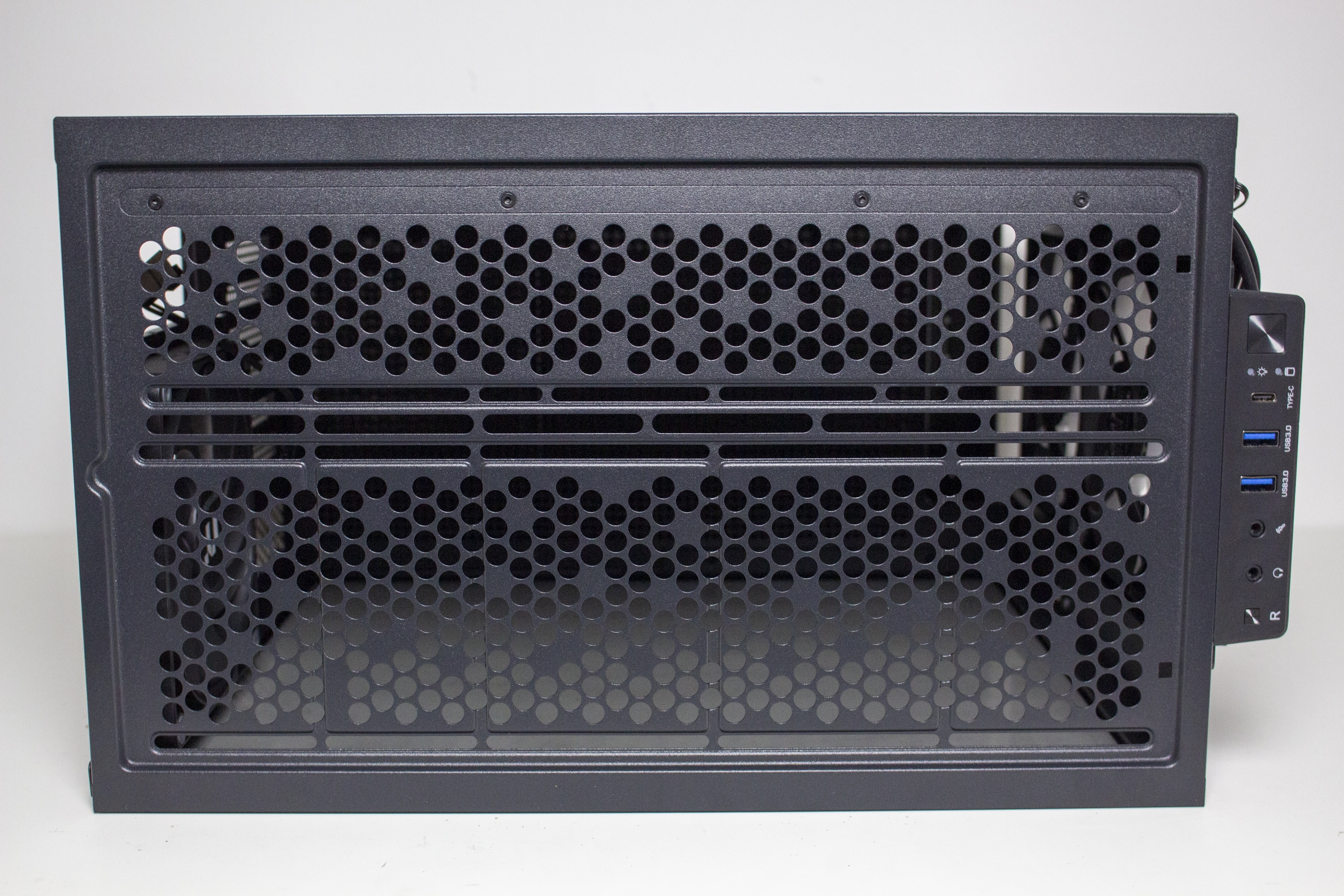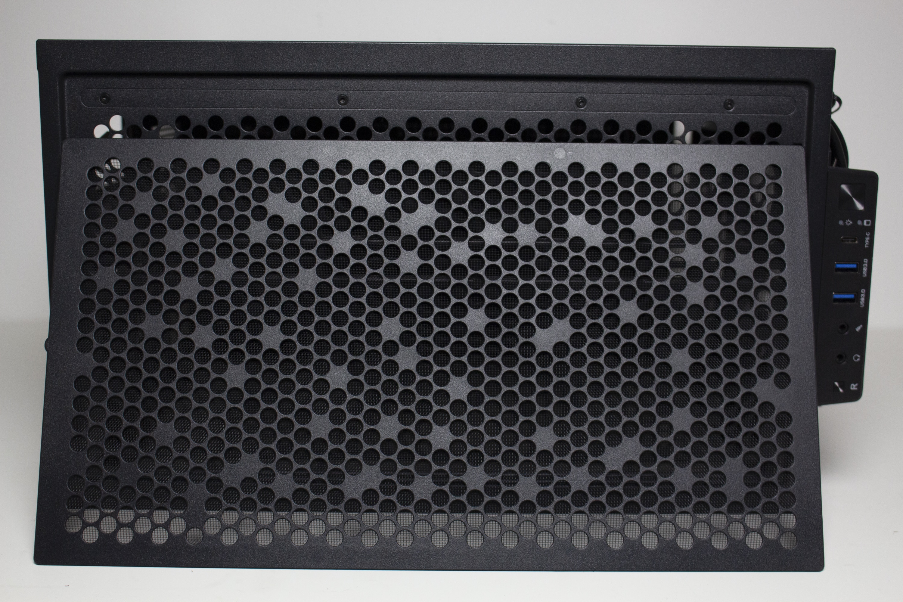Zur Vereinheitlichung der Optik platziert Thermaltake über dem Gitter eine gelochte Kunststoffblende mit eingebauten Staubfilter, welche über dasselbe Design wie das Frontpanel verfügt. Auch hier kommen Magnete für die Befestigung zum Einsatz. Weiterhin setzt Thermaltake das I/O-Panel in den vorderen Bereich des Deckels. Es bietet ein USB-C 3.2- sowie zwei USB-A 3.0-Ports und einen HD-Audio-Comboport. Natürlich gibt es hier auch einen Power- und Reset-Button.