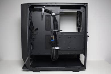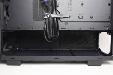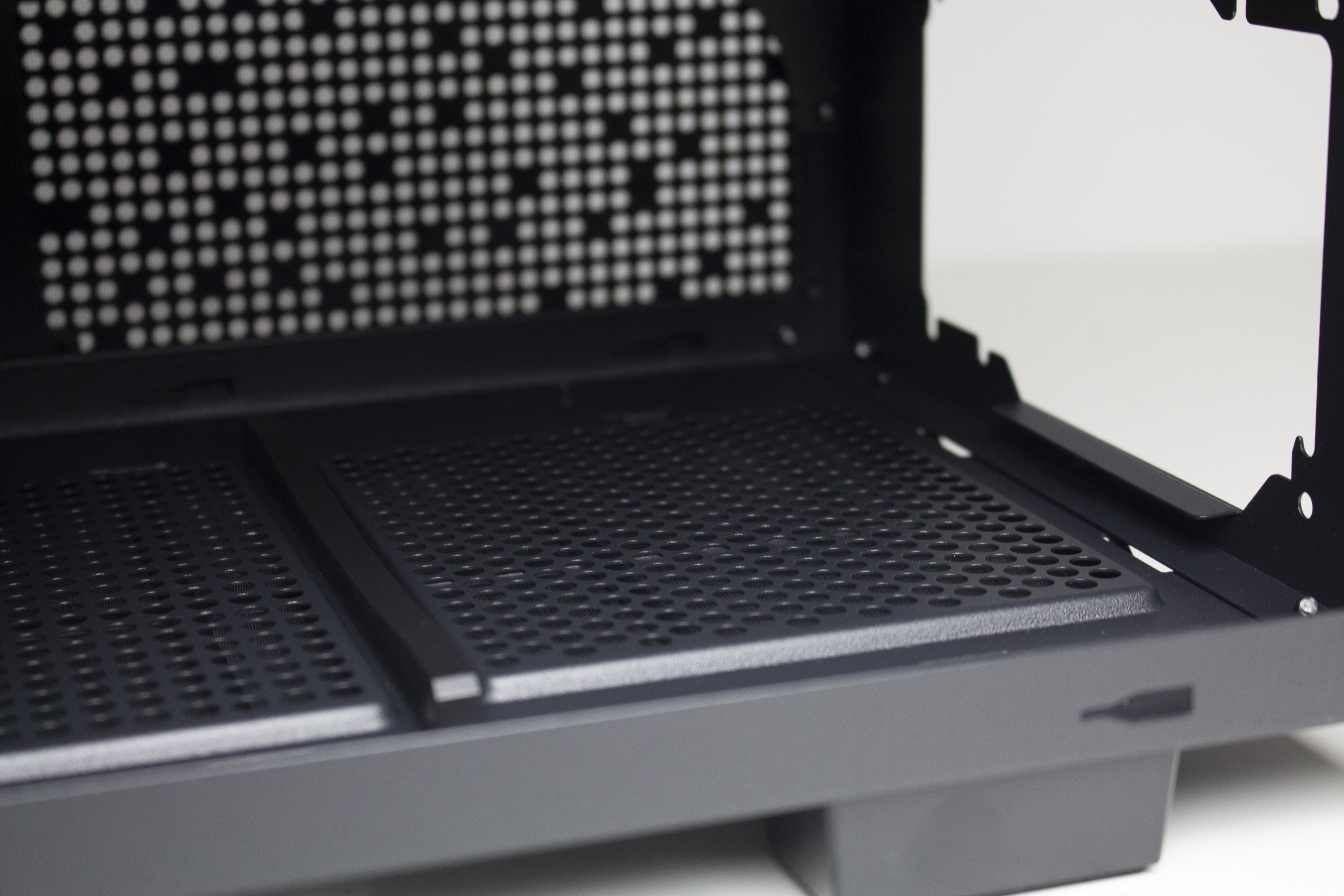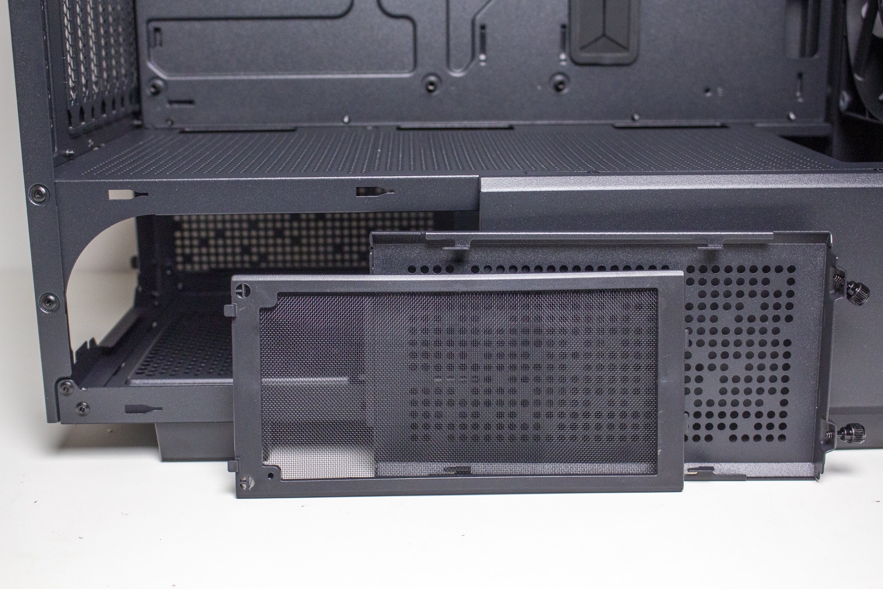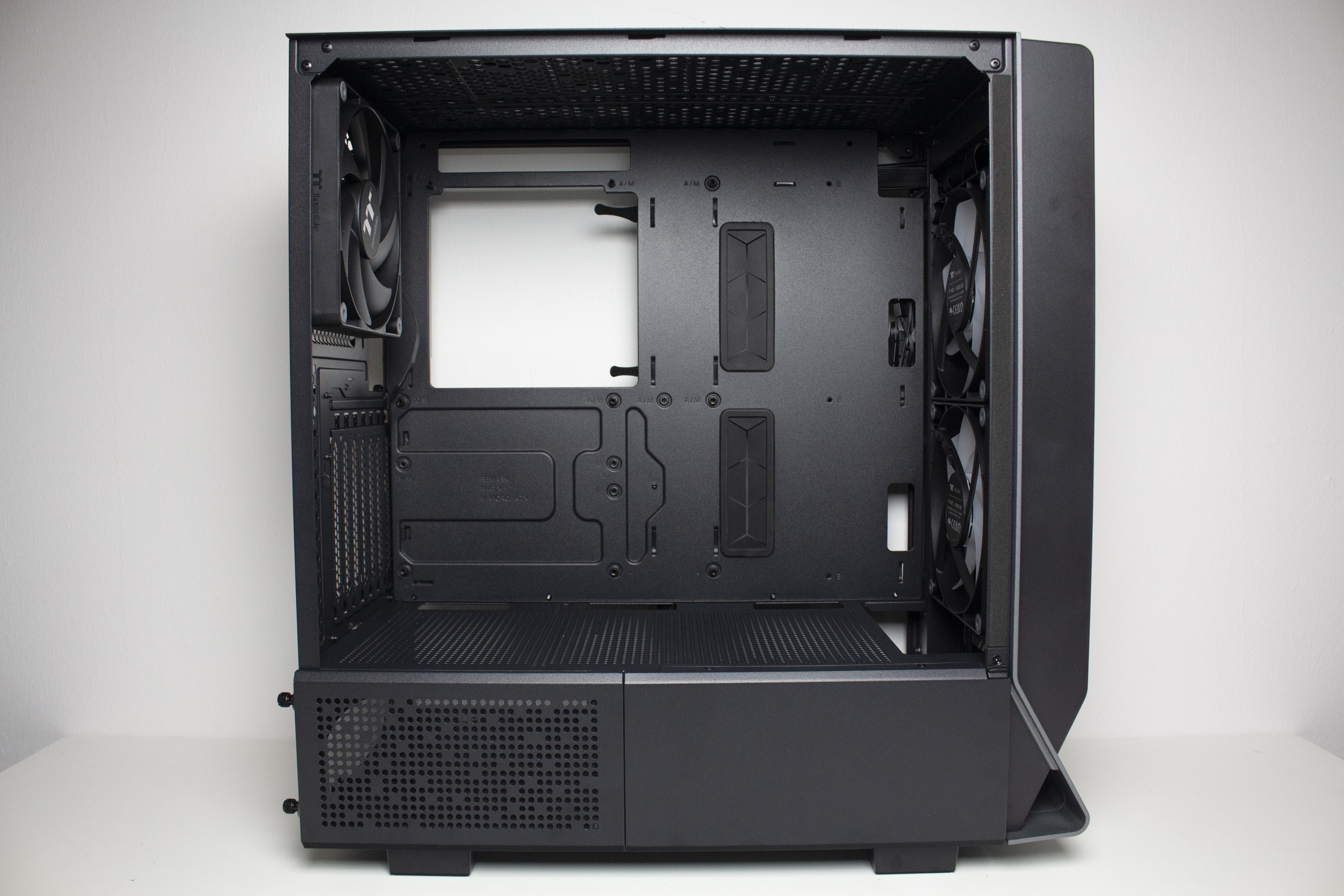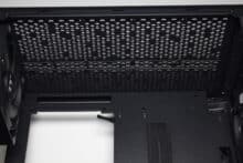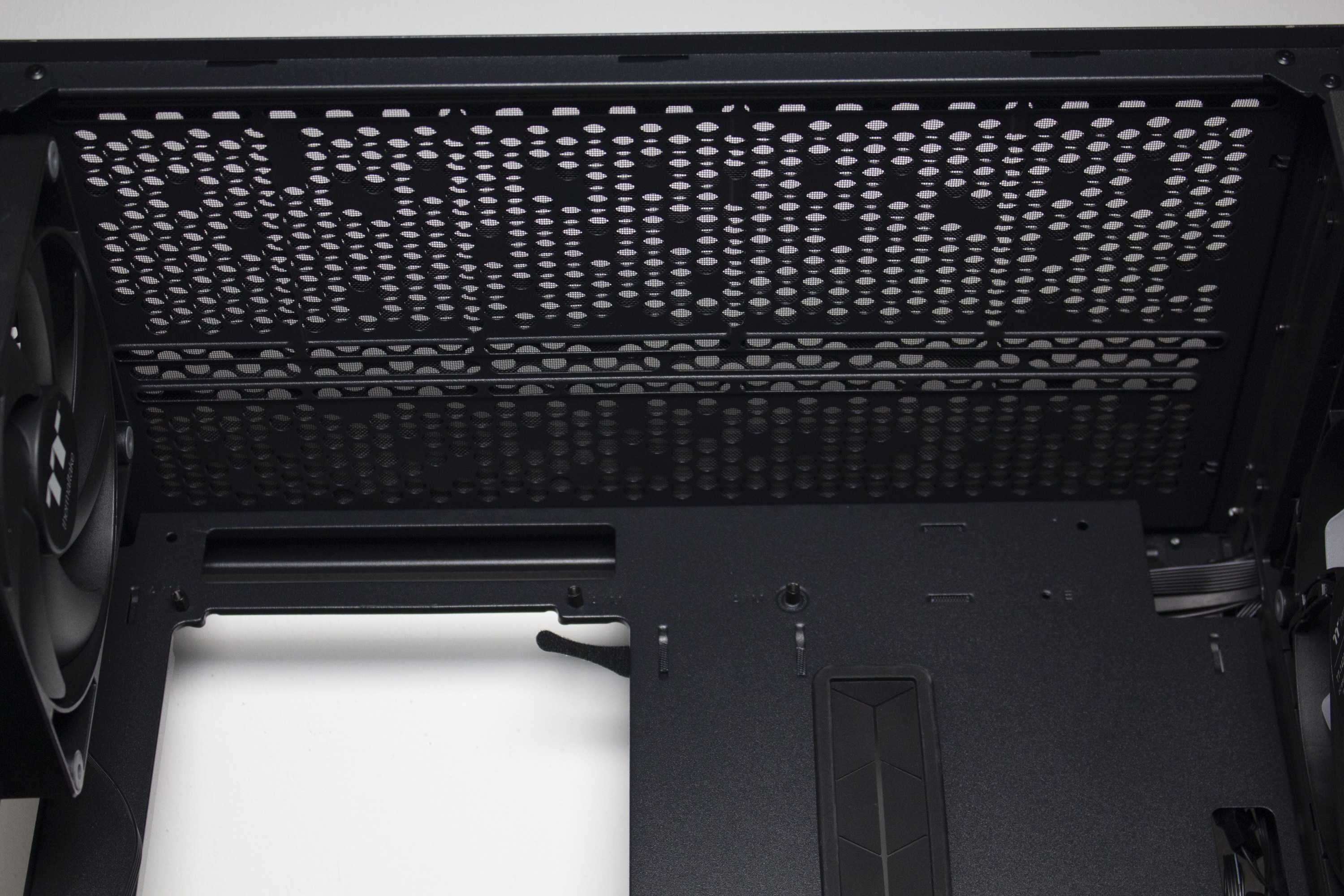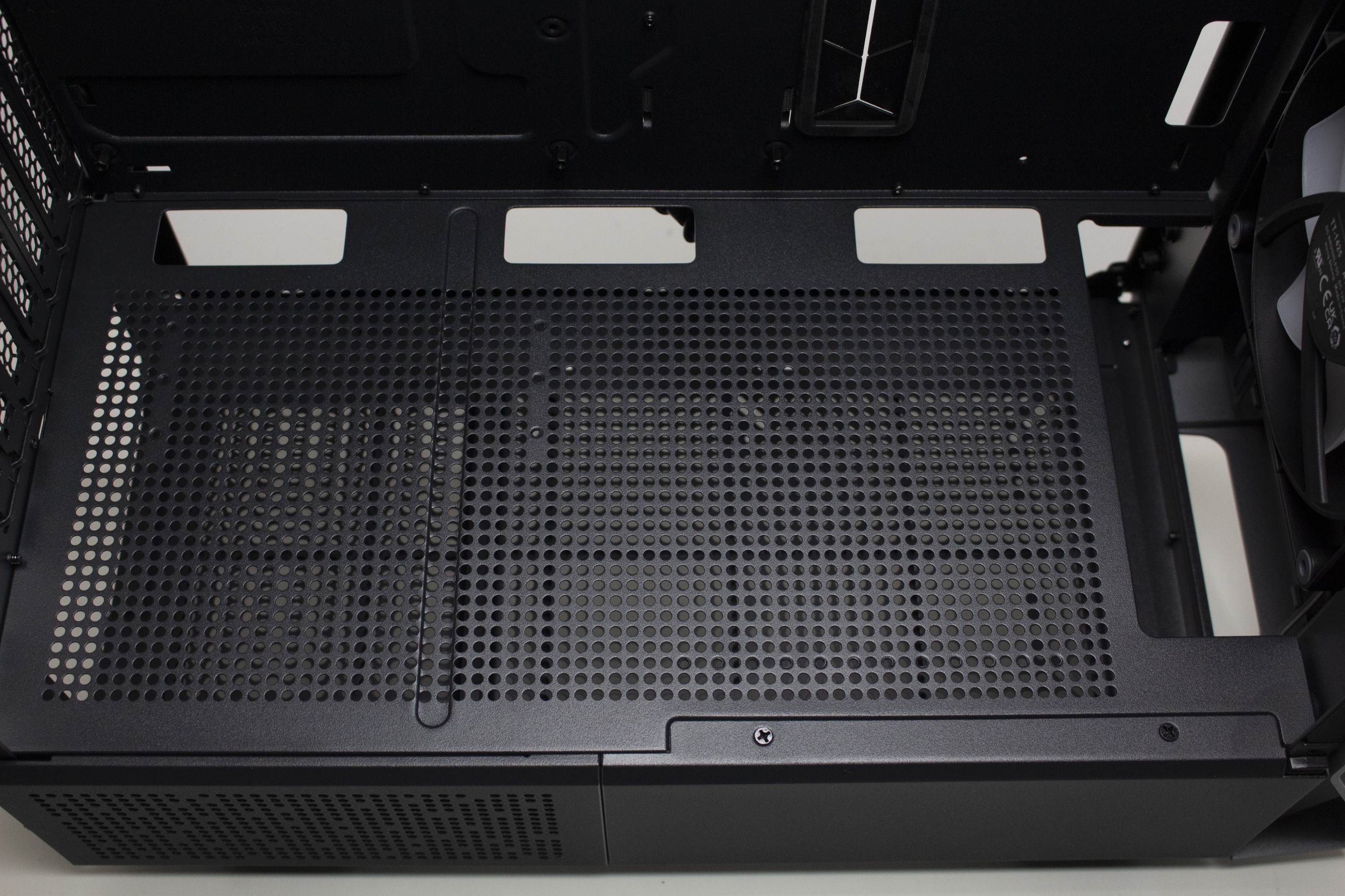 Wie man bereits von außen vermuten konnte, erfolgt die Unterteilung der zwei Kammern mithilfe einer Netzteilabdeckung. Diese überspannt fast den gesamten unteren Bereich, verfügt aber über ein großflächiges Belüftungsgitter und drei Kabelmanagementöffnungen. Zur Front hin lässt sich zudem ein Ausschnitt erkennen, welcher die Montage eines 360-mm-Radiators ermöglichen soll.