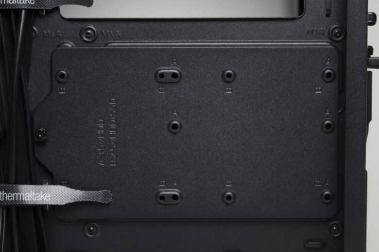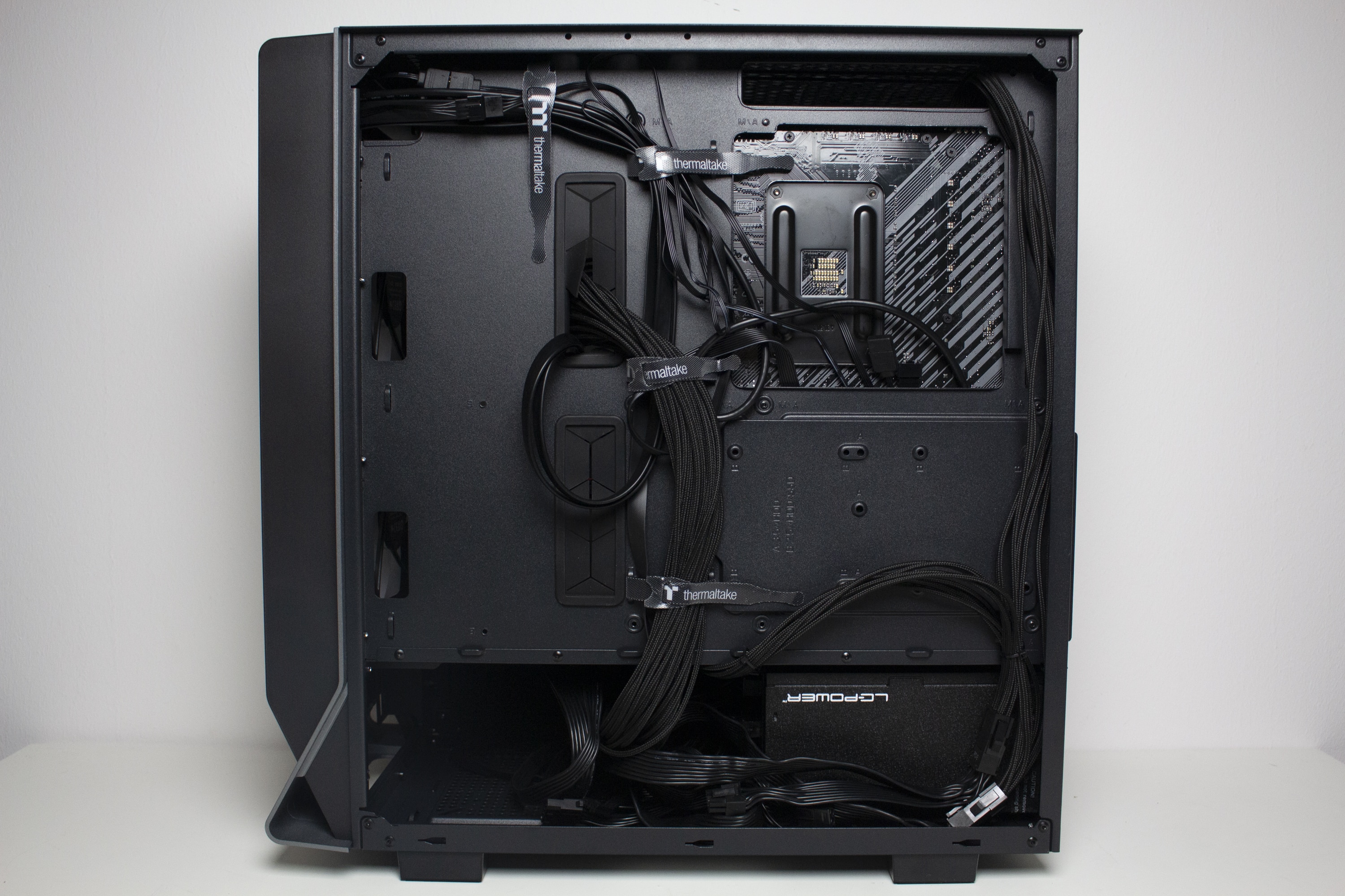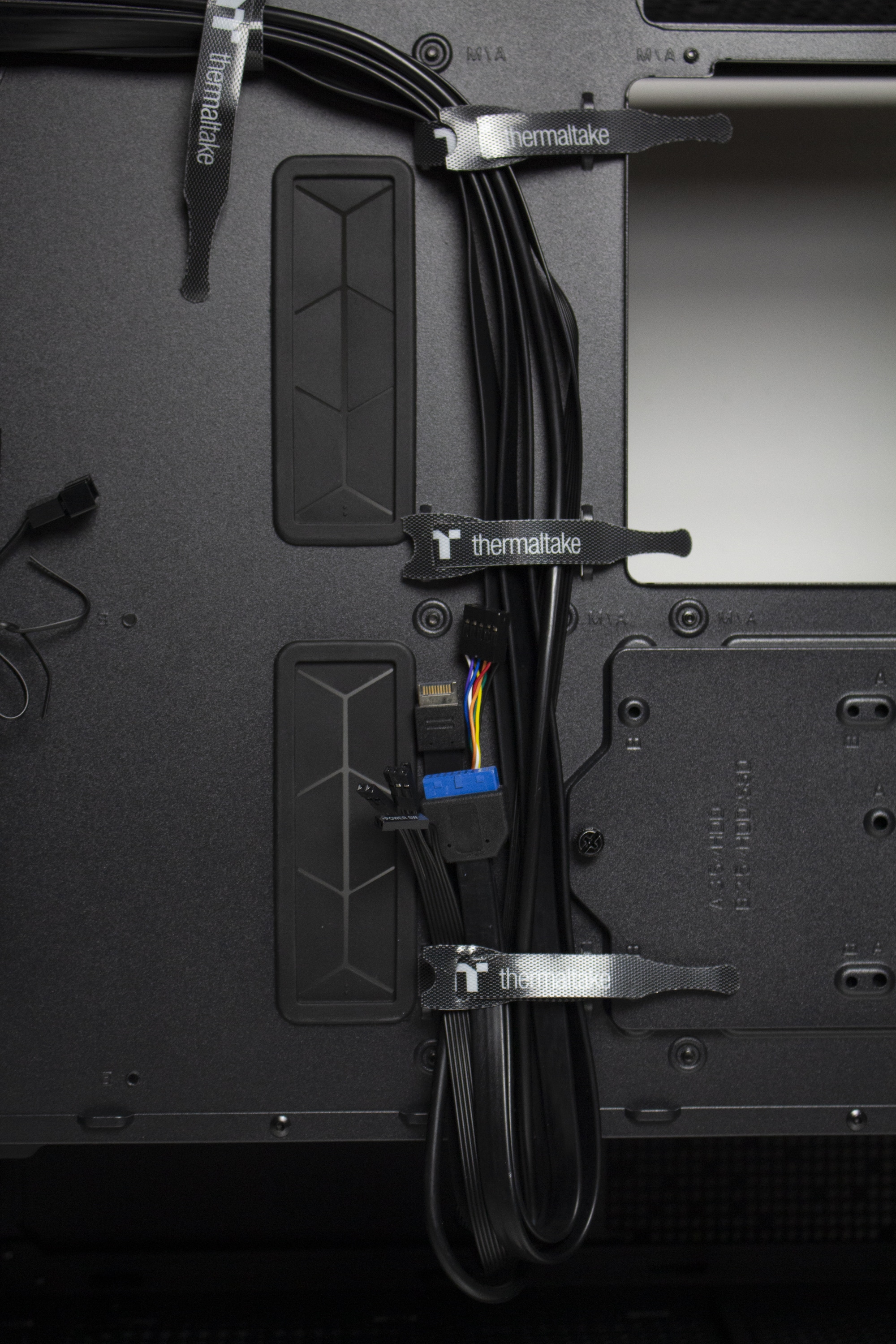 Da das Mainboard-Tray plan gestaltet wurde, gibt es an der Rückseite logischerweise keine Ausbuchtungen oder einen speziellen Kabelkanal. Dennoch gibt es hier mit circa 26 Millimetern reichlich Platz für Kabel. Zusätzlich verbaut Thermaltake vier wiederverwendbare Kabelbinder mit Klettverschluss um alle Kabel einfach verzurren zu können. Weiterhin gibt es natürlich auch herkömmliche Stahlösen für normale Kabelbinder. Beide sollten im Zusammenspiel für eine vernünftige Bündelung der Kabel und somit für ein ordentliches Erscheinungsbild sorgen.