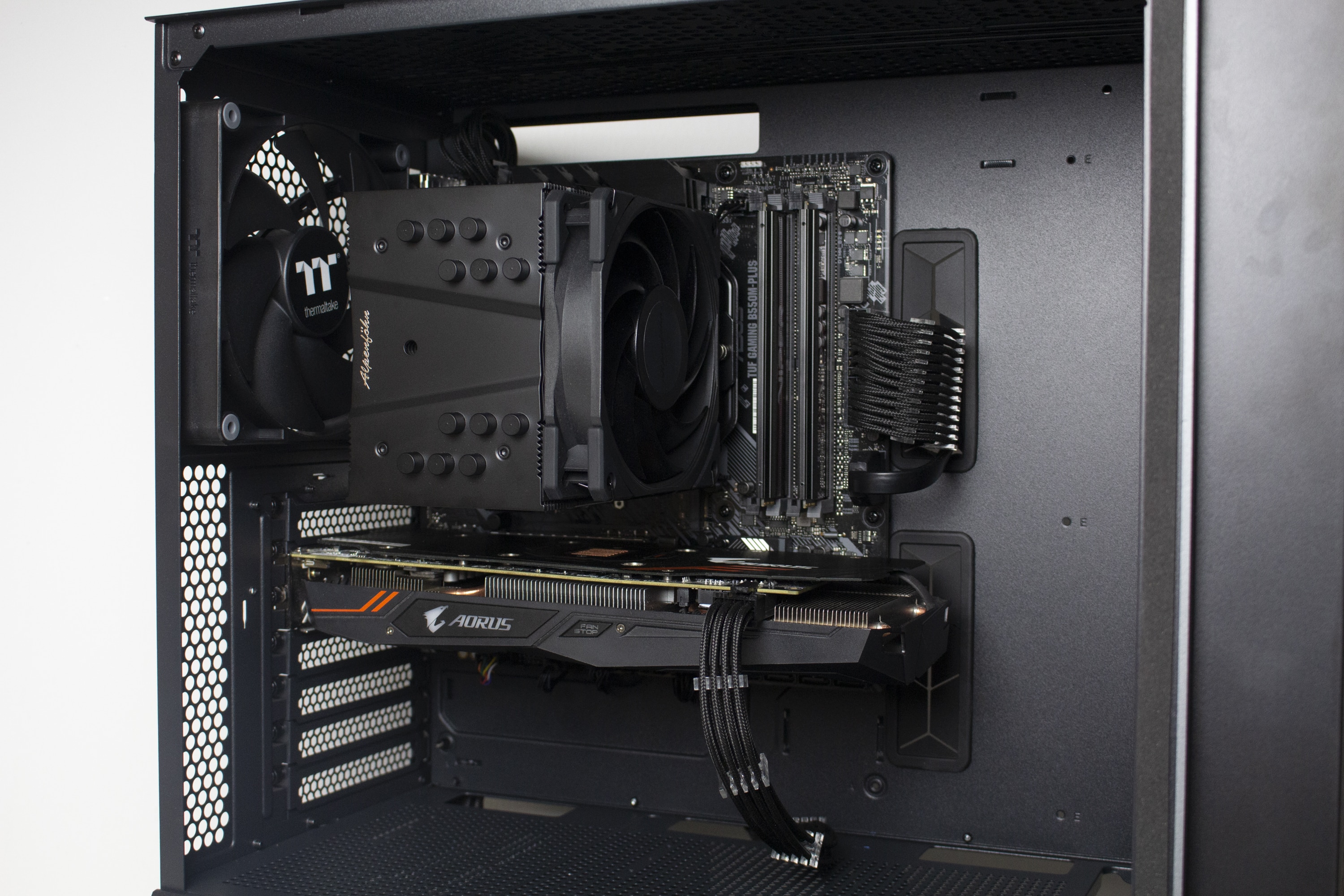 Nun kommen wir zum Systemeinbau beim Thermaltake Ceres 300 TG ARGB Test. Als Hardware verwenden wir einen AMD Ryzen 5 1400* auf einem ASUS TUF Gaming B550M-Plus* mit 16GB Crucial Ballistix Sport LT grau DDR4-2666*. Der Ryzen wird von einem Alpenföhn Brocken 4* gekühlt und ist auf 3,8 GHz (1,175 V) übertaktet. Für die Bildausgabe ist eine Gigabyte AORUS GTX 1060 6GB zuständig. Die Stromversorgung erledigt das vollmodulare LC-Power LC550 V2.31 Platinum*.