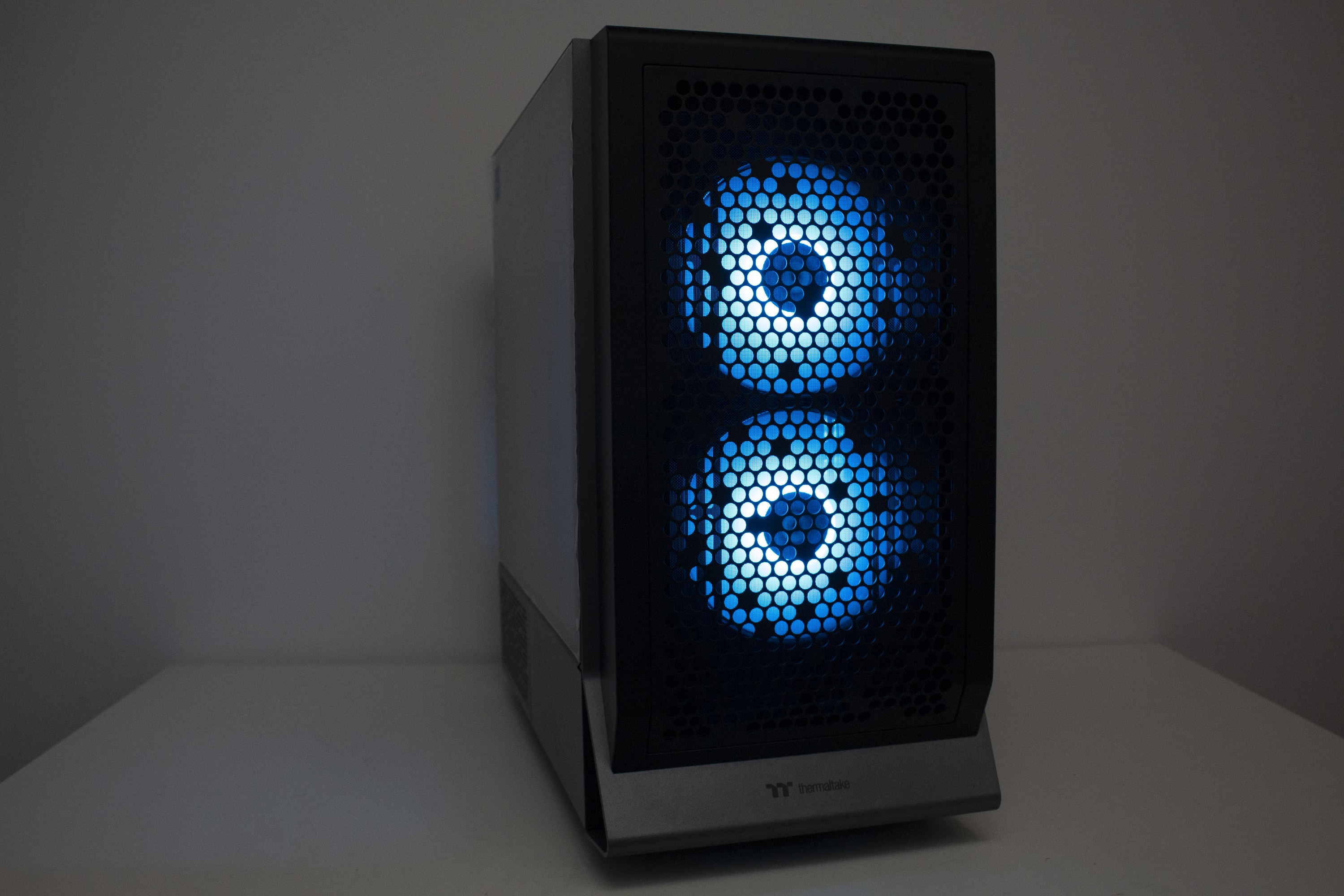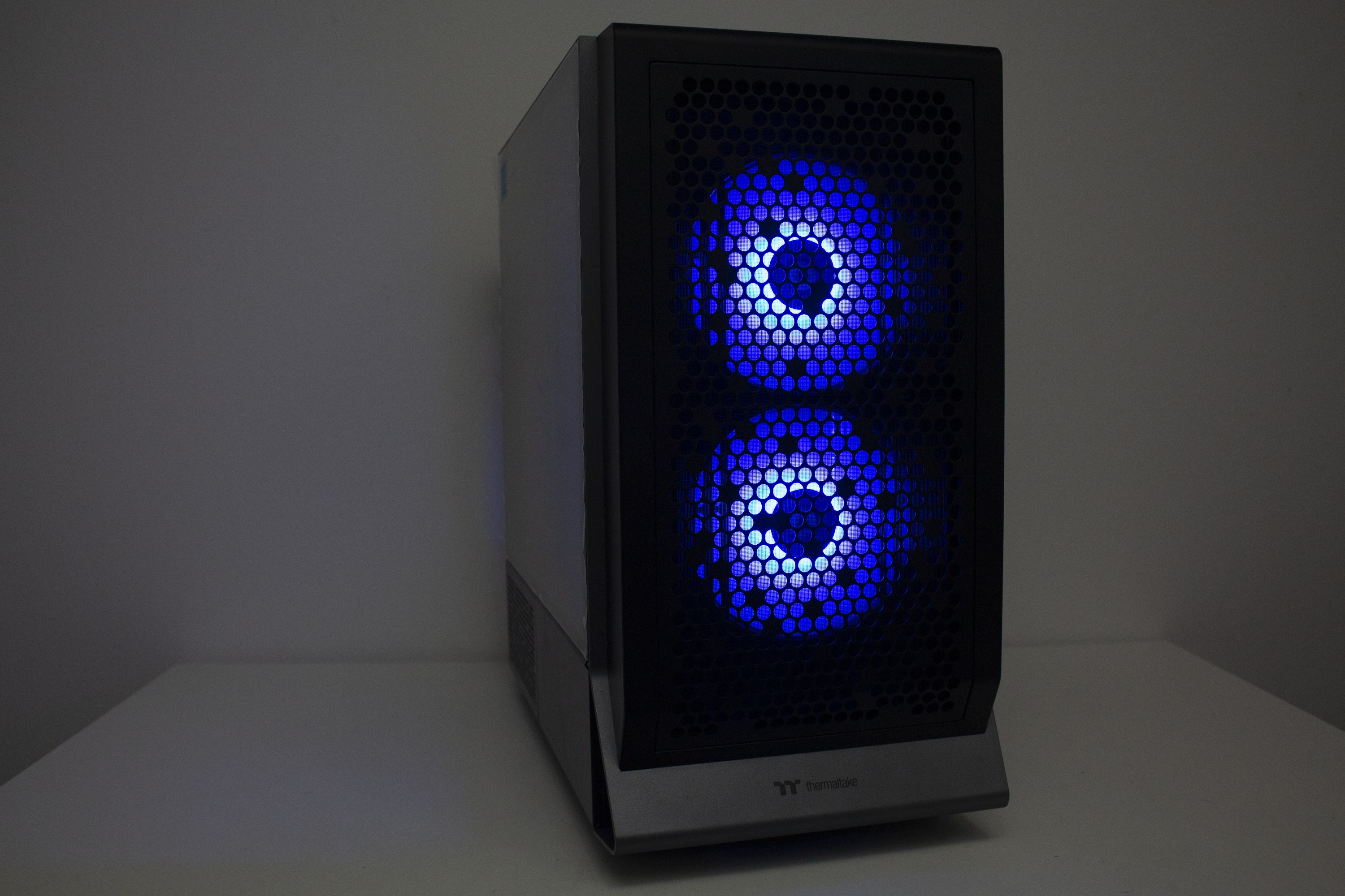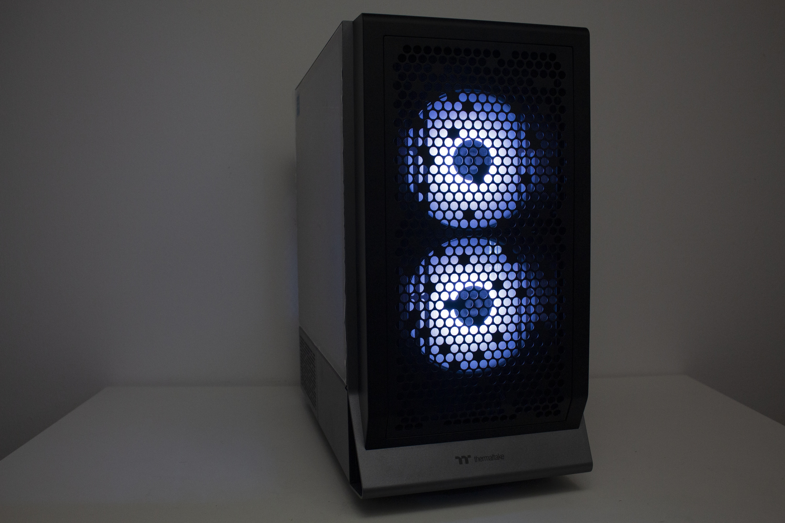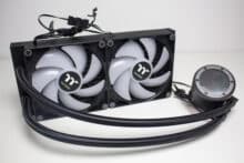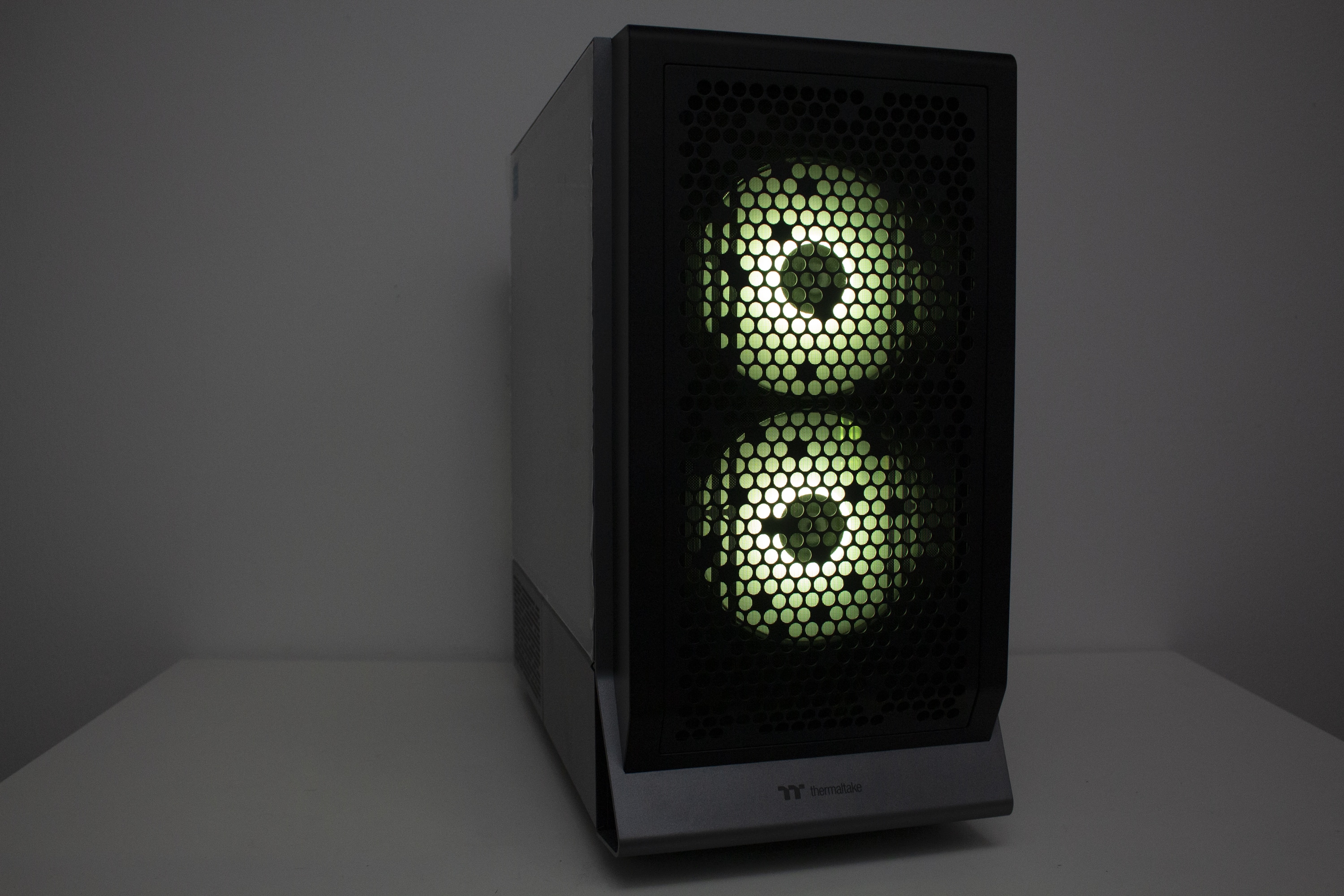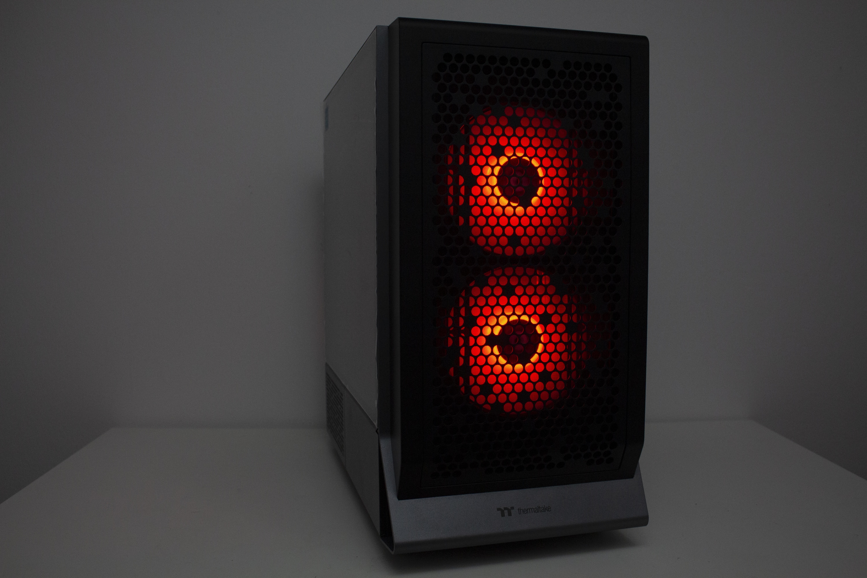 Zusätzlich wurde uns für den Test die neue TH280 V2 ARGB AiO-Wasserkühlung von Thermaltake zur Verfügung gestellt. Diese verfügt über einen 280-mm-Radiator, beleuchtete ARGB-Lüfter (CT140 ARGB) und einen Pumpenblock mit dem beleuchteten Hersteller-Logo sowie Infinity-Spiegel-Optik. Zur Veranschaulichung wurde der Radiator im Deckel befestigt und mit den vorinstallierten ARGB-Lüftern gekoppelt. Der spätere Belastungstest wurde jedoch mit einem Luftkühler durchgeführt. Einen ausführlichen Test zur Thermaltake TH280 V2 ARGB findet ihr bald hier auf dem Blog.