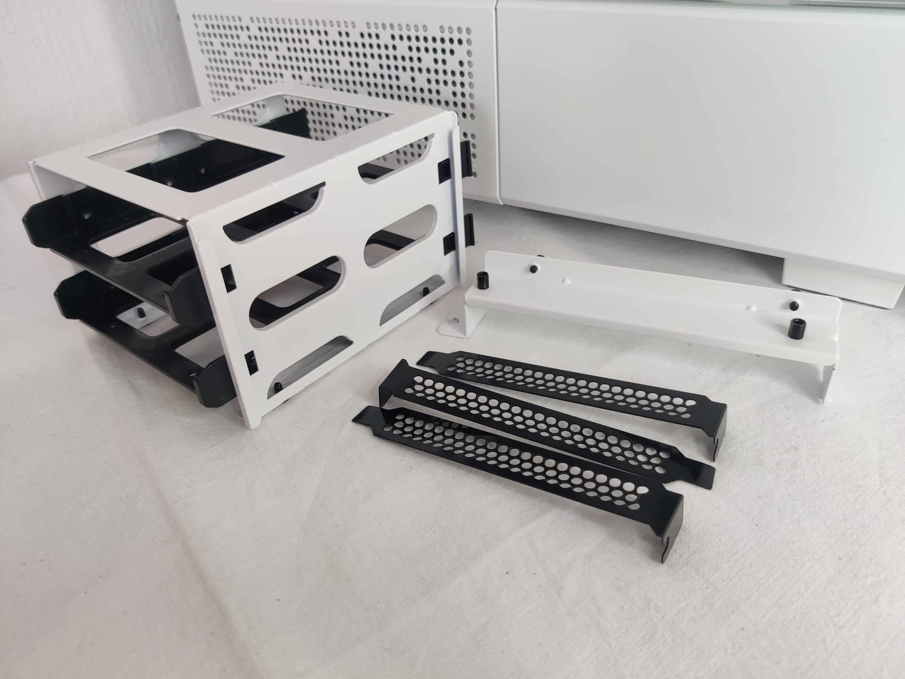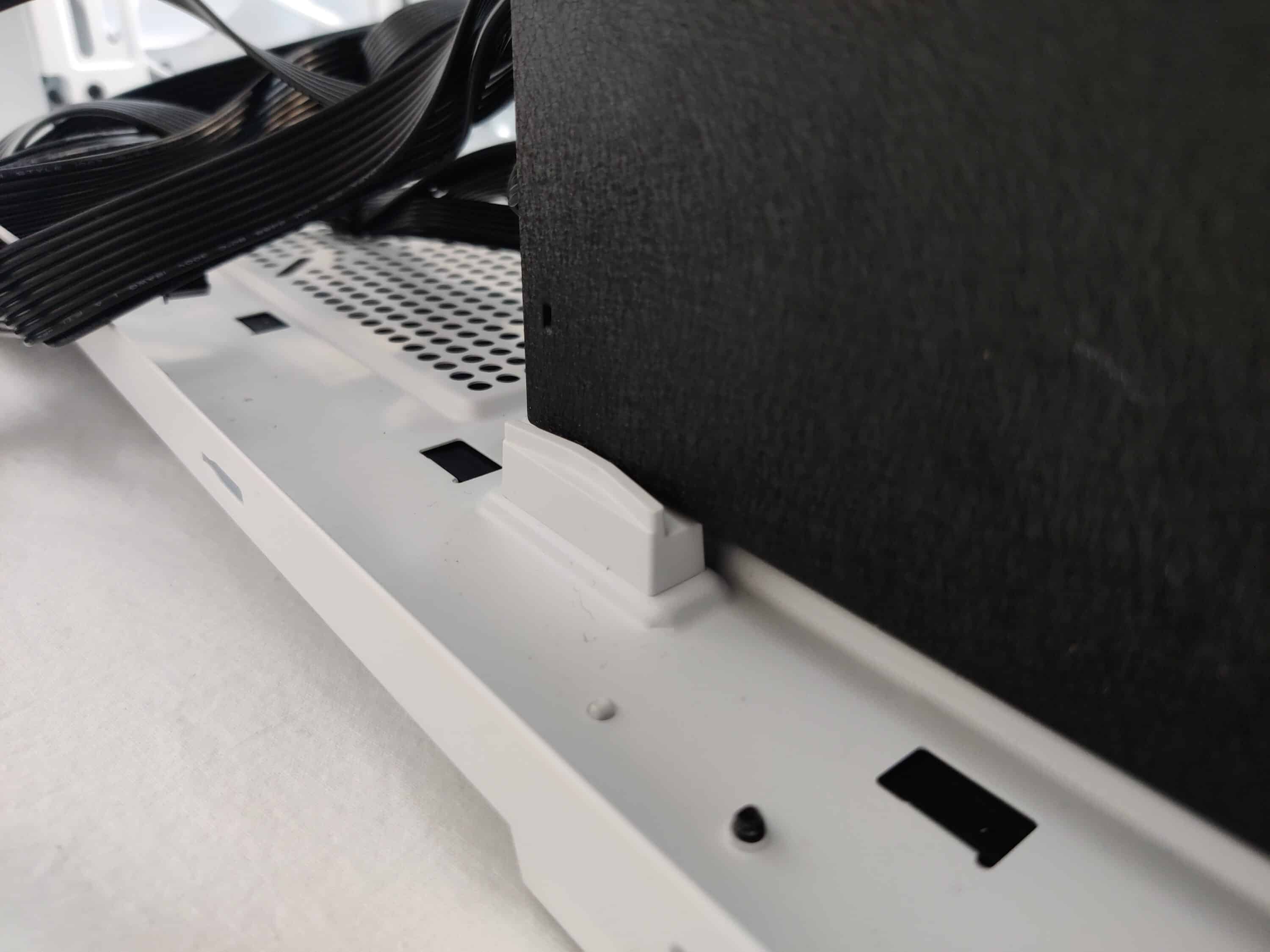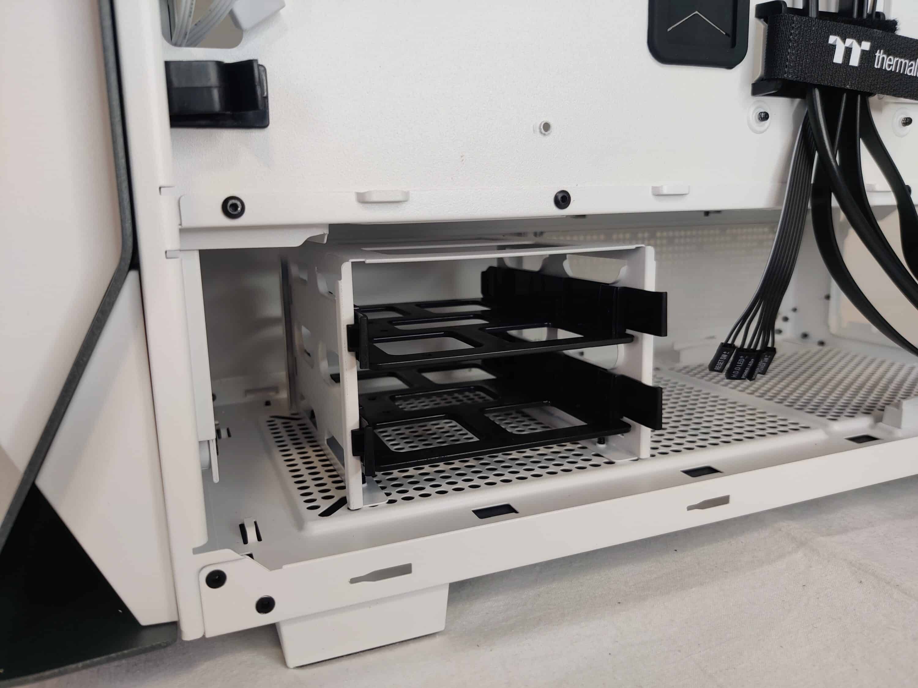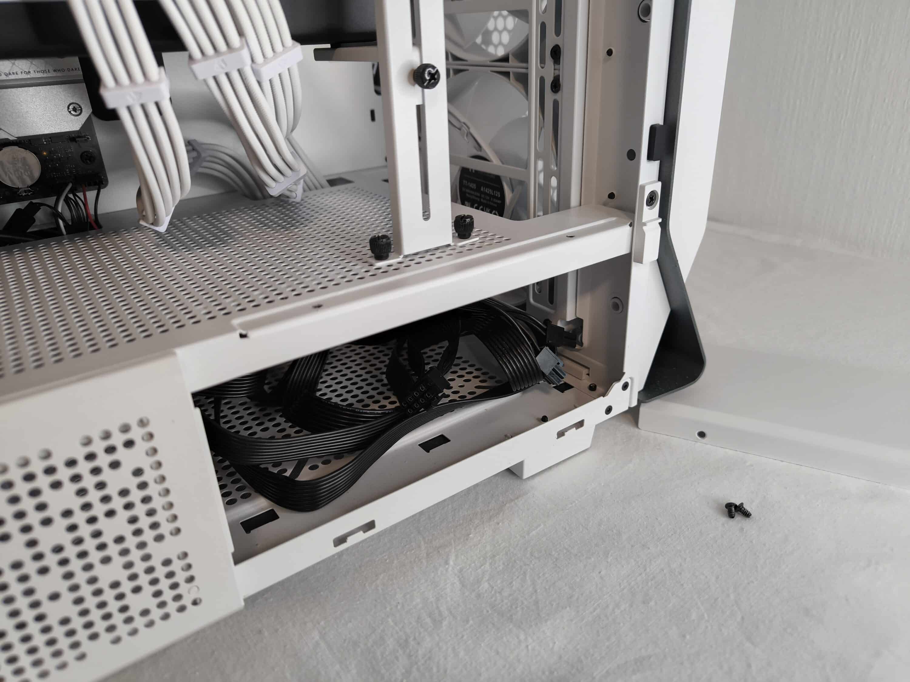 Ebenfalls positiv hervorzuheben ist, dass man nach dem Einbau aller Komponenten trotzdem von beiden Seiten das Netzteil aus erreichen kann. Dies vereinfacht das nachträgliche Einfügen von Kabeln enorm, sodass ein meist nervenaufreibender Arbeitsschritt im Aufrüstungsfall ausbleibt. Zudem liegt das Netzteil im Gegensatz zu anderen Gehäusen nicht direkt auf dem SPCC-Stahl auf, sondern wird über ein leicht erhöhtes Einschubfach versenkt. Das HDD-Tray ist vormontiert, was allerdings recht simpel durch Entfernen von mehreren Schrauben auf der Unterseite herausgenommen werden kann.