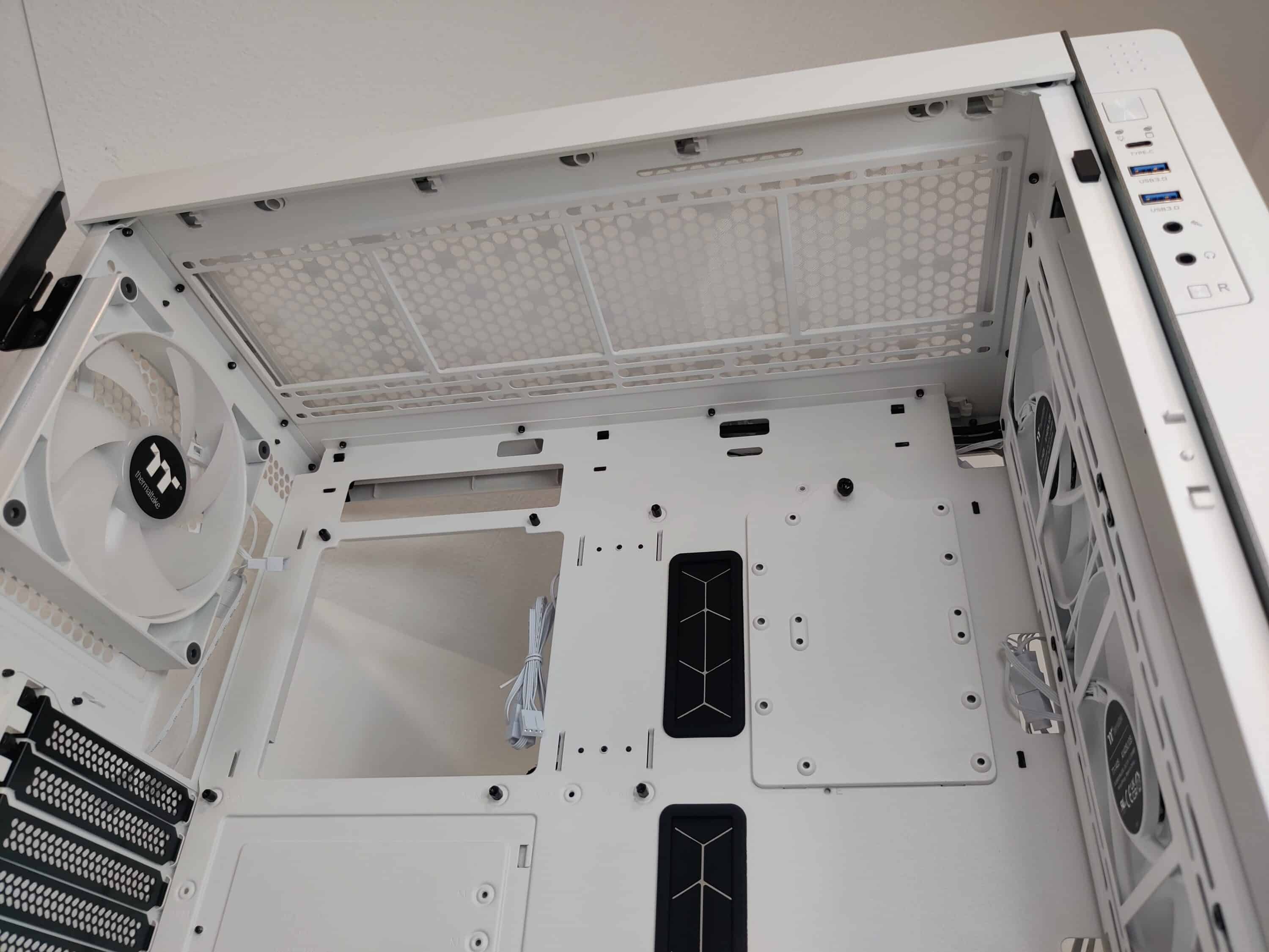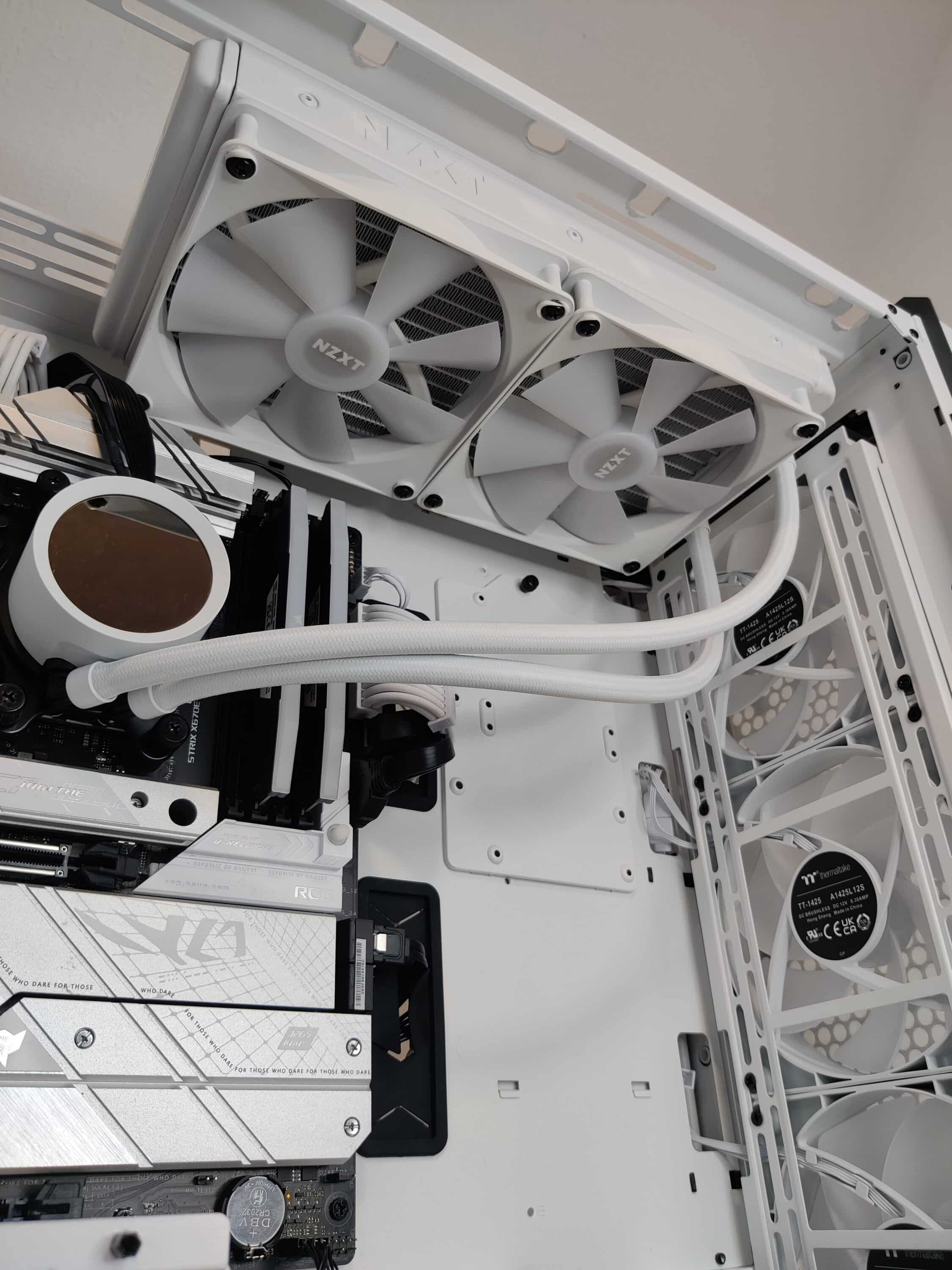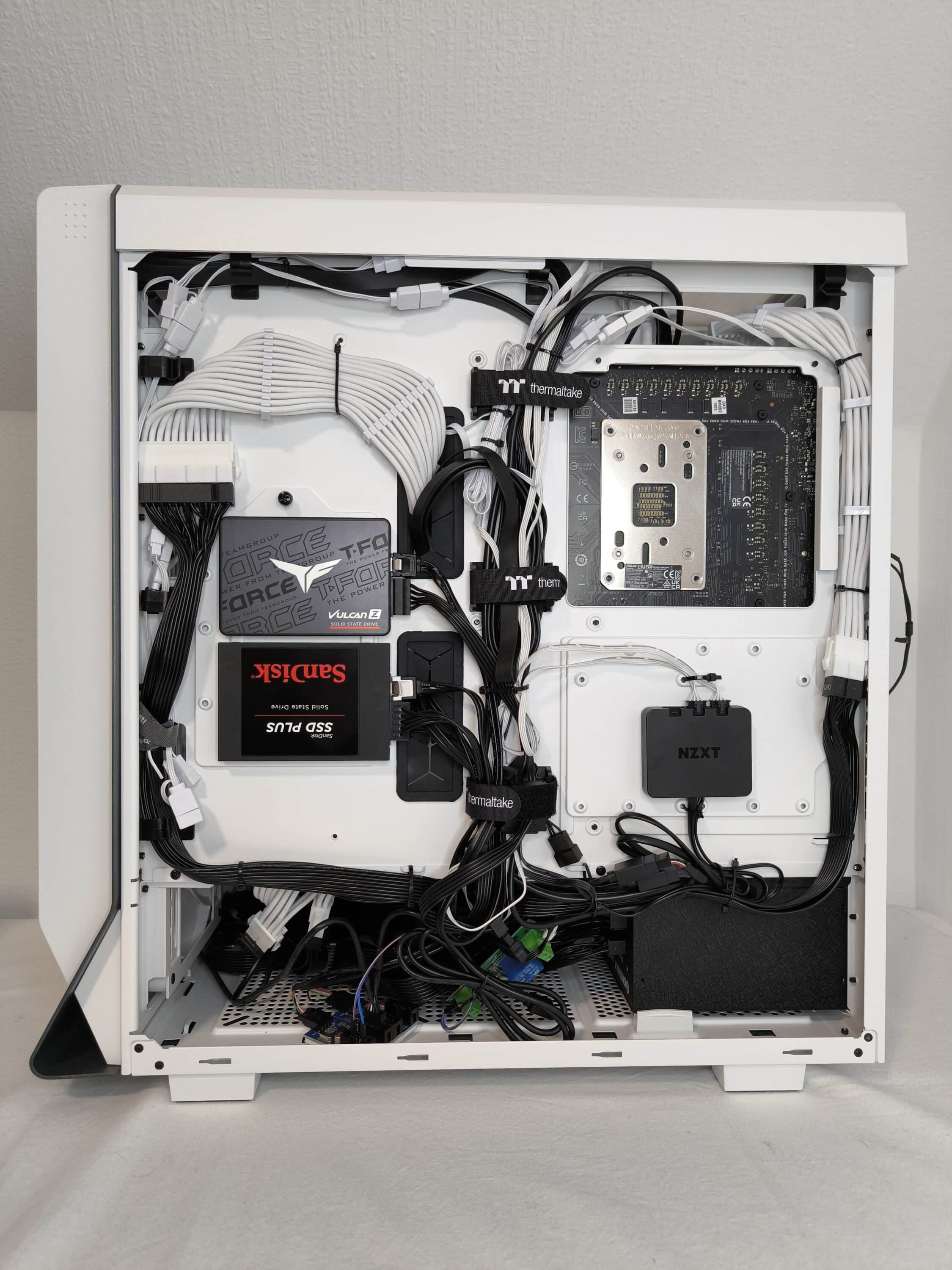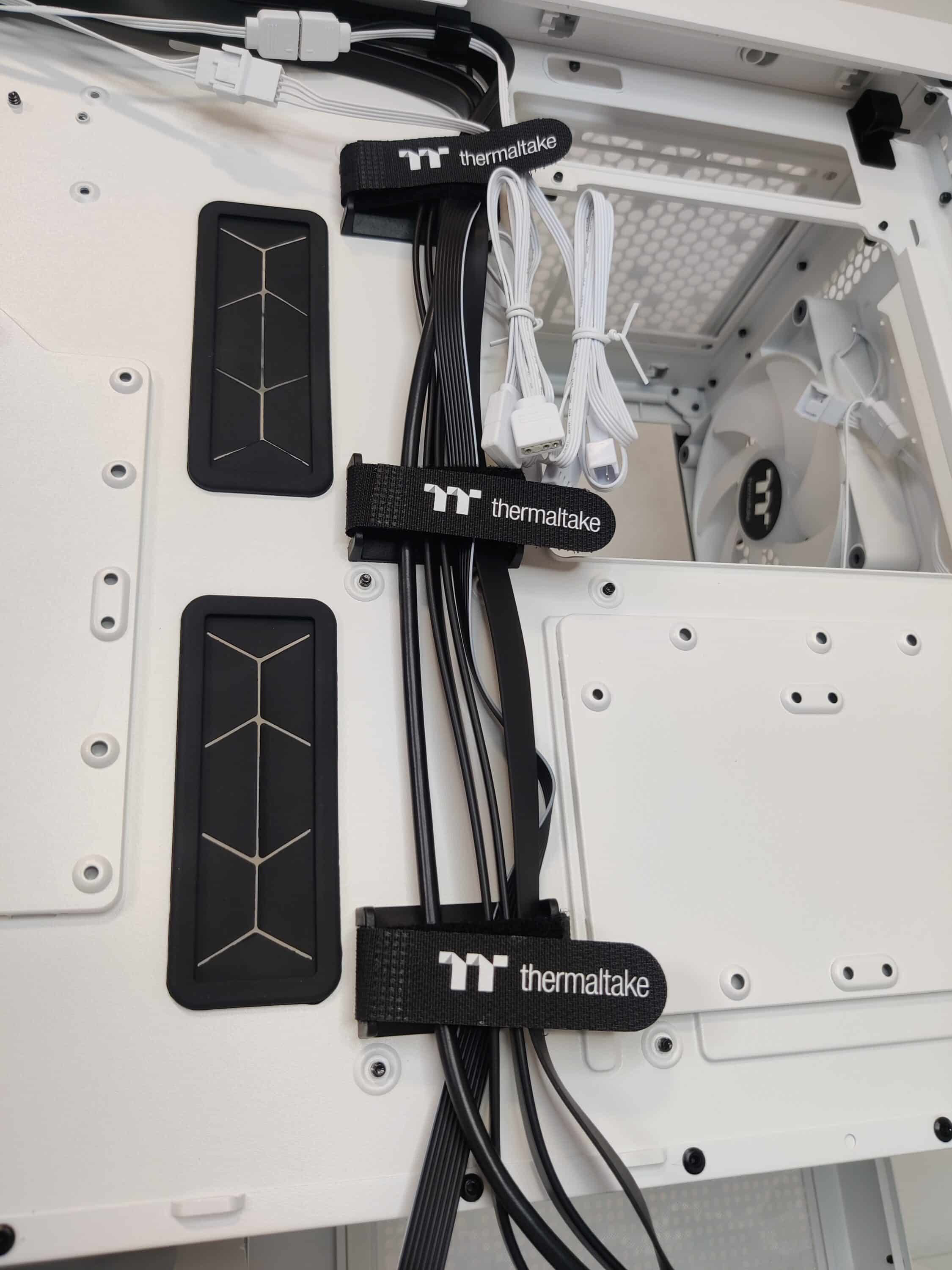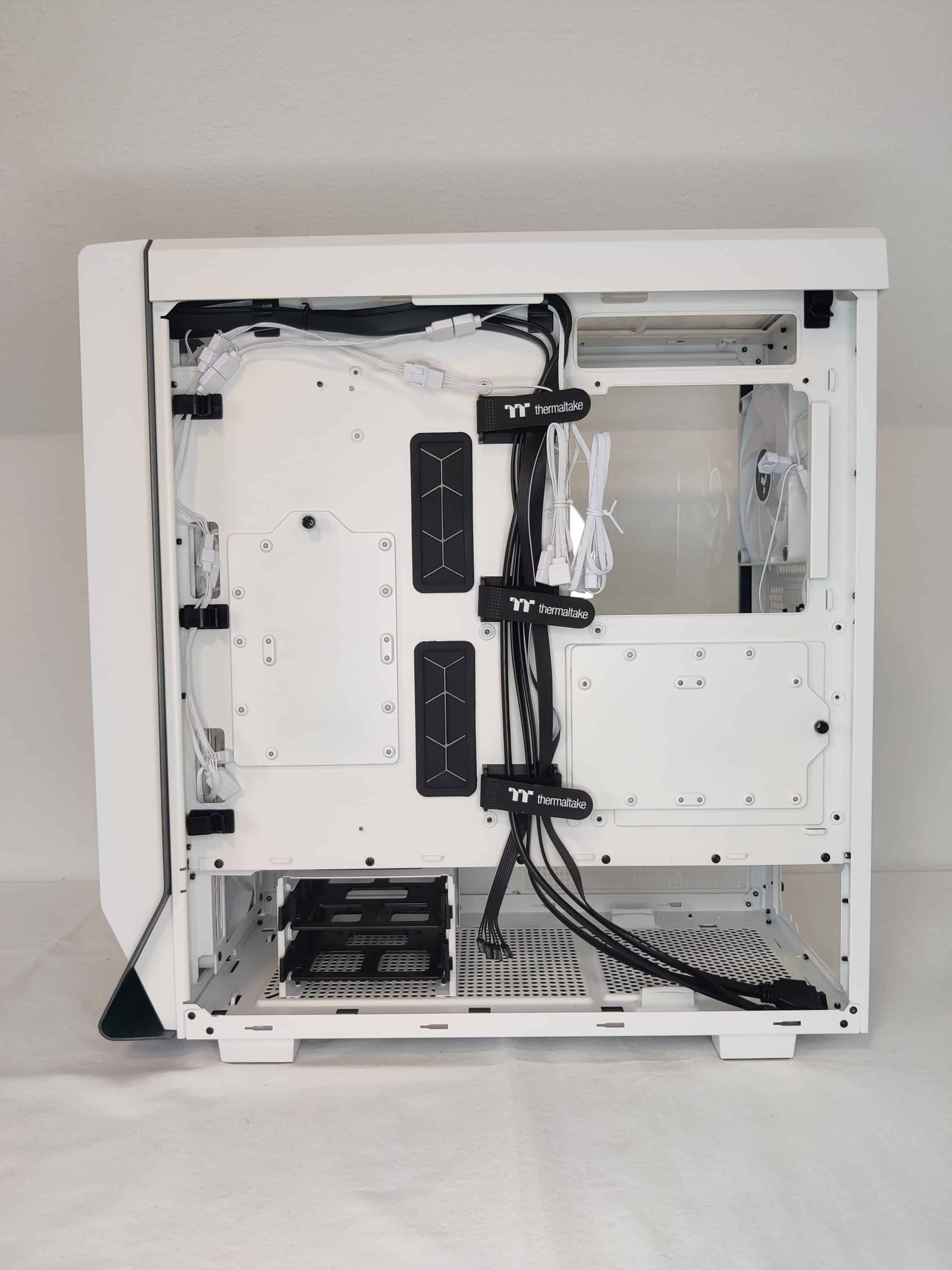 Das Kabelmanagement war durch die Bank weg sehr einfach und ließ sich komfortabel über die Rückseite realisieren. Die gummierten Öffnungen rechts neben dem Mainboard verdecken dabei die Sicht auf weitere Kabel im Hintergrund und fügen sich optisch ideal zu unserem PC in weiß/schwarzer-Kombination ein. Zwei SATA-SSDs haben wir ebenfalls sichtgeschützt in einem freien Montagerahmen installiert.