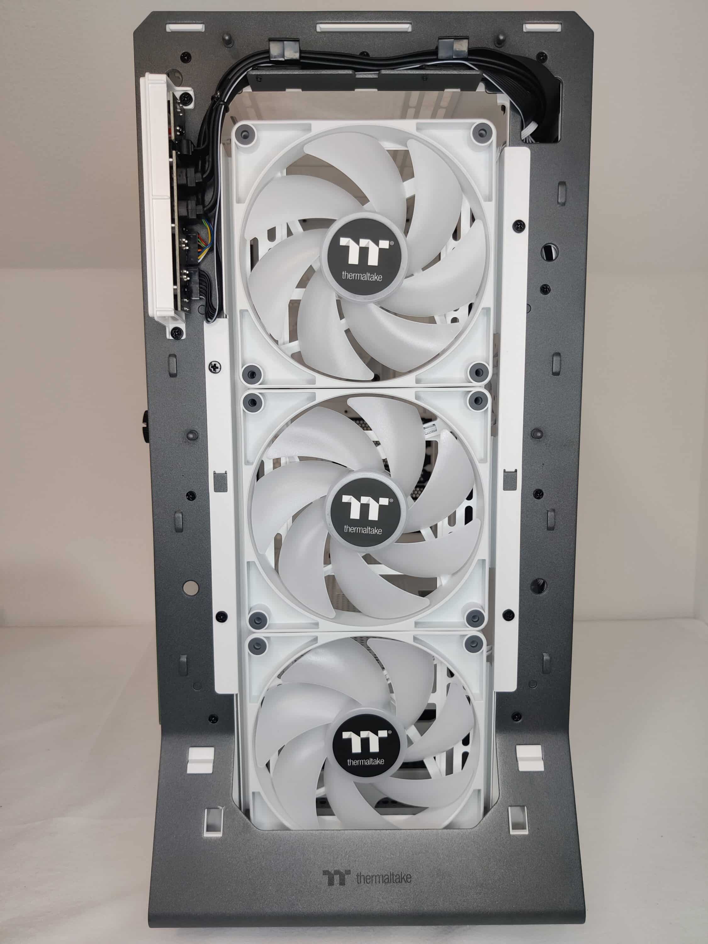 Aufgefallen ist uns hingegen, dass die Kabel für den hinteren Lüfter sehr kurz sind und lediglich bis hinter das Mainboard-Tray reichen. Sämtliche Frontlüfter waren zum Zeitpunkt des Zusammenbaus schon werksseitig als Daisy Chain verkabelt. Der Stromanschluss wird über ein 4-Pin-PWM-Kabel bewerkstelligt und die Beleuchtung erfolgt über einen 3-Pin-5V-ARGB-Stecker. Ein Lüfter- bzw. ARGB-Controller ist allerdings nicht enthalten.