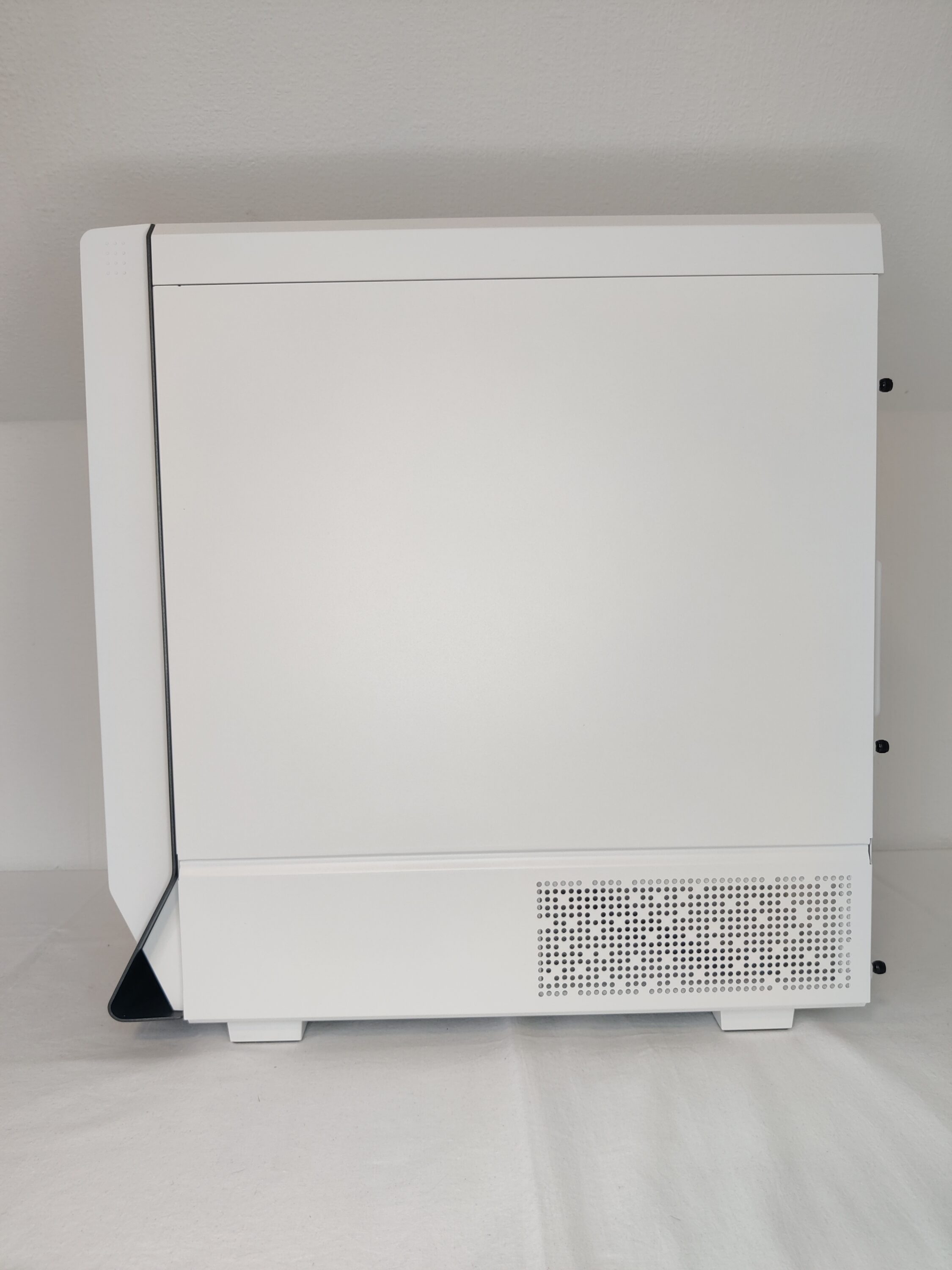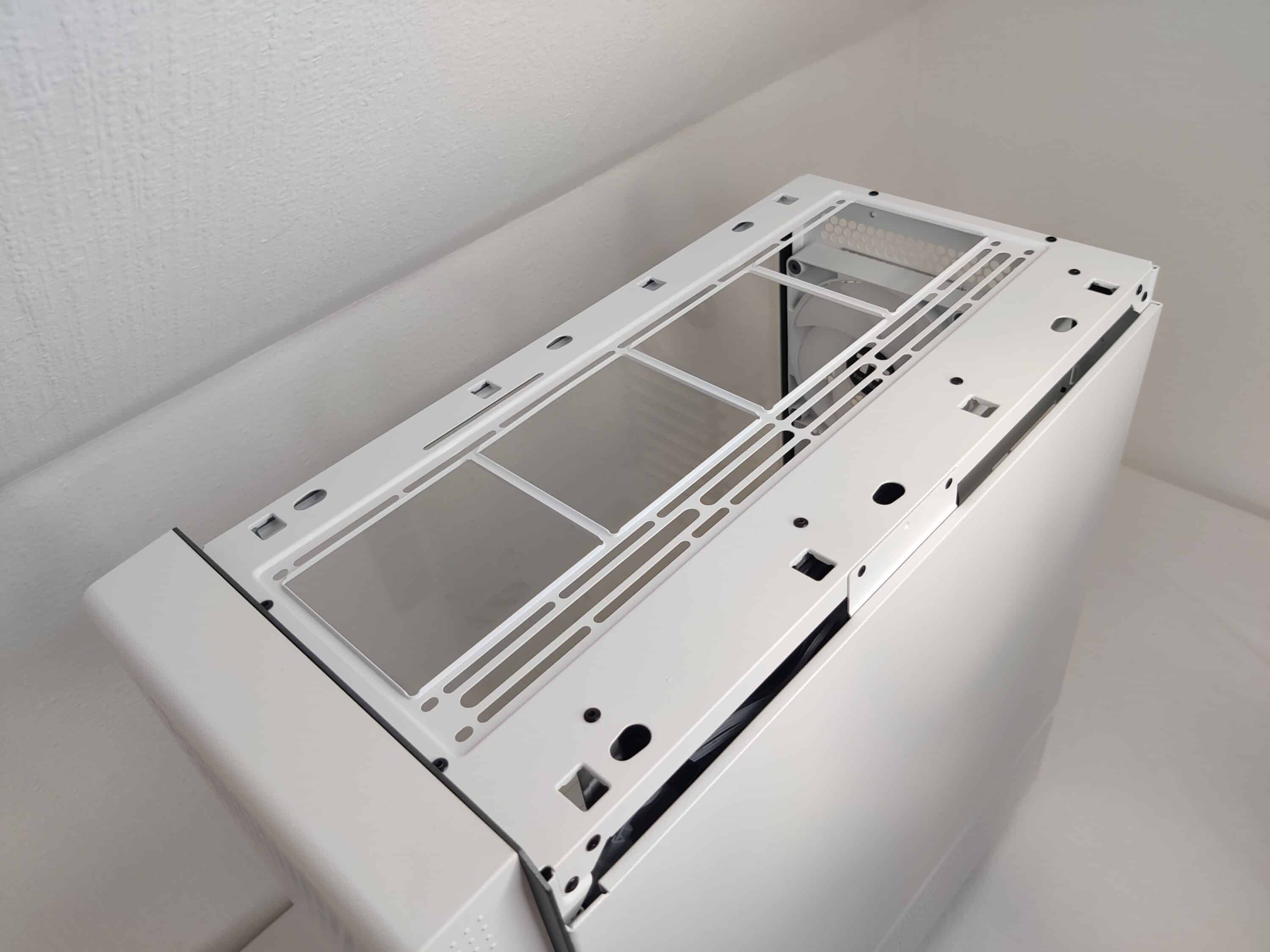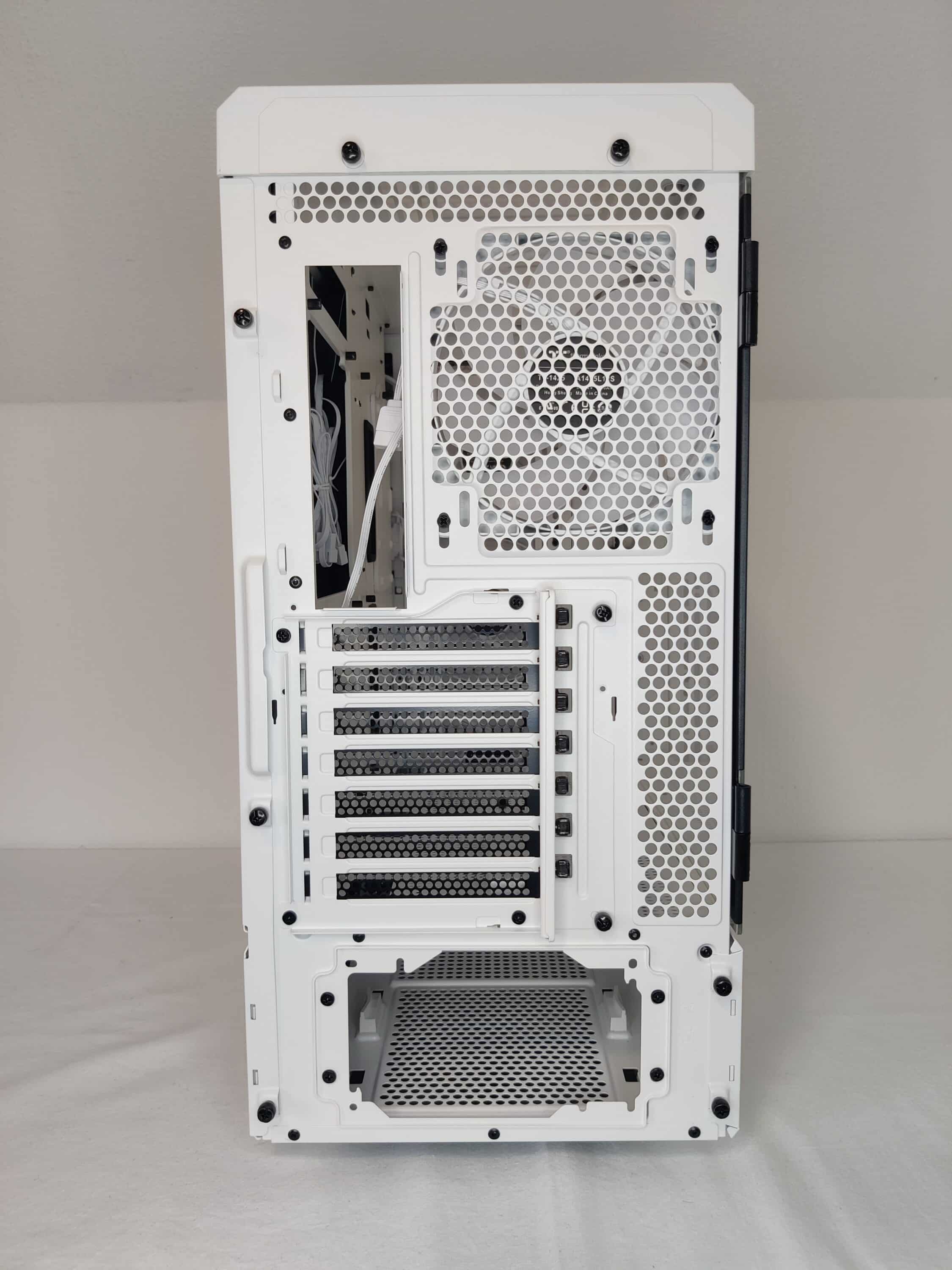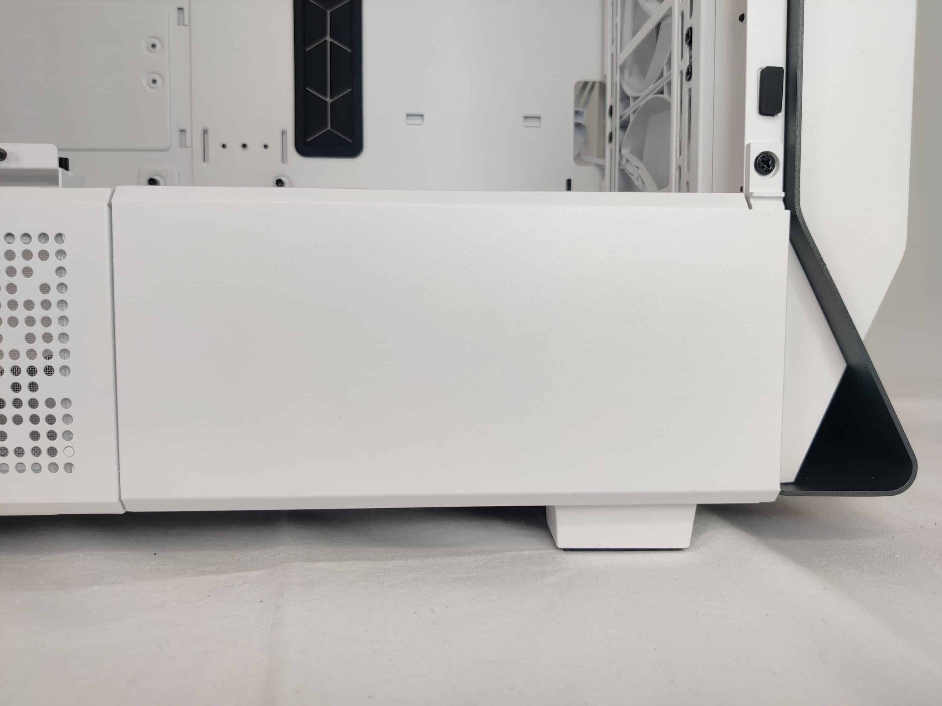 Gelungen ist aus unserer Sicht die Mischung aus dem schneeweißen Design in Verbund mit der dunklen Frontschürze. Dieser Farbverlauf zieht sich durch das komplette Gehäuse hindurch, was ein modernes aber auch zeitloses Design vermittelt. Das 3 Millimeter gehärtete Glasfenster an der linken Seite offenbart uns einen Blick auf das Gehäuseinnere. Durch einen eigenen Verschluss können wir das Glasfenster seitlich öffnen, welches zugleich von zwei stabilen Scharnieren in Form gehalten wird. Drehen wir das Gehäuse um die eigene Achse, so fällt auf, dass das Ceres 500 TG ARGB auf jeder Seite vollständig auf Airflow ausgelegt ist. Dies liegt auch darin begründet, dass über 60 % der Paneele perforiert sind.