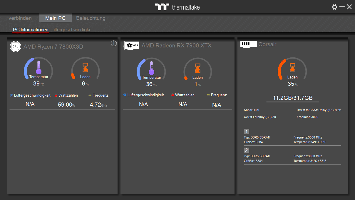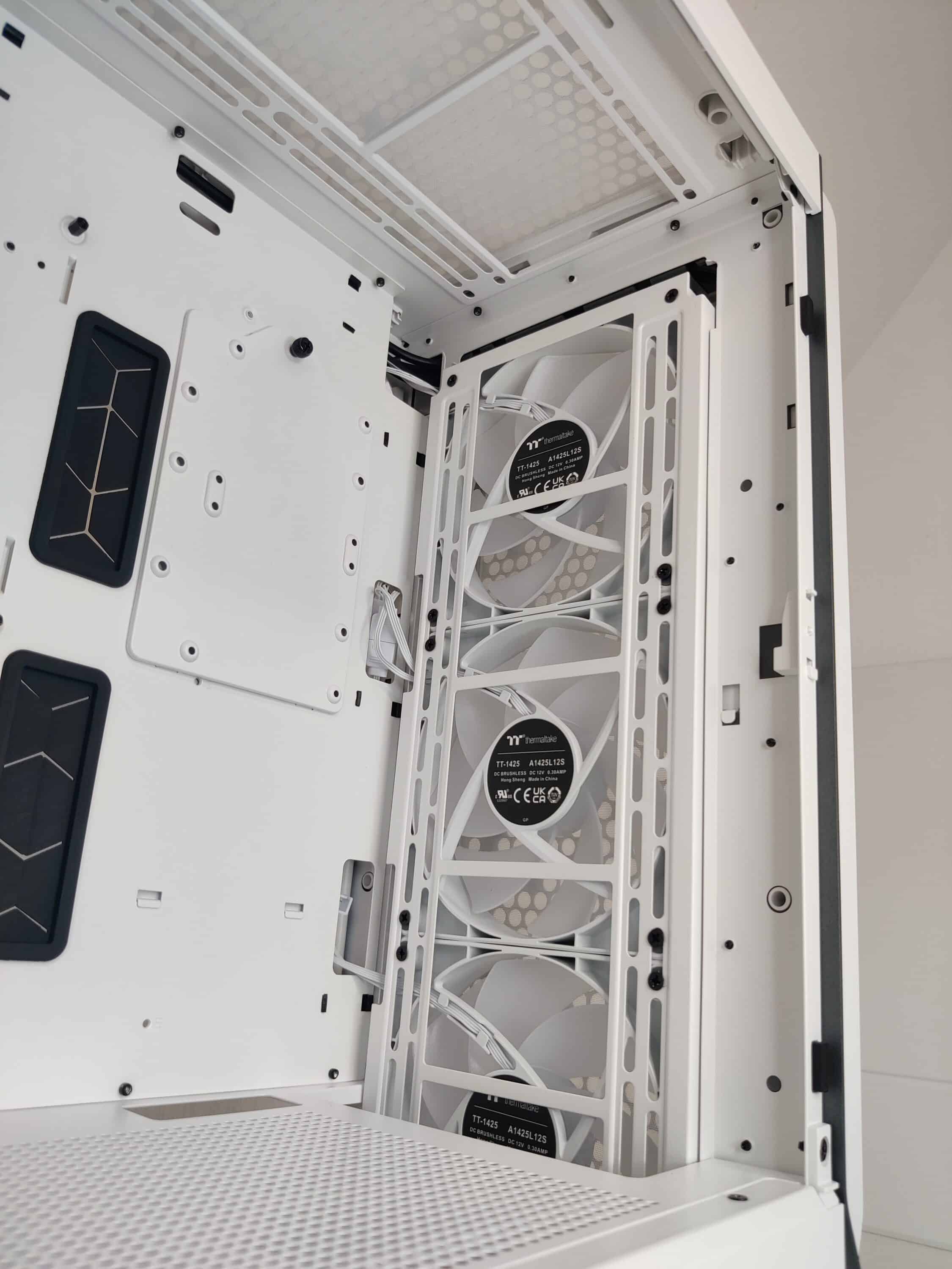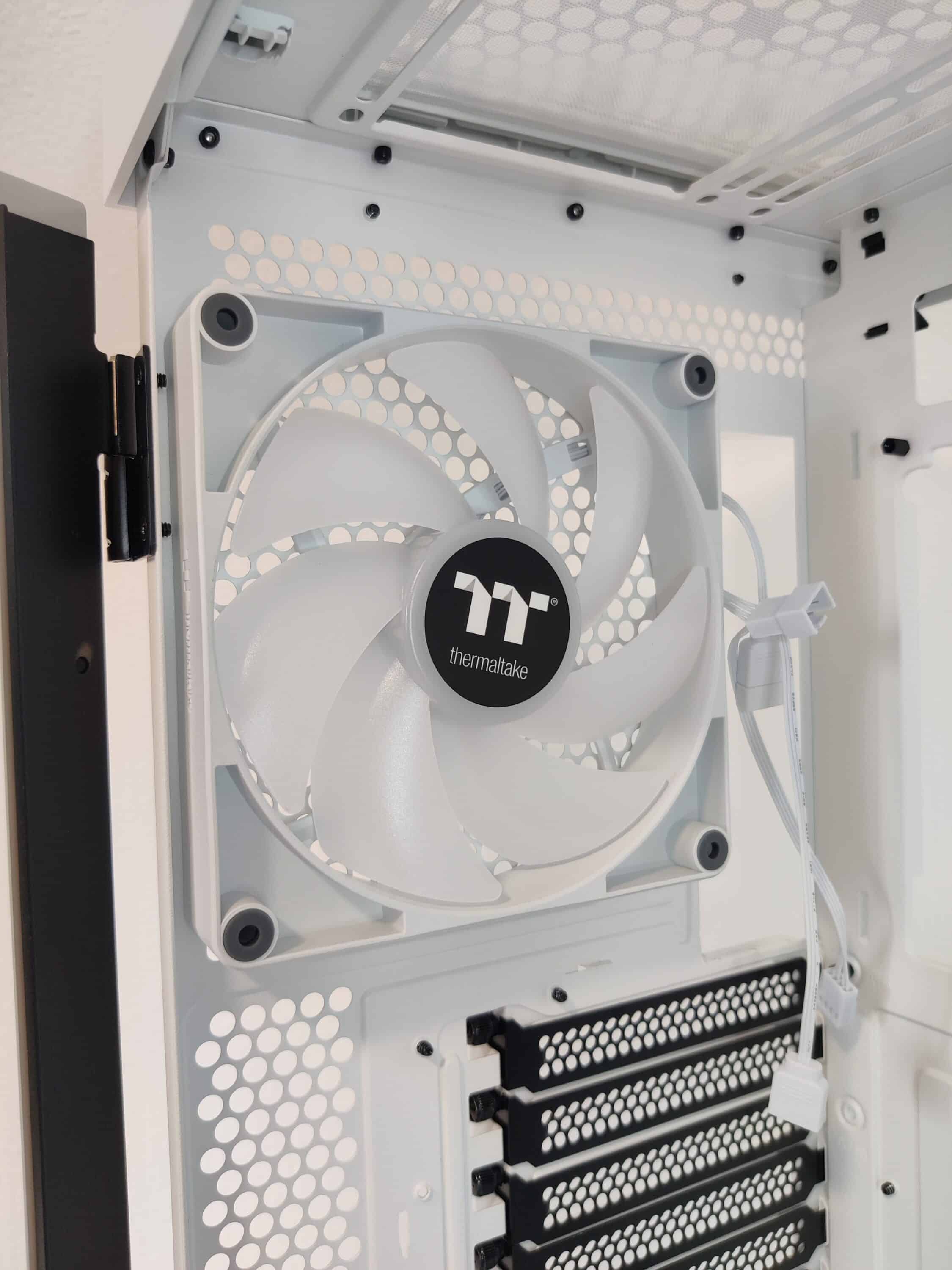 Zusammengefasst sind die erreichten Temperaturwerte aus unserer Sicht somit sehr gut. Auffällig war im Test jedoch, dass die Thermaltake-Lüfter sehr laut werden und bei Drehzahlen von rund 1500 rpm zudem als störend wahrgenommen werden können. Laut Hersteller erreichen die CT140 ARGB Lüfter eine Lautstärke von bis zu 30,5 dB – dies sollte man daher im Hinterkopf behalten. Nichtsdestotrotz hat der Test bewiesen, dass das Gehäuse ohne nennenswerte Schwierigkeiten ein High-End-System aus dem Jahre 2023 vollständig kühlen kann.