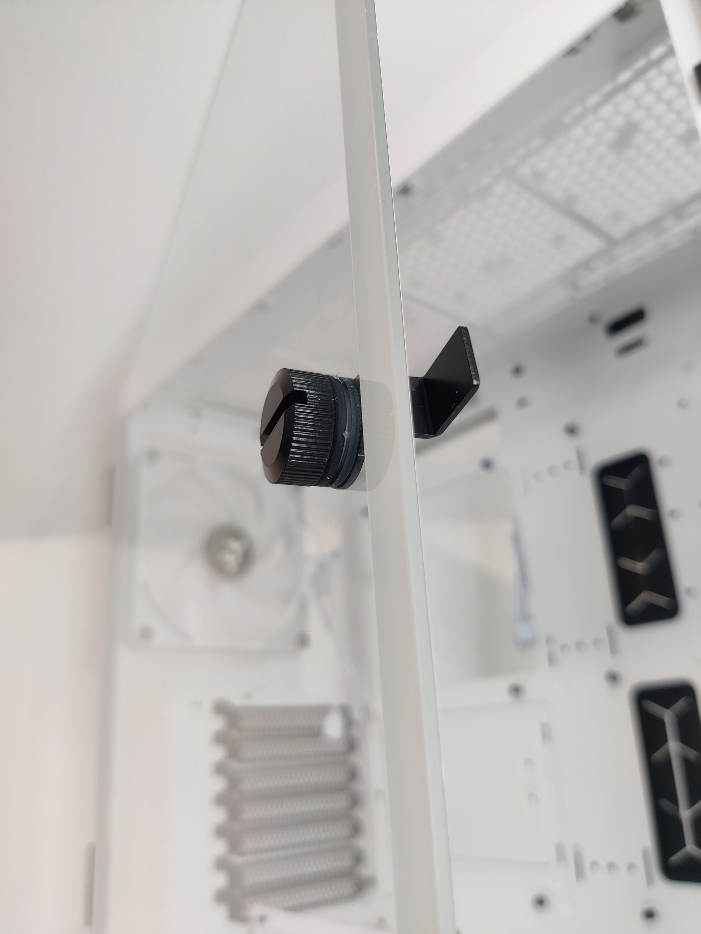 Willkommen ist ebenfalls die Tatsache, dass Thermaltake beim Ceres 500 TG ARGB auf mehrere magnetische Staubfilter für den Lufteinlass setzt. Auf der Rückseite des Gehäuses lassen sich zudem die PCI-E-Steckplätze vertikal drehen, sodass man recht komfortabel die Grafikkarte seitlich aufgestellt montieren kann. Das hierzu notwendige Riser-Kabel muss man für diesen Fall jedoch selbst bestellen. Bemerkenswert ist die integrierte GPU-Halterung, welche sich von oben und unten im Gehäuse fixieren lässt. Dies beugt Hardwareschäden vor, da im heutigen Zeitalter sonderlich schwere Grafikkarten oder jene mit Überlänge ansonsten den PCIe-Port auf Dauer abbrechen können.