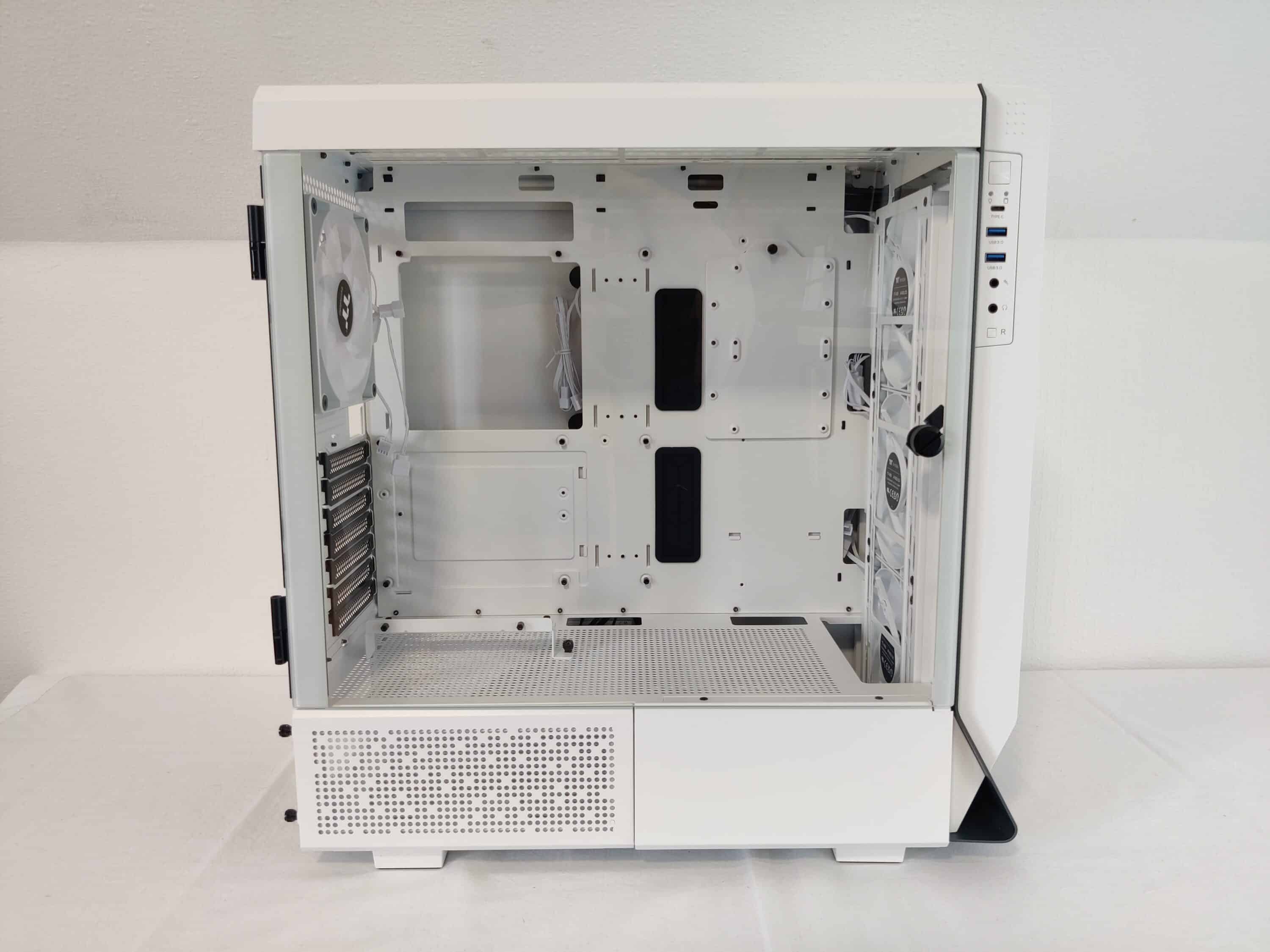 Bewegen wir unsere Augen auf den Innenraum des Gehäuses, so fällt auf, dass Thermaltake materialtechnisch zu jedem Zeitpunkt auf eine bestmögliche Materialauswahl setzt. Besonders angenehm empfinden wir die beiden gummierten Durchlässe in der Mitte, welche zur besseren Kabelführung dienen.