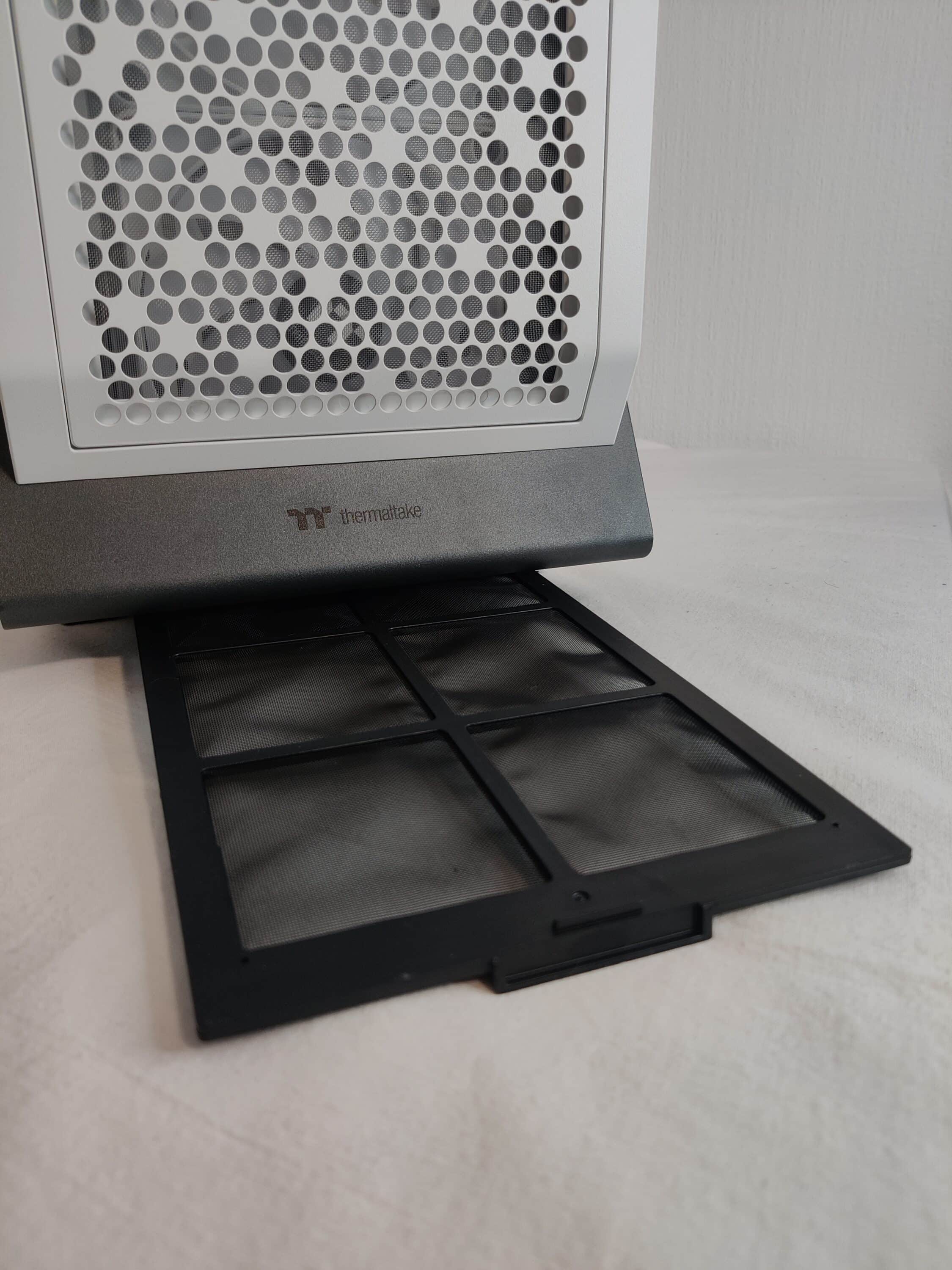 Während der Mechanismus für das Öffnen des verglasten Seitenteils sehr simpel gelöst ist, so spiegelt sich selbiges Verhalten auch bei den Staubschutzfiltern wider. Diese sind magnetisch und der untere Staubschutzfilter lässt sich sogar von vorne komfortabel rausziehen.