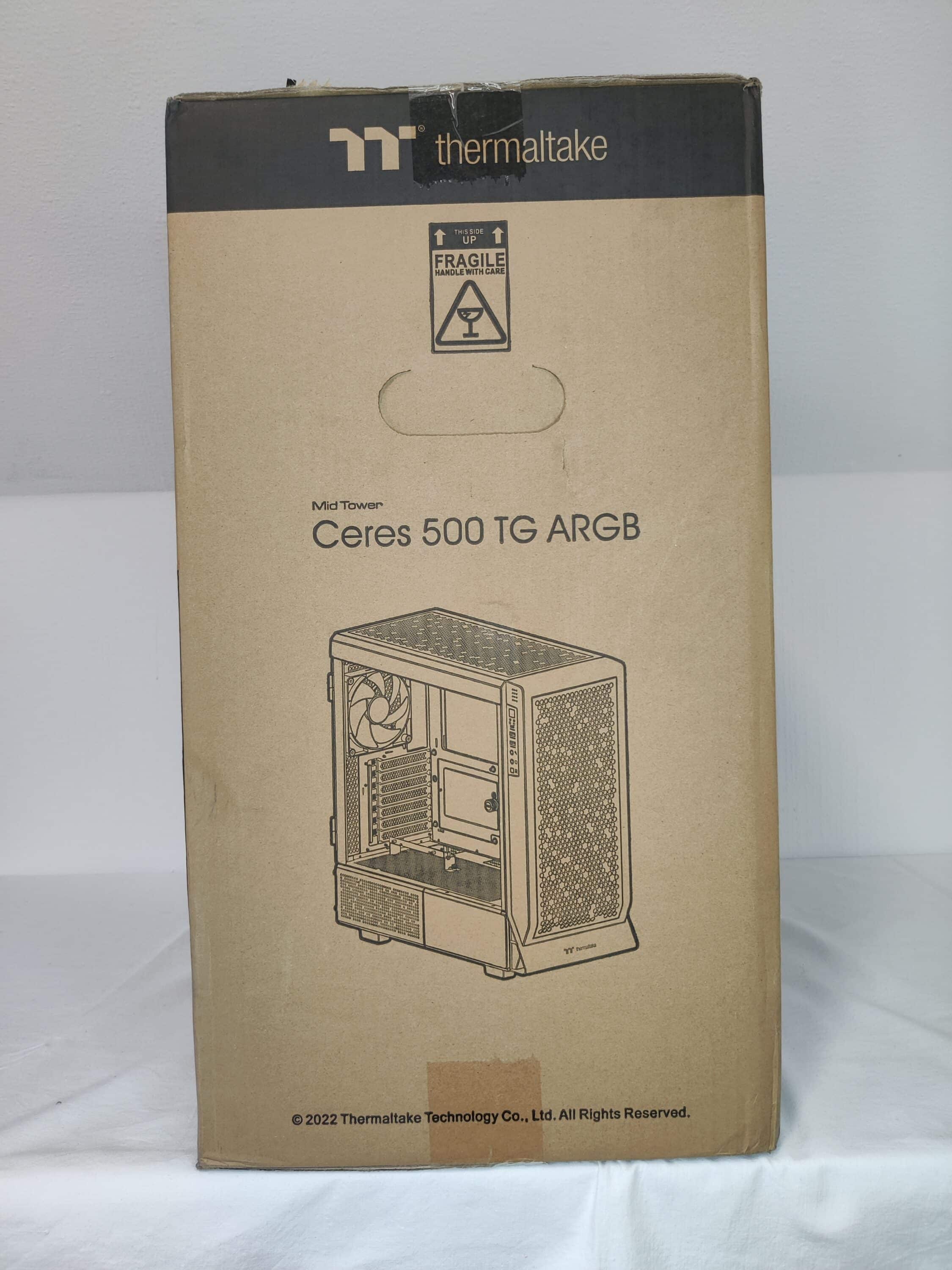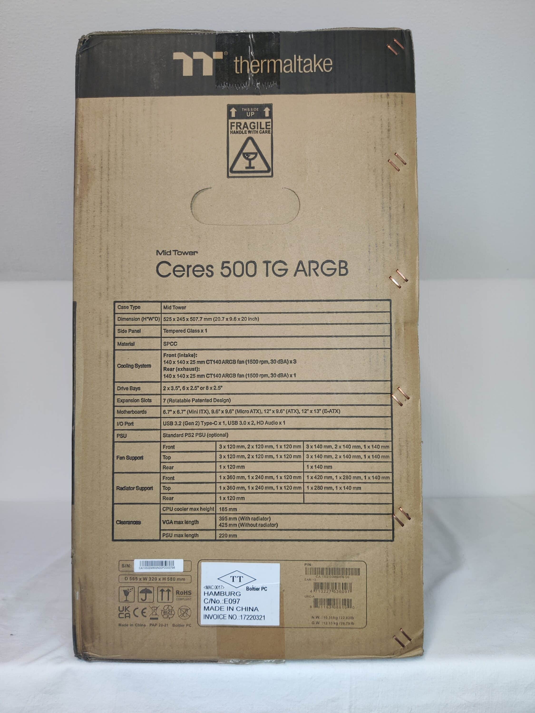 Der Karton des Thermaltake Ceres 500 TG ARGB ist ziemlich schlicht gehalten, offenbart jedoch den Verpackungsinhalt. Sowohl auf der Vorderseite, an der Seite wie auch auf der Rückseite ist das Gehäuse auf dem braunen Pappkarton abgebildet. Zusätzlich ist auf den ersten Blick ersichtlich, dass dieses Modell mit vier vollwertigen ARGB-Lüftern daherkommt. Eine Seite des Kartons stellt die technischen Daten des Ceres 500 TG ARGB tabellarisch dar.