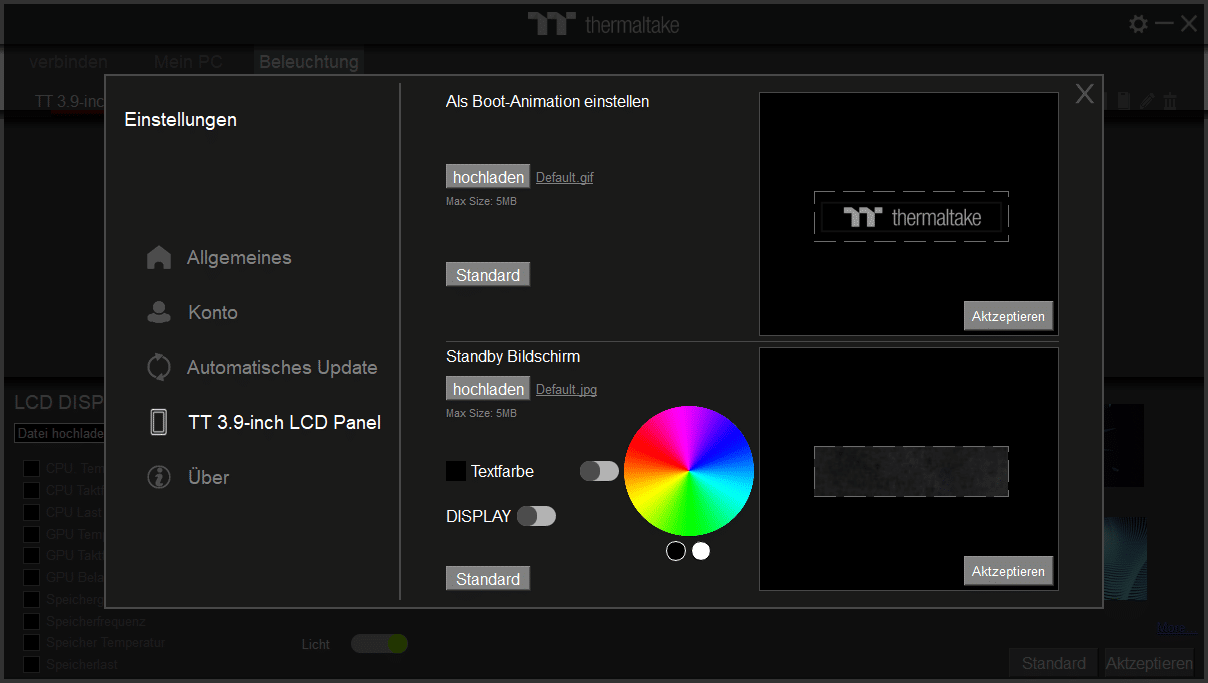 Zur Steuerung des LCD Panel Kits wird auf die herstellereigene TT RGB Plus 2.0 Software zurückgegriffen. Beim erstmaligen Start der Anwendung wurde auf Anhieb das Display gefunden. Das Programm ist recht übersichtlich, wirkt jedoch im Vergleich zu Tools anderer Hersteller optisch etwas altmodisch.