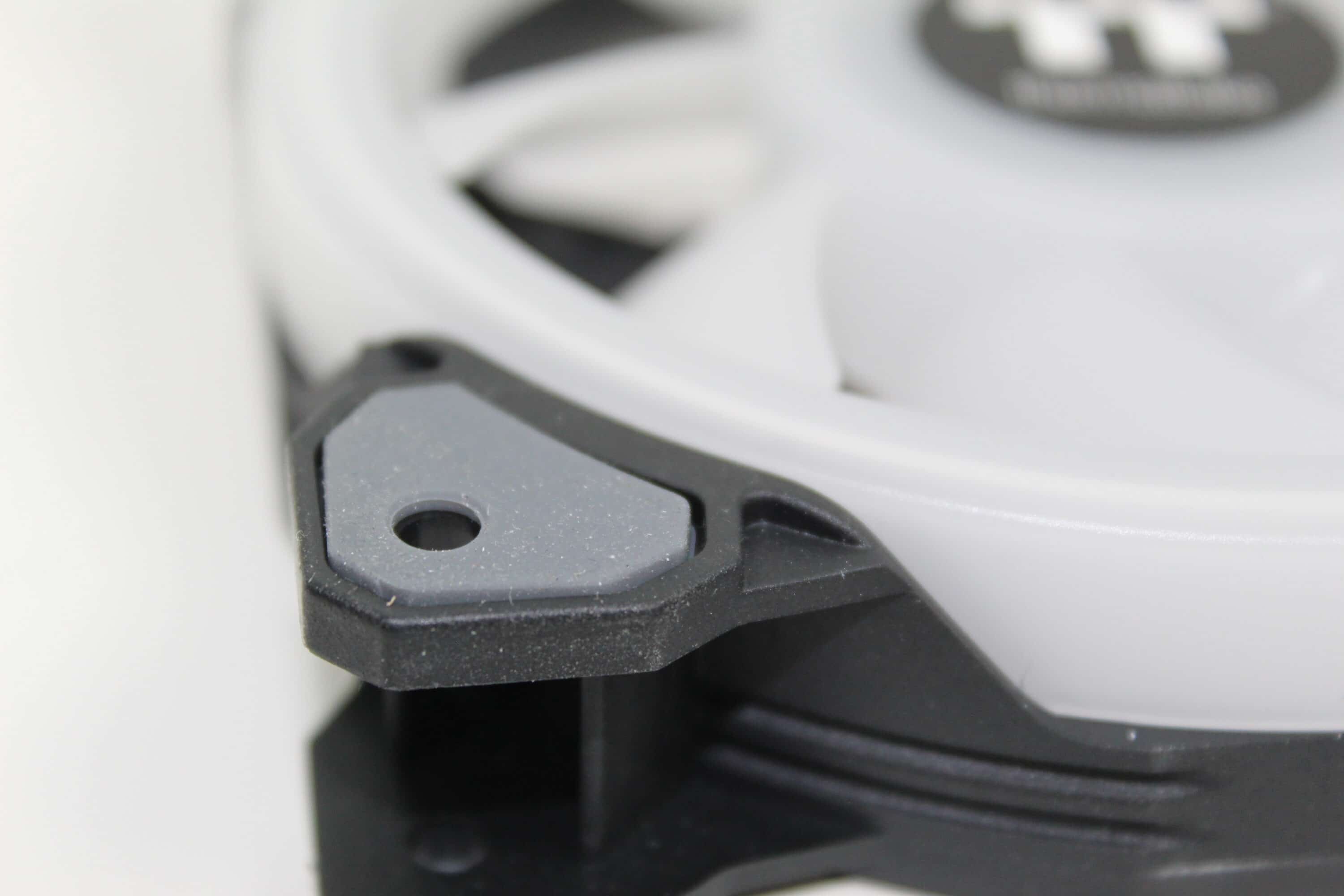 Der Lüfter besitzt neun Rotorenblätter und soll einen recht hohen statischen Druck aufweisen – ideal für die Montage auf Radiatoren. Zusätzlich sind an den Verschraubungslöchern graue Anti-Vibrations-Pads montiert, um Schwingungen, die an das Gehäuse übertragen werden, zu minimieren.