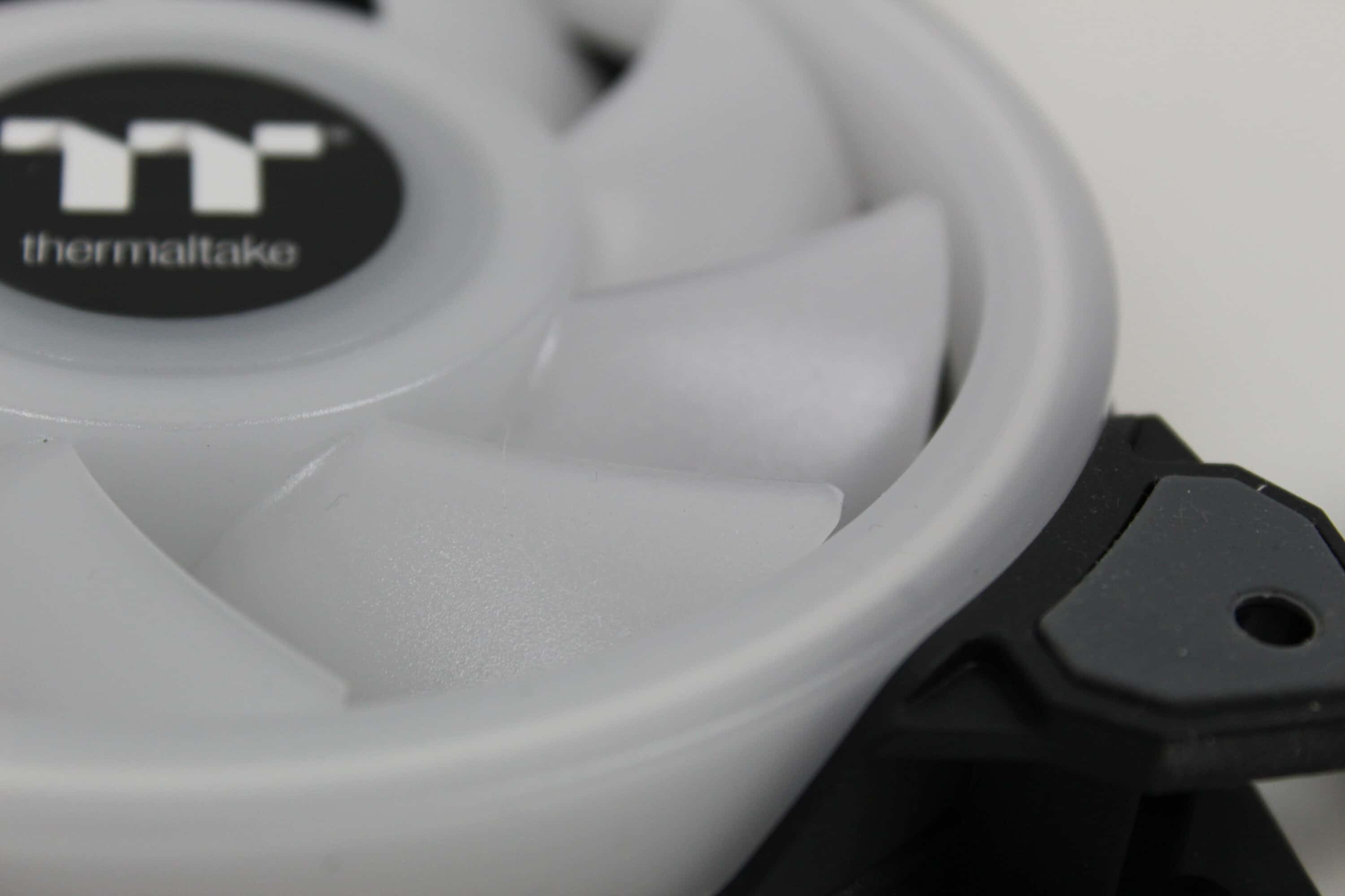 Die Hochwertigkeit der Lüfter überzeugt uns direkt. Der Korpus besteht aus schwarzem Kunststoff, der beleuchtete Bereich ist komplett in einem milchigen Weiß gehalten. Unter dieser Abdeckung befinden sich die 54 LEDs – ein leuchtstarker Anblick wird erwartet.