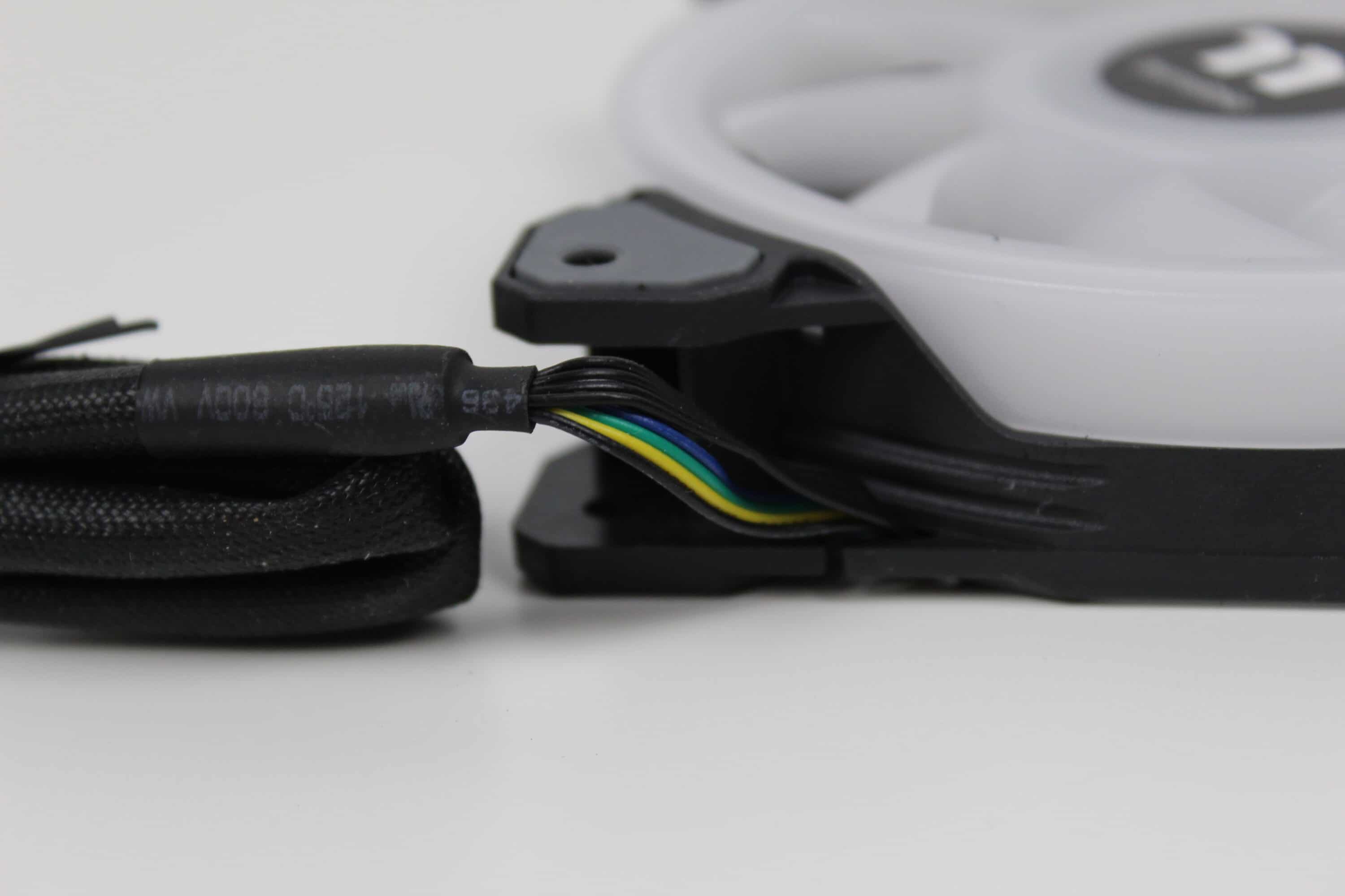 Das gesleevte Anschlusskabel fällt mit etwa 90 cm sehr lang aus – auch in großen Gehäusen sollten sich die Lüfter leicht montieren Lassen. Auffällig ist der einzelne proprietäre Anschluss. Die Lüfter können somit nur am mitgelieferten Controller angeschlossen werden.
