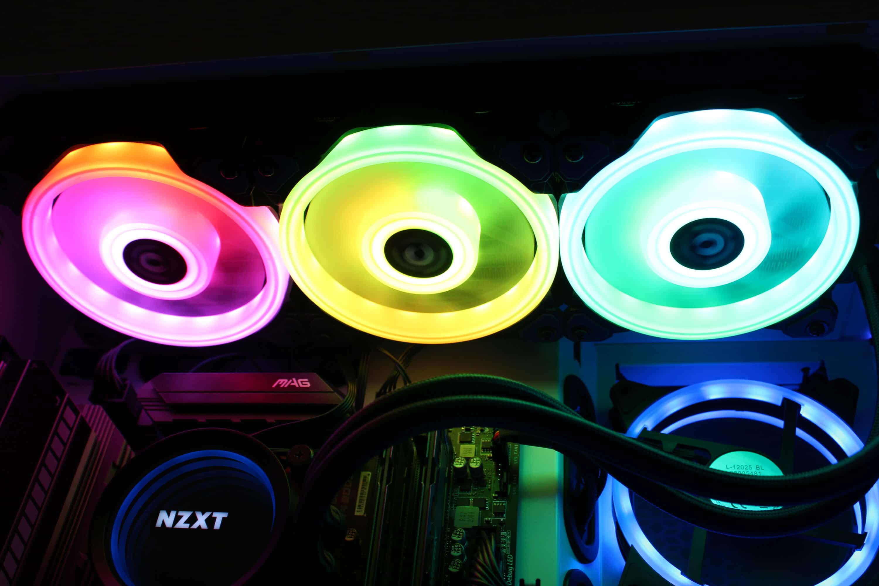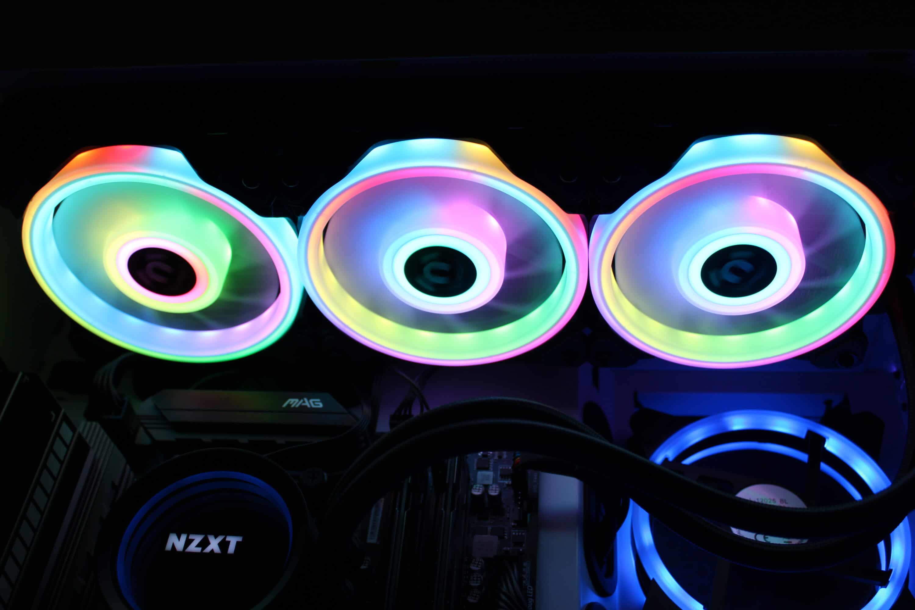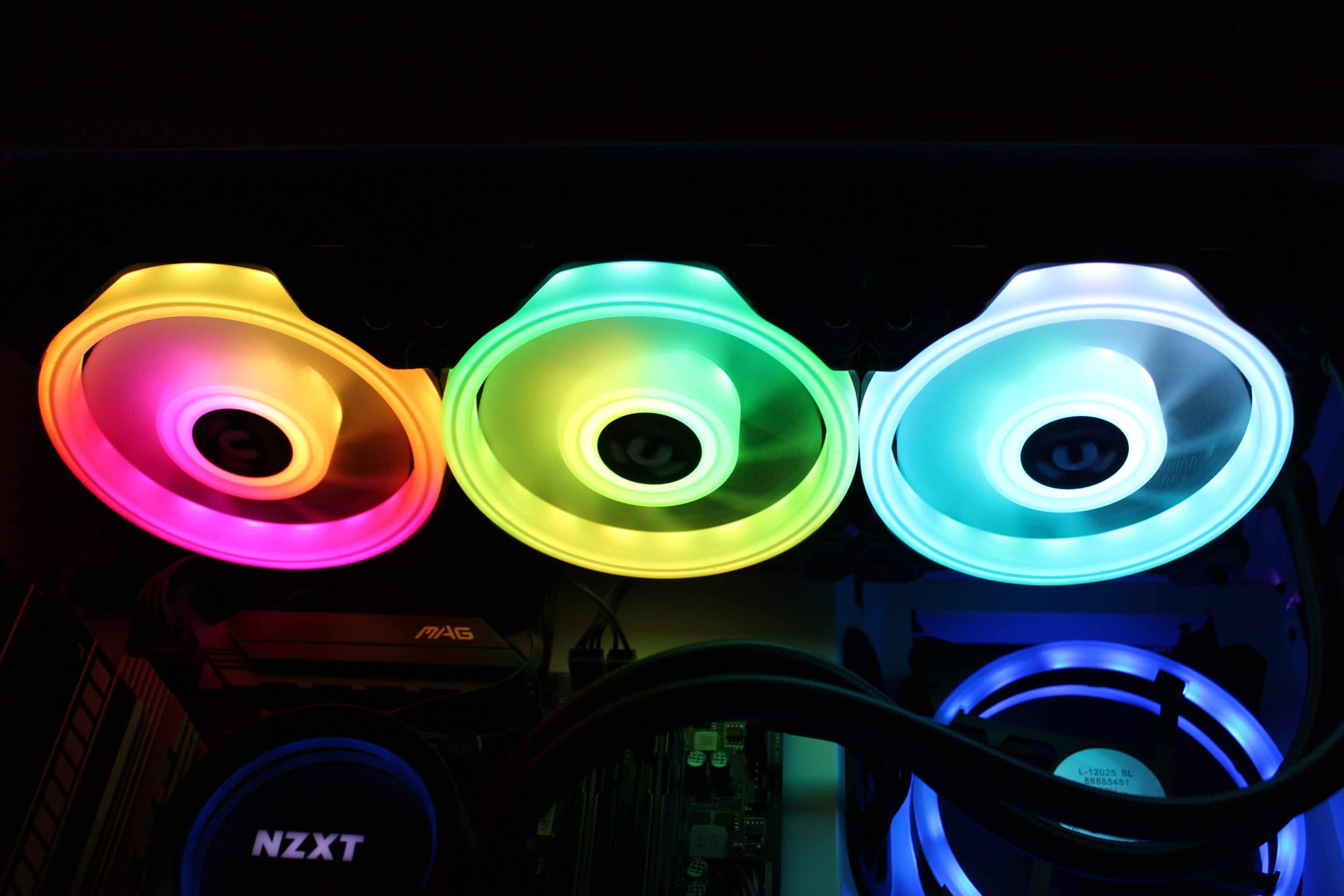 Betrachtet man alles zusammengefasst, ist die Beleuchtung überzeugend – das sollte diese auch sein, bei Lüftern die primär durch eure Optik auf dem Markt auffallen. Die vier Ringe, bzw. die Masse an LEDs ist sonst nicht geläufig, in den meisten Fällen gibt es 1-2 Ringe. Schade ist jedoch, dass die Lüfter nicht symmetrisch sind und so die Beleuchtung nur von der Vorderseite vorhanden ist.