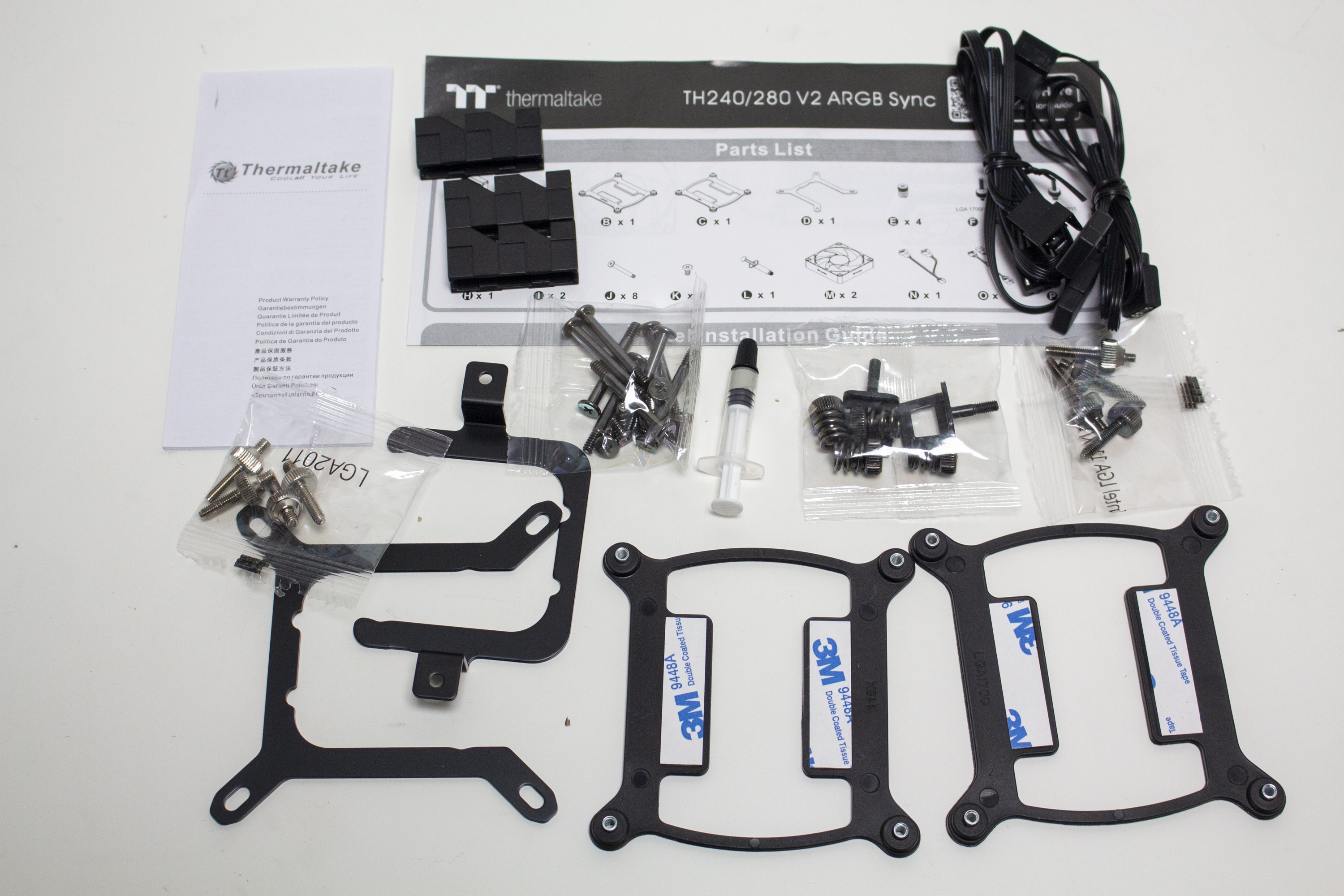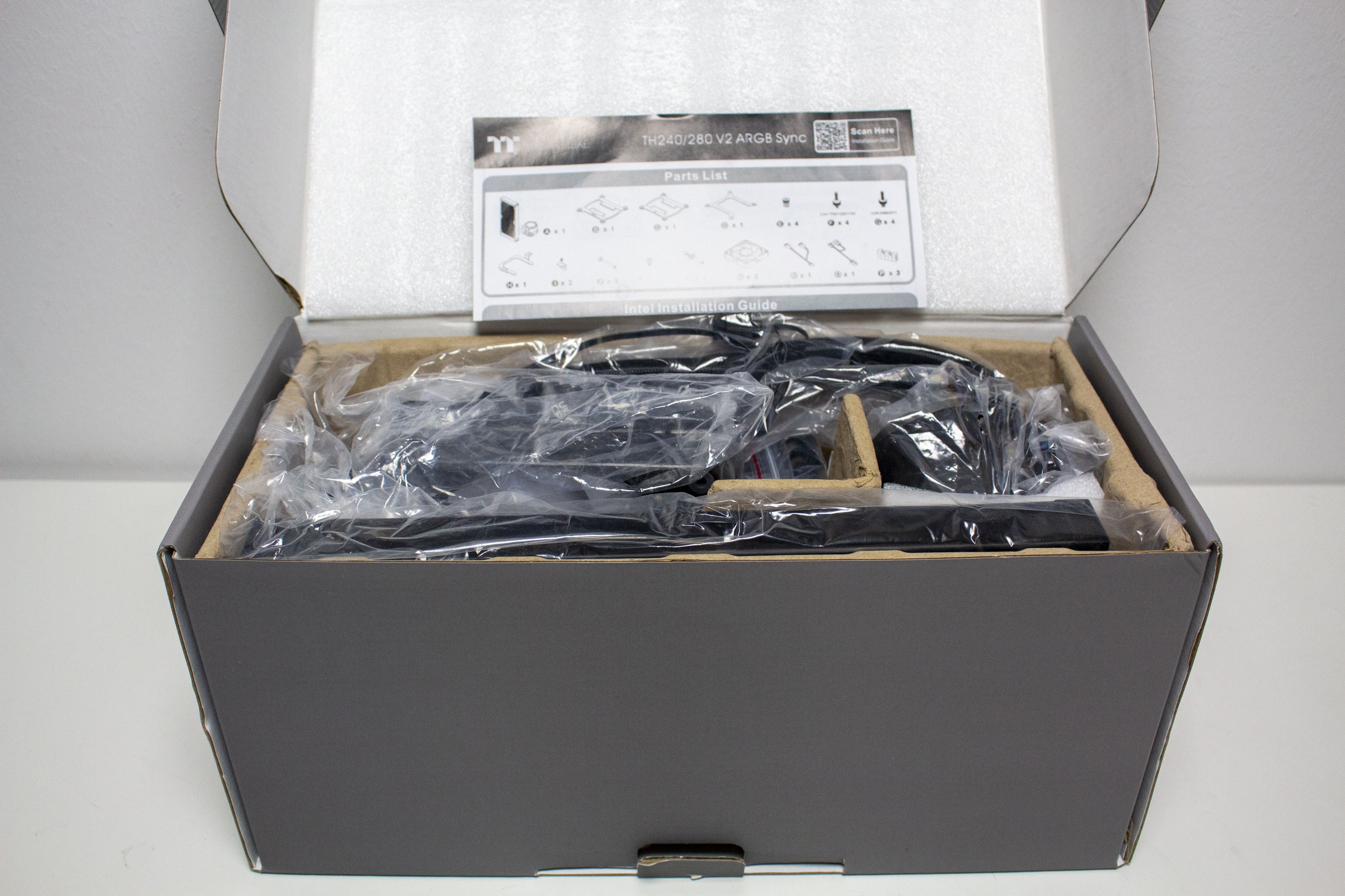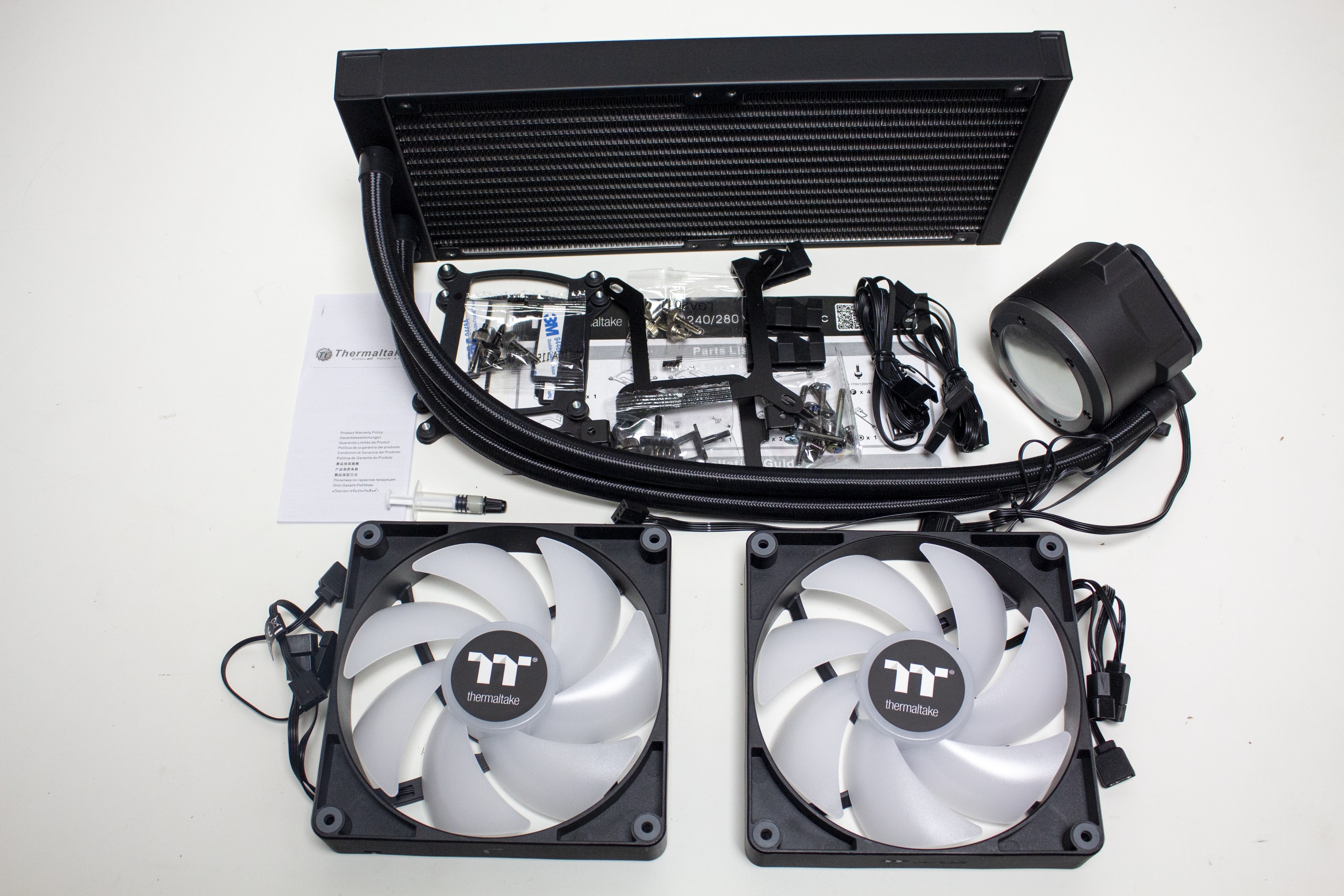 Innerhalb des Kartons finden wir den Radiator, die zwei Lüfter vom Typ CT140 ARGB, eine kurze Montageanleitung, eine Karte mit Garantieinformationen sowie einen Beutel mit dem gesamten Montagematerial bzw. Verlängerungskabeln für das PWM- bzw. ARGB-Kabel. Sowohl der Radiator und die Pumpe als auch die Lüfter wurden zum Schutz vor Kratzern jeweils in eine Folie aus Kunststoff gehüllt und oberhalb mit einer dünnen Lage Styropor abgedeckt. Außerdem setzt Thermaltake auf eine Form aus recycelter Pappe.