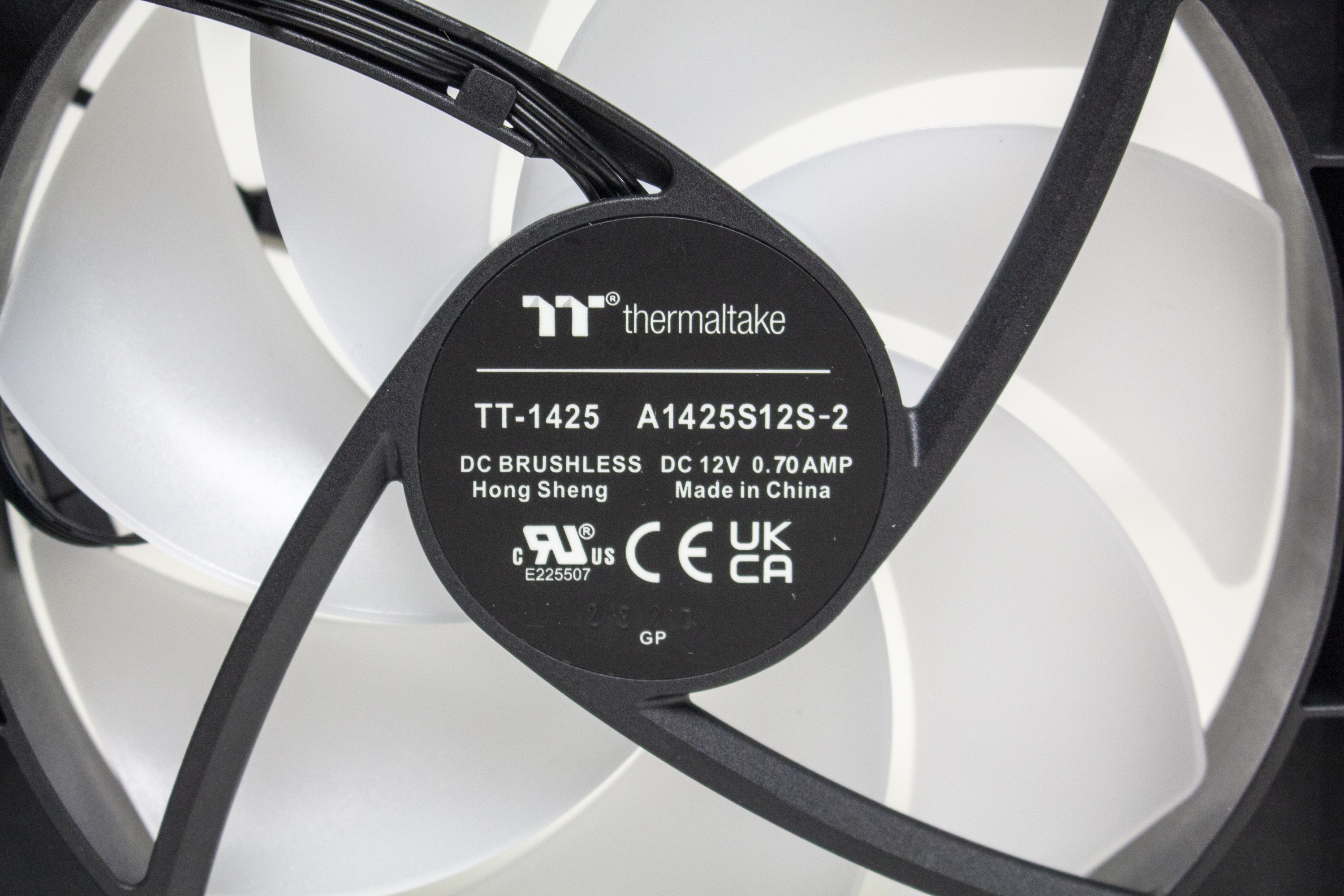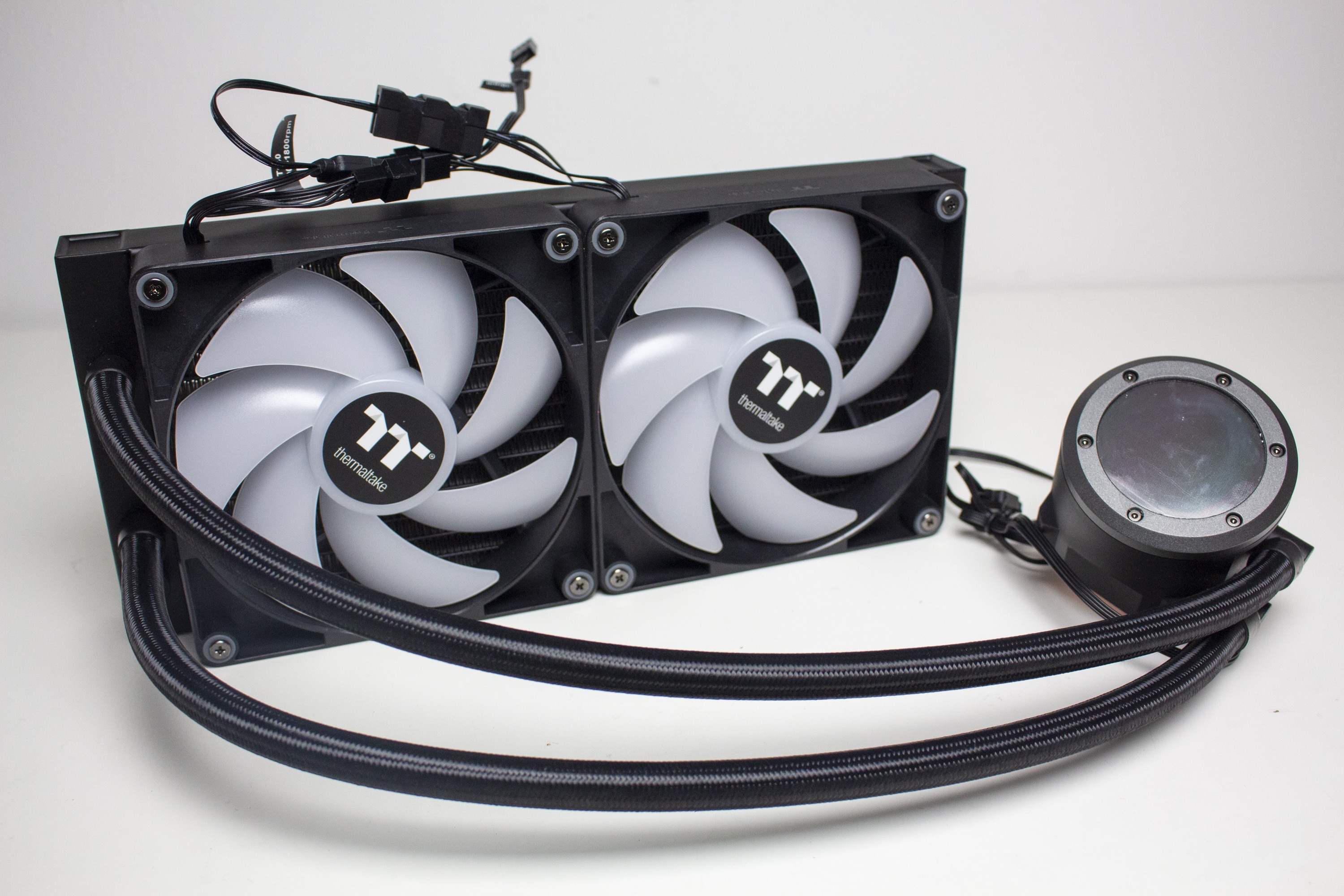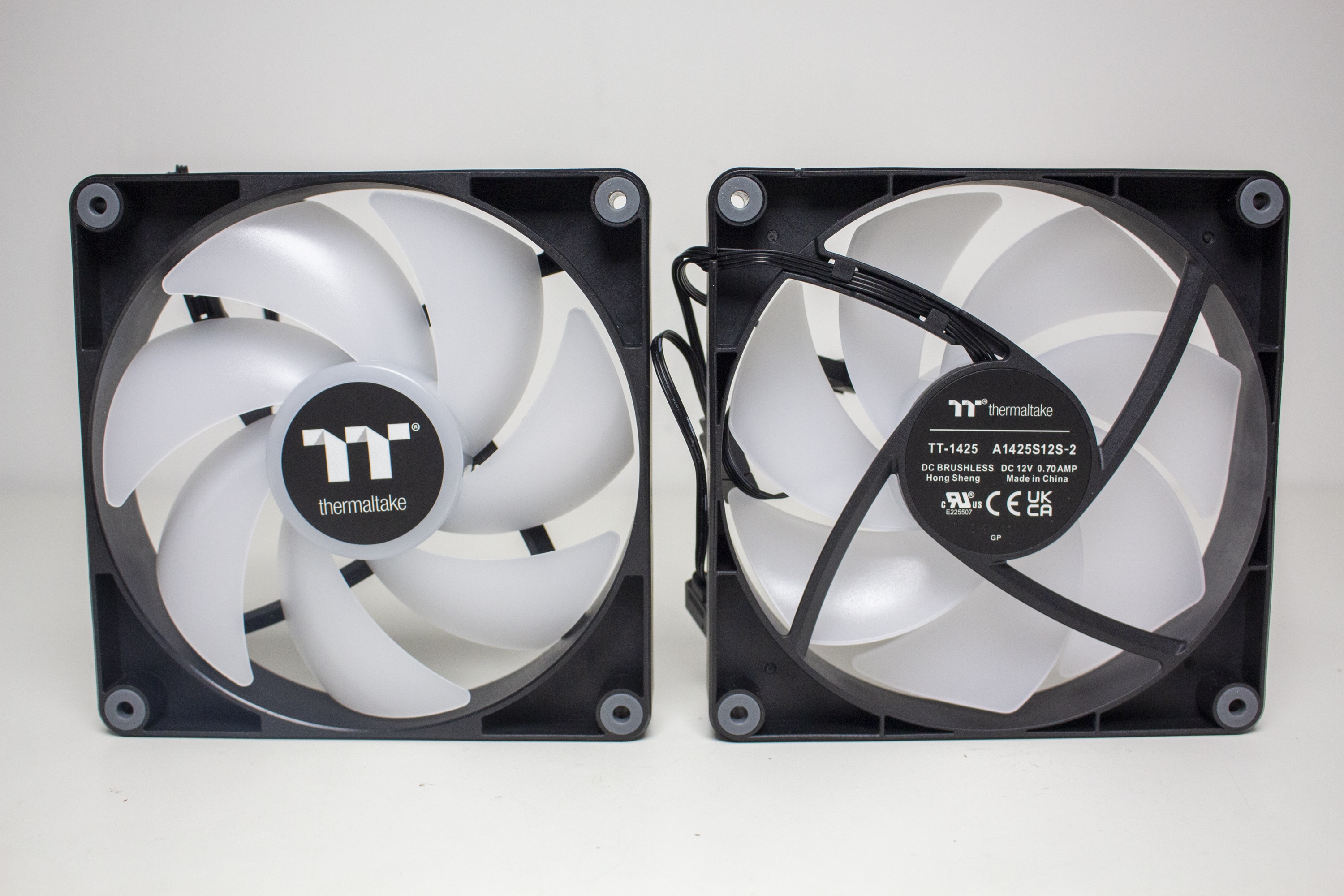 Die mitgelieferten Lüfter vom Typ CT140 ARGB sind aus schwarzem Kunststoff für den Rahmen bzw. milchigem Kunststoff für die Rotoren gefertigt und verfügen über einen Drehzahlbereich zwischen 500 und 1800 Umdrehungen pro Minute. Außerdem hat Thermaltake die Lüfter mit zehn ARGB-LEDs in der Lüfternabe ausgestattet. Der Anschluss der Lüfter erfolgt mittels 4-Pin-PWM–Header für Strom und 3-Pin-5V-ARGB-Header für die Beleuchtung. Weiterhin verfügen beide Kabel jeweils über eine Daisy-Chaining-Möglichkeit.