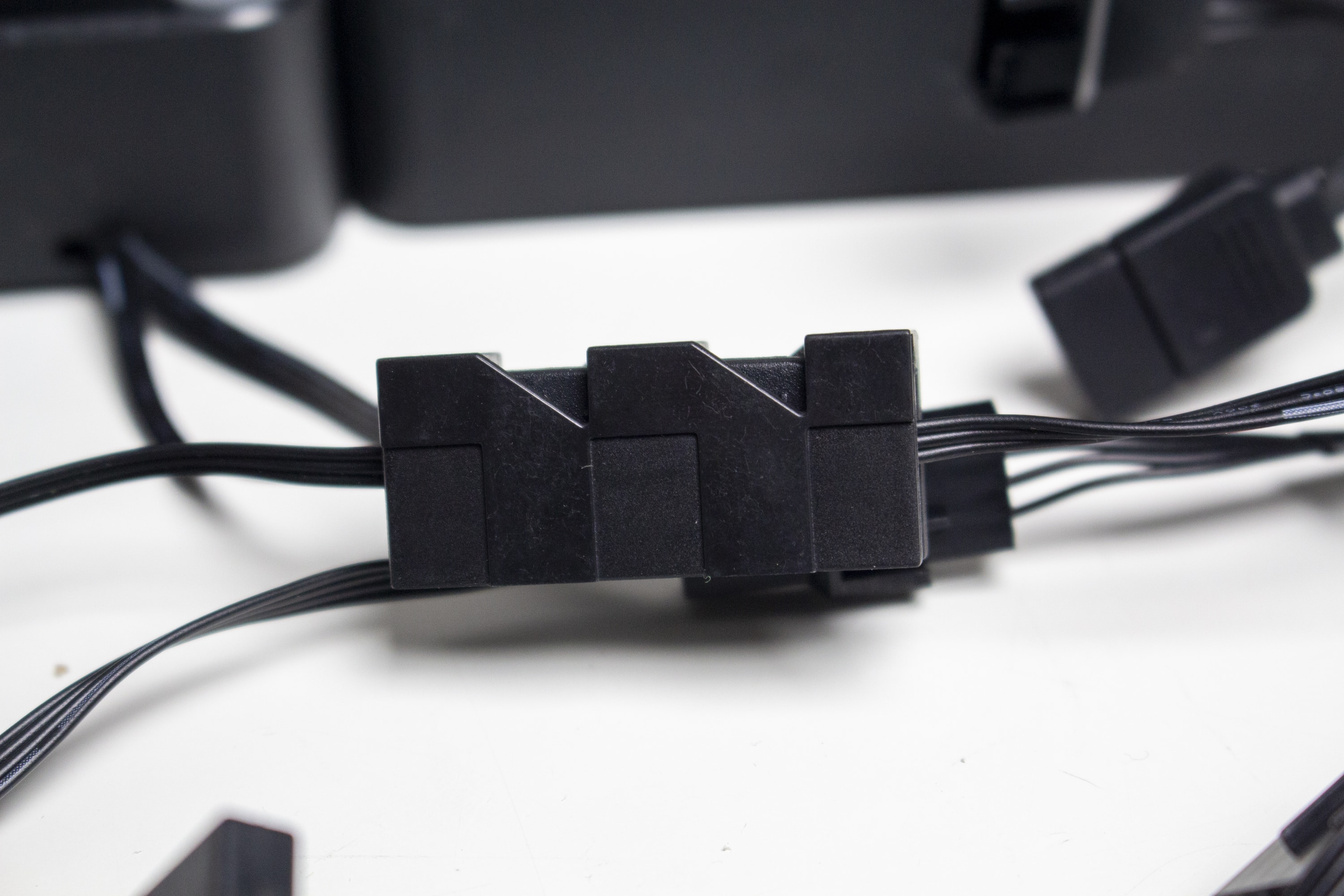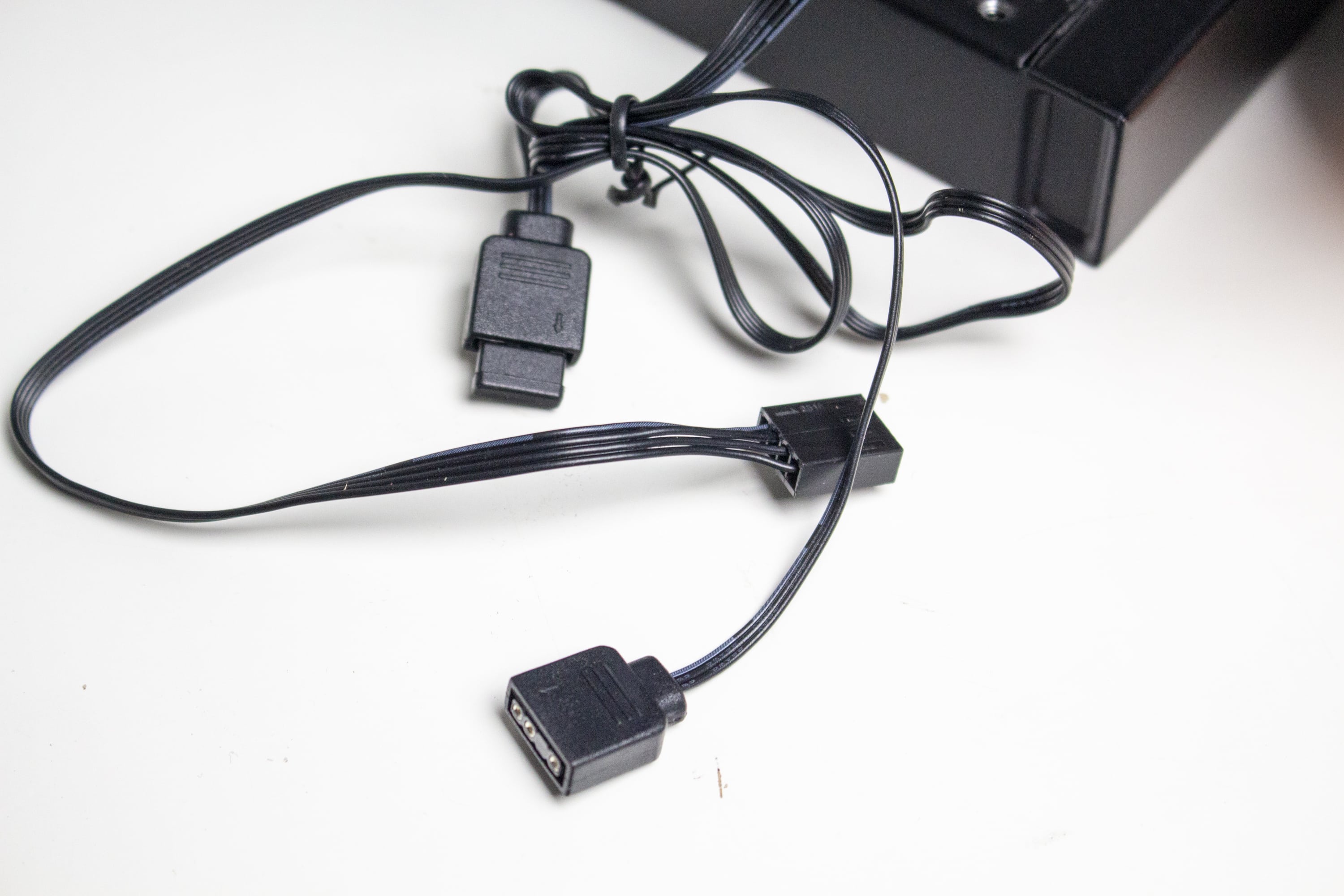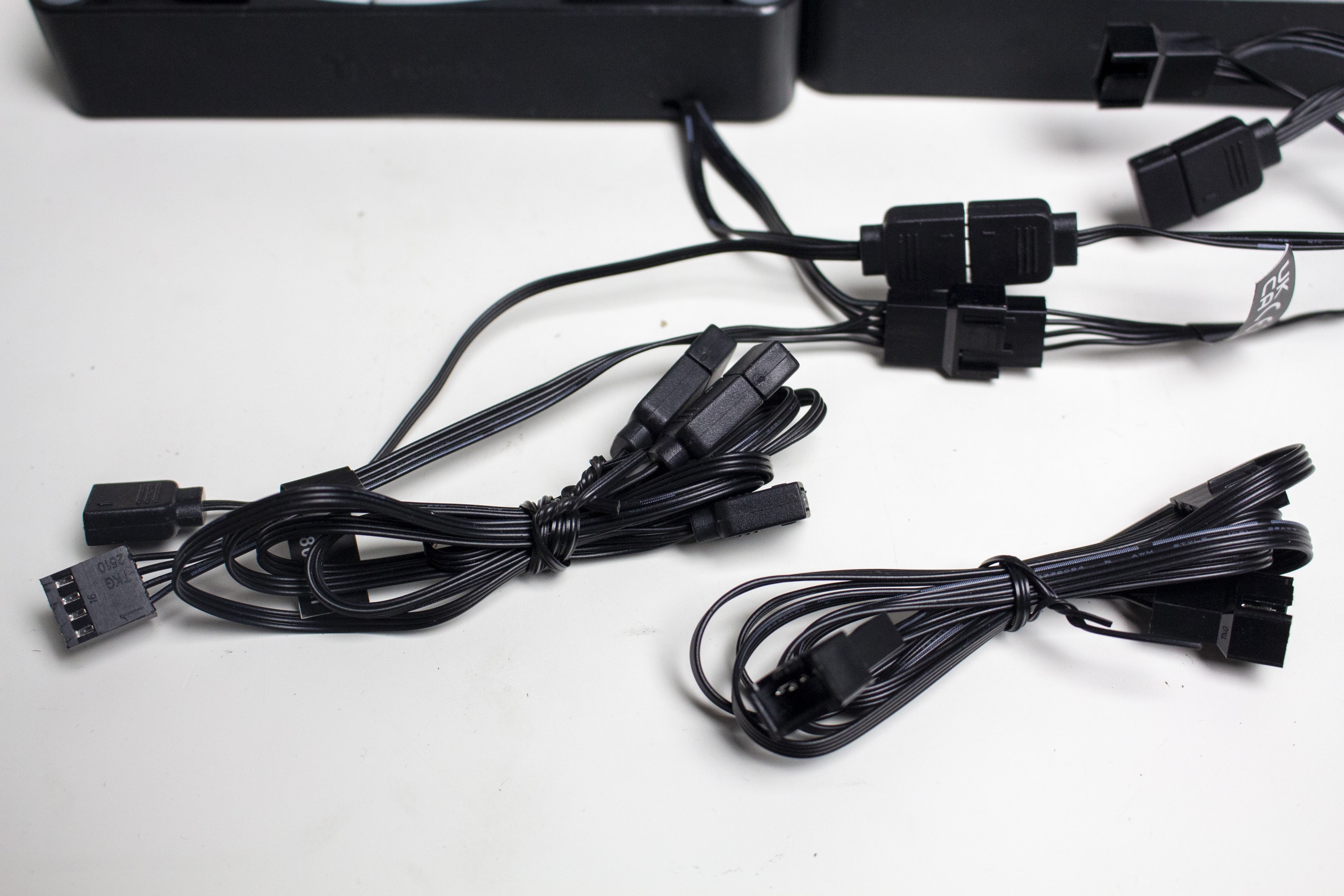 Die mitgelieferten Lüfter vom Typ CT140 ARGB sind aus schwarzem Kunststoff für den Rahmen bzw. milchigem Kunststoff für die Rotoren gefertigt und verfügen über einen Drehzahlbereich zwischen 500 und 1800 Umdrehungen pro Minute. Außerdem hat Thermaltake die Lüfter mit zehn ARGB-LEDs in der Lüfternabe ausgestattet. Der Anschluss der Lüfter erfolgt mittels 4-Pin-PWM–Header für Strom und 3-Pin-5V-ARGB-Header für die Beleuchtung. Weiterhin verfügen beide Kabel jeweils über eine Daisy-Chaining-Möglichkeit.