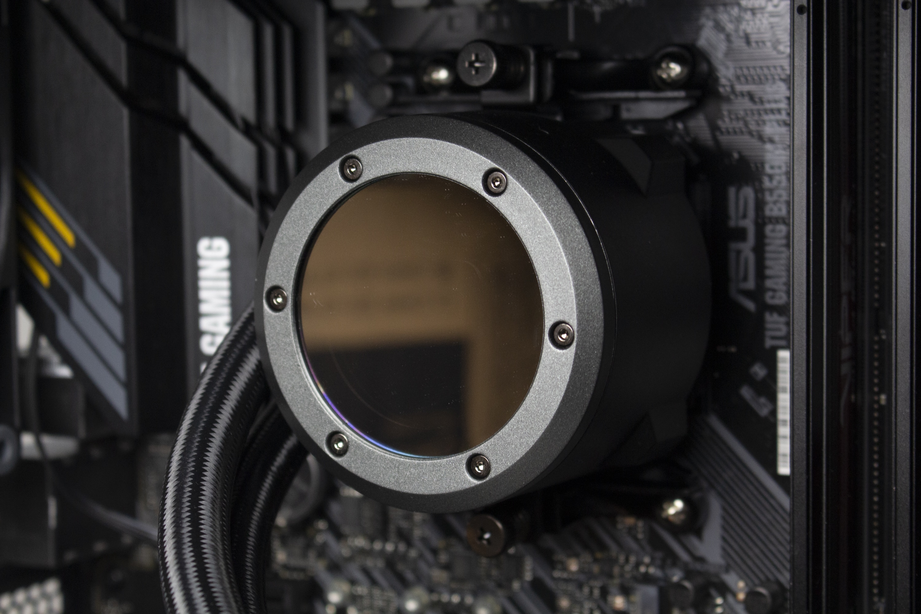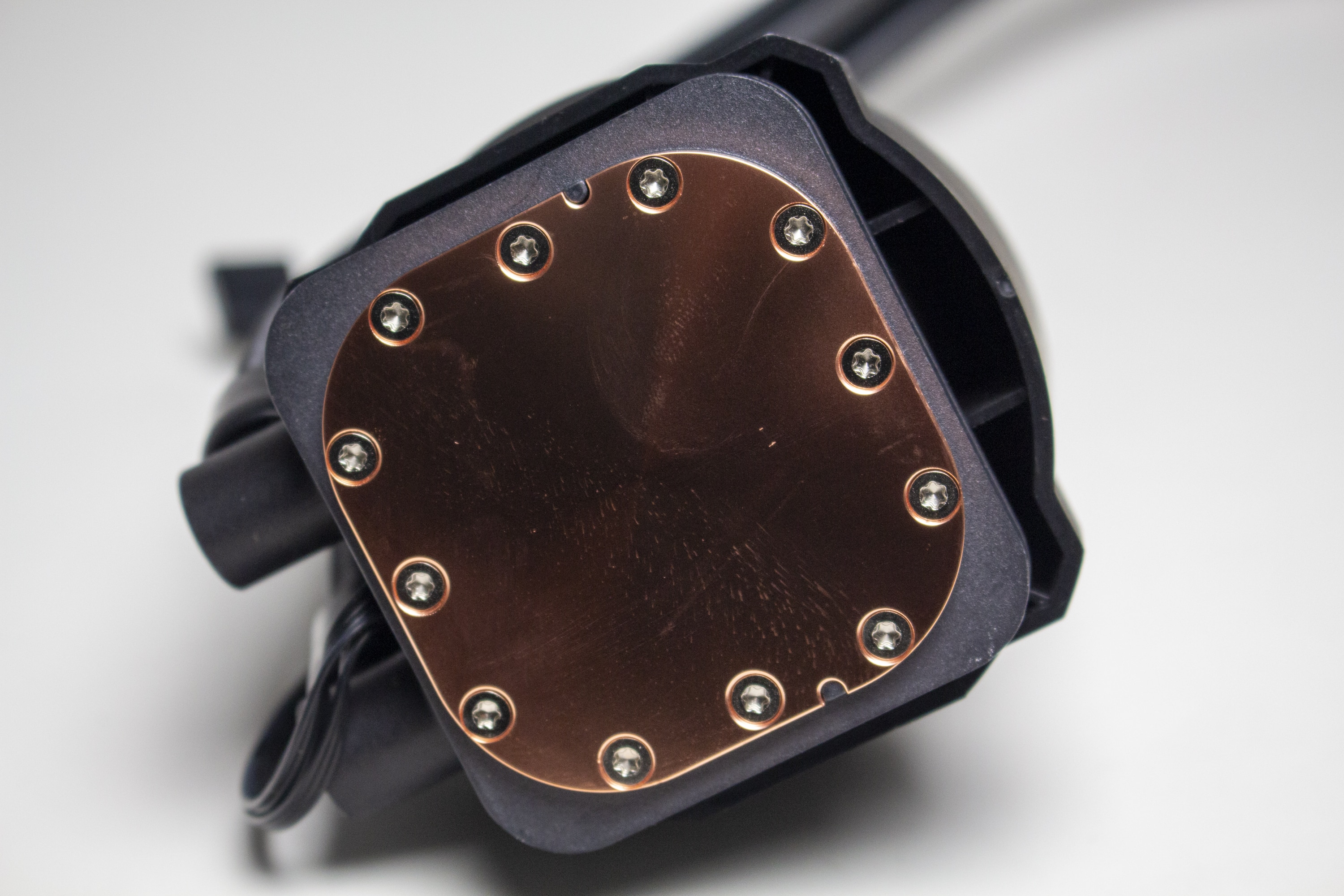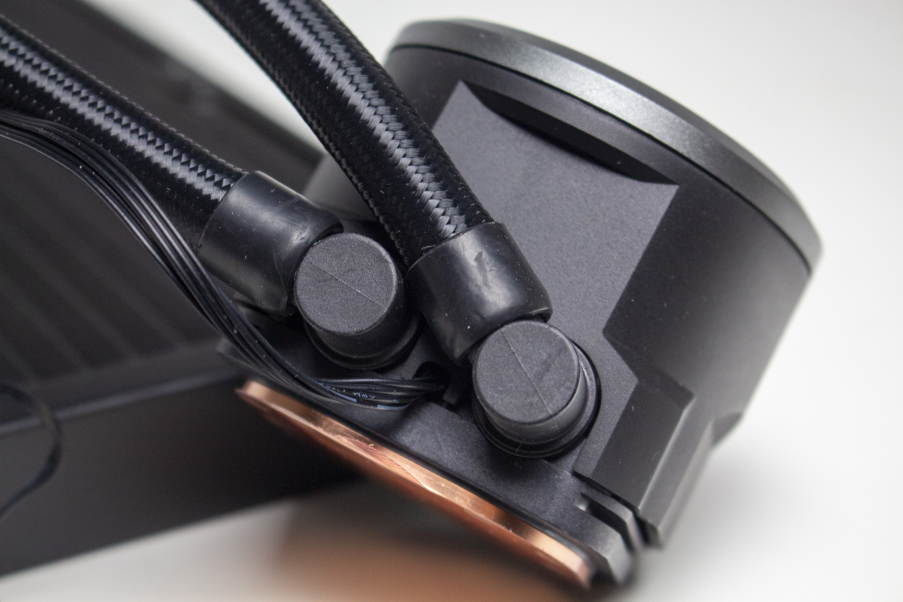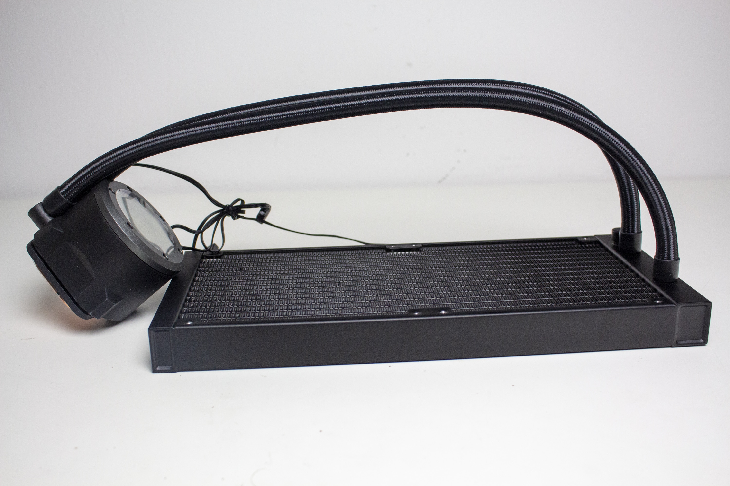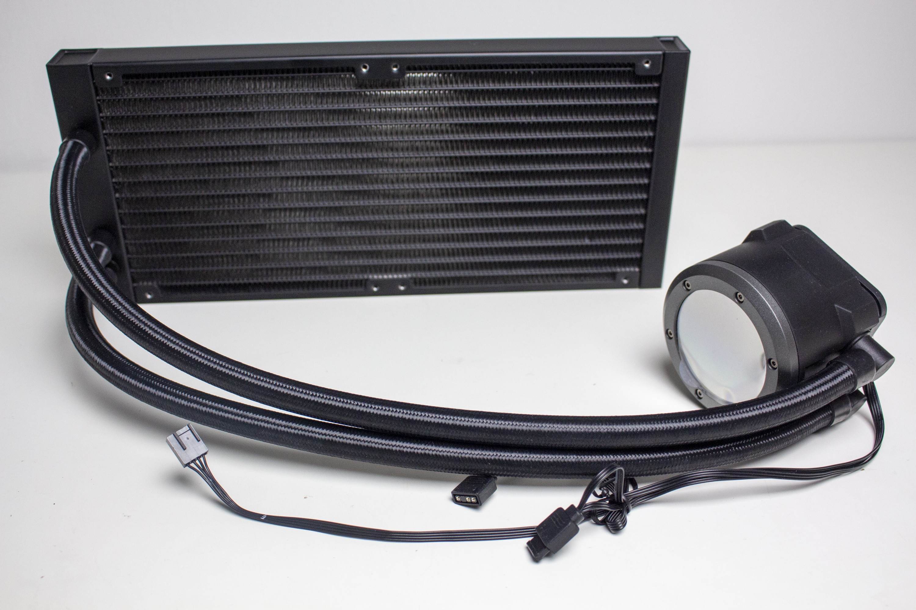 Die Wasserschläuche sind mit circa 460 Millimetern überdurchschnittlich lang und wurden von einem feinen, schwarzen Sleeve umhüllt. Über gepresste Kunststoffmuffen sind diese sowohl mit dem Radiator als auch mit der Pumpeneinheit fest verbunden. Eine Erweiterung des Kühlkreislaufs ist durch den Hersteller nicht vorgesehen. Zusätzlich verfügt der CPU-Block über drehbare Gelenke, die es erlauben die Schläuche sehr flexibel bewegen zu können und damit an die Montageposition im Gehäuse anzupassen.