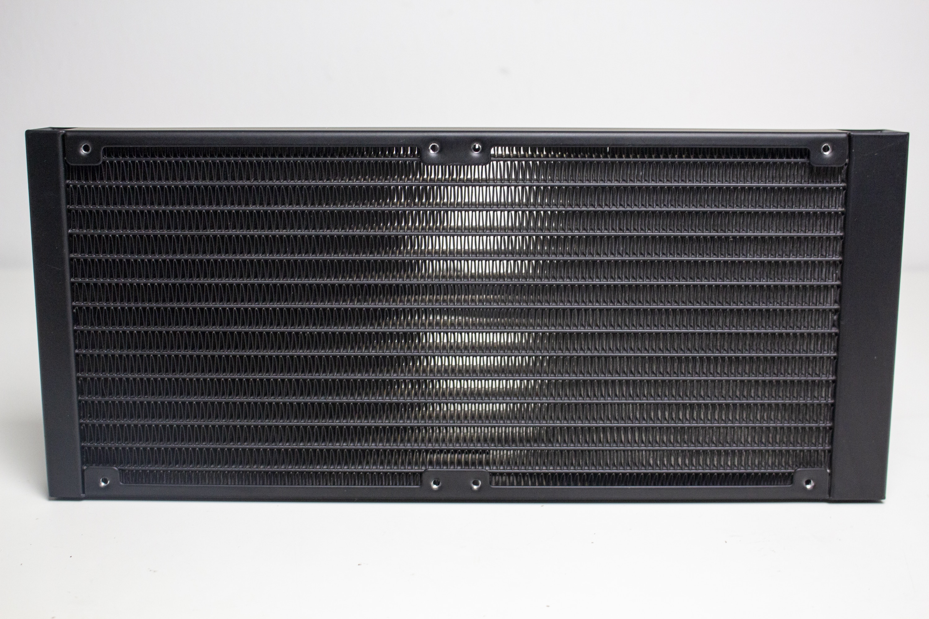 Thermaltake gestaltet den Radiator der TH280 V2 ARGB sehr schlicht und lackiert diesen vollständig schwarz. Der aus Aluminium gefertigte Radiator ist 27 Millimeter dick und liegt damit im Durchschnitt vieler handelsüblicher Kompaktwasserkühlungen. Als weitere Abmessungen gibt der Hersteller 371 Millimeter in der Länge und 139 Millimeter in der Breite an. Außerdem verfügt er am hinteren Ende neben den Schläuchen über ein Ventil, welches für den Druckausgleich zuständig ist.