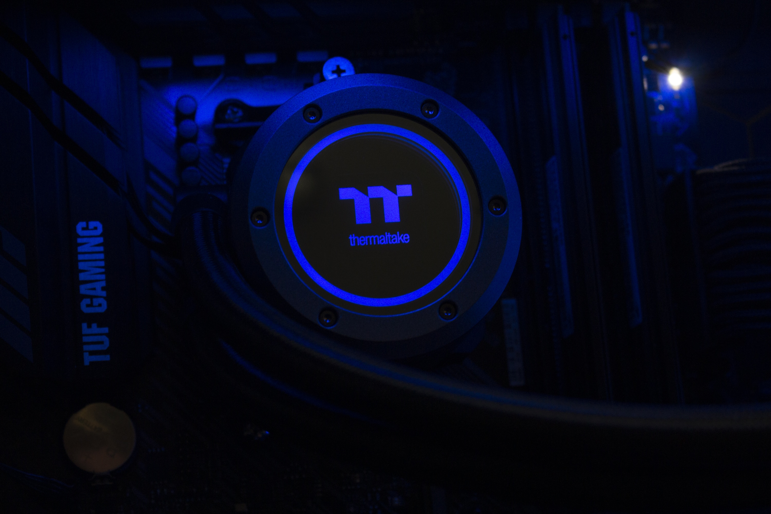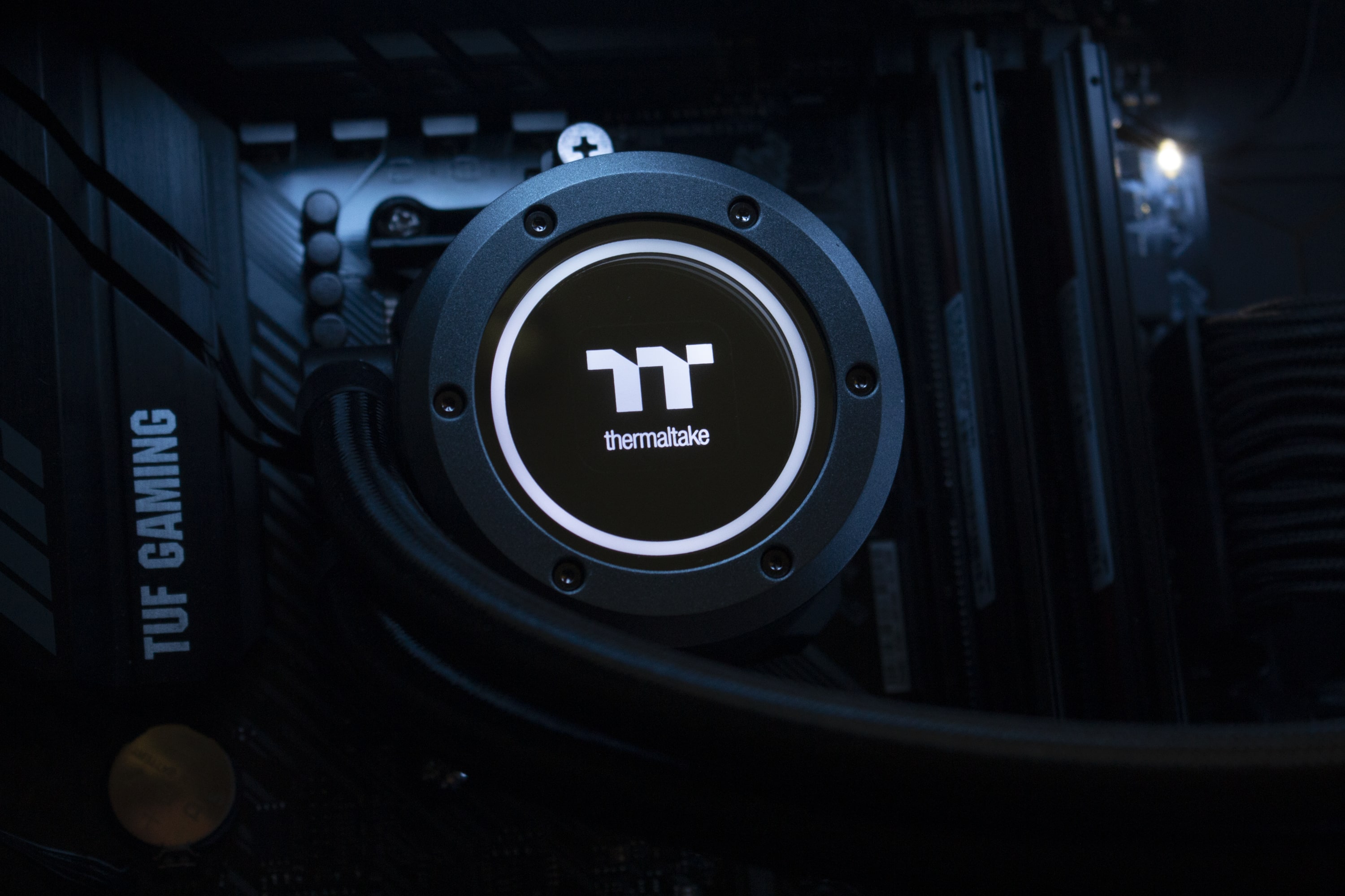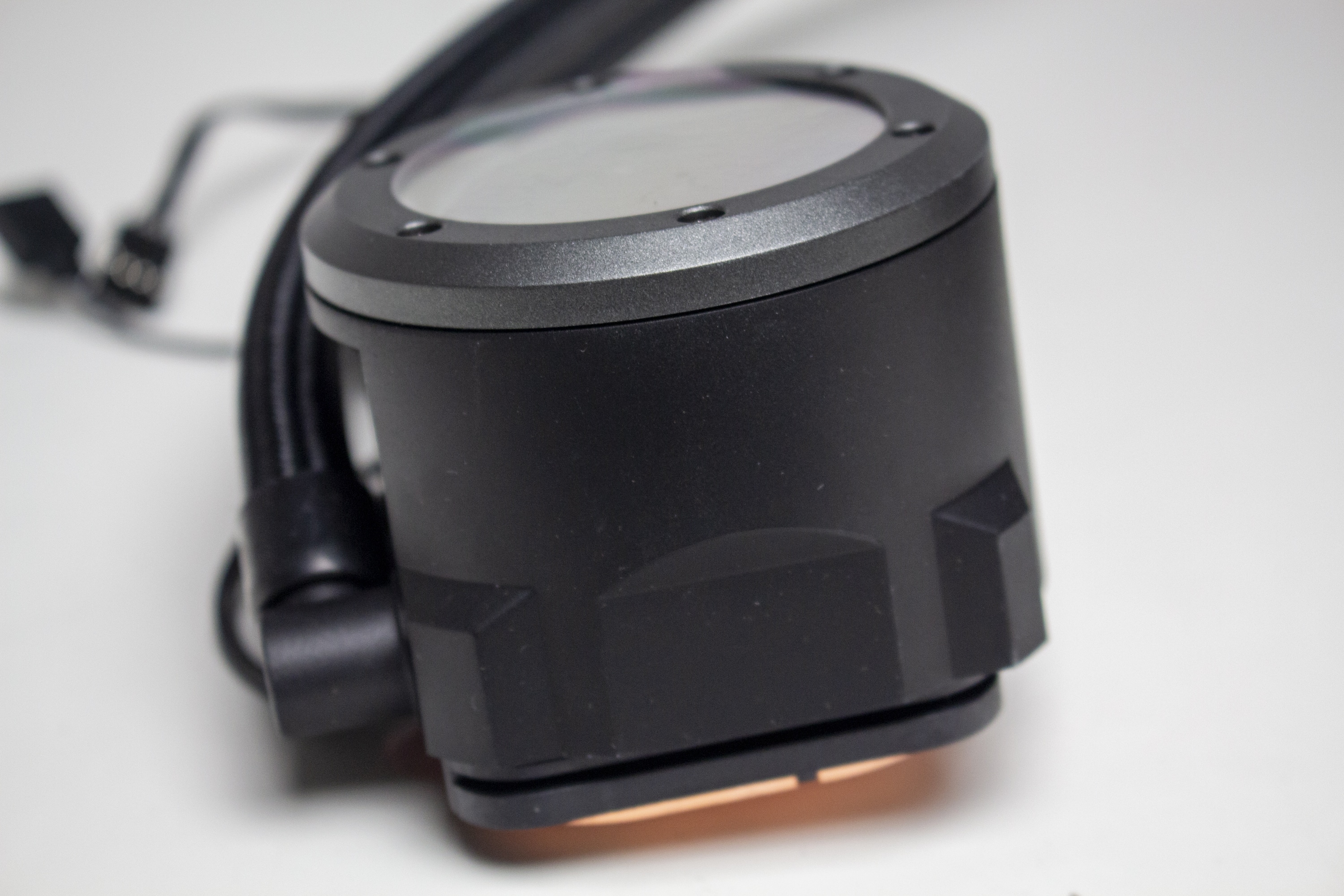 Das Gehäuse des Pumpenblocks besteht vollständig aus schwarzem Kunststoff, welches mit Deckelbereich mit einer Spiegelfläche abgeschlossen wurde. Zudem ist die Spiegelfläche von einem grauen Ring im „Industrial Look“ eingefasst. Die im Block eingebaute Pumpe dreht mit maximal 3300 Umdrehungen pro Minute und wird über einen 4-Pin-PWM-Stecker mit Strom versorgt. Die Übertragung der Wärme vom Heatspreader der CPU an den Pumpenblock erfolgt über eine große Kupferplatte. Unterhalb der Spiegelplatte positioniert Thermaltake zahlreiche ARGB-LEDs. Dazu aber später mehr.