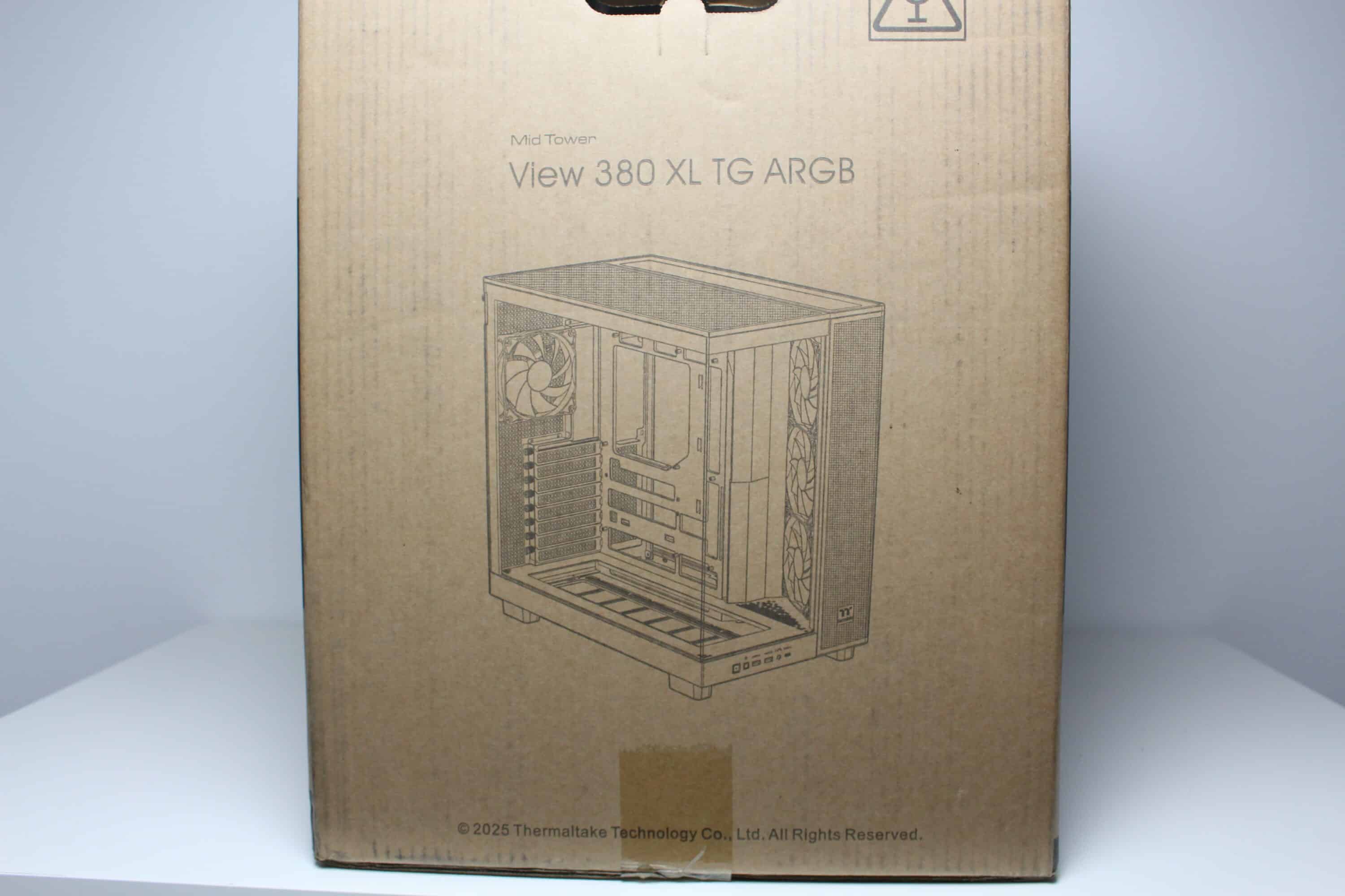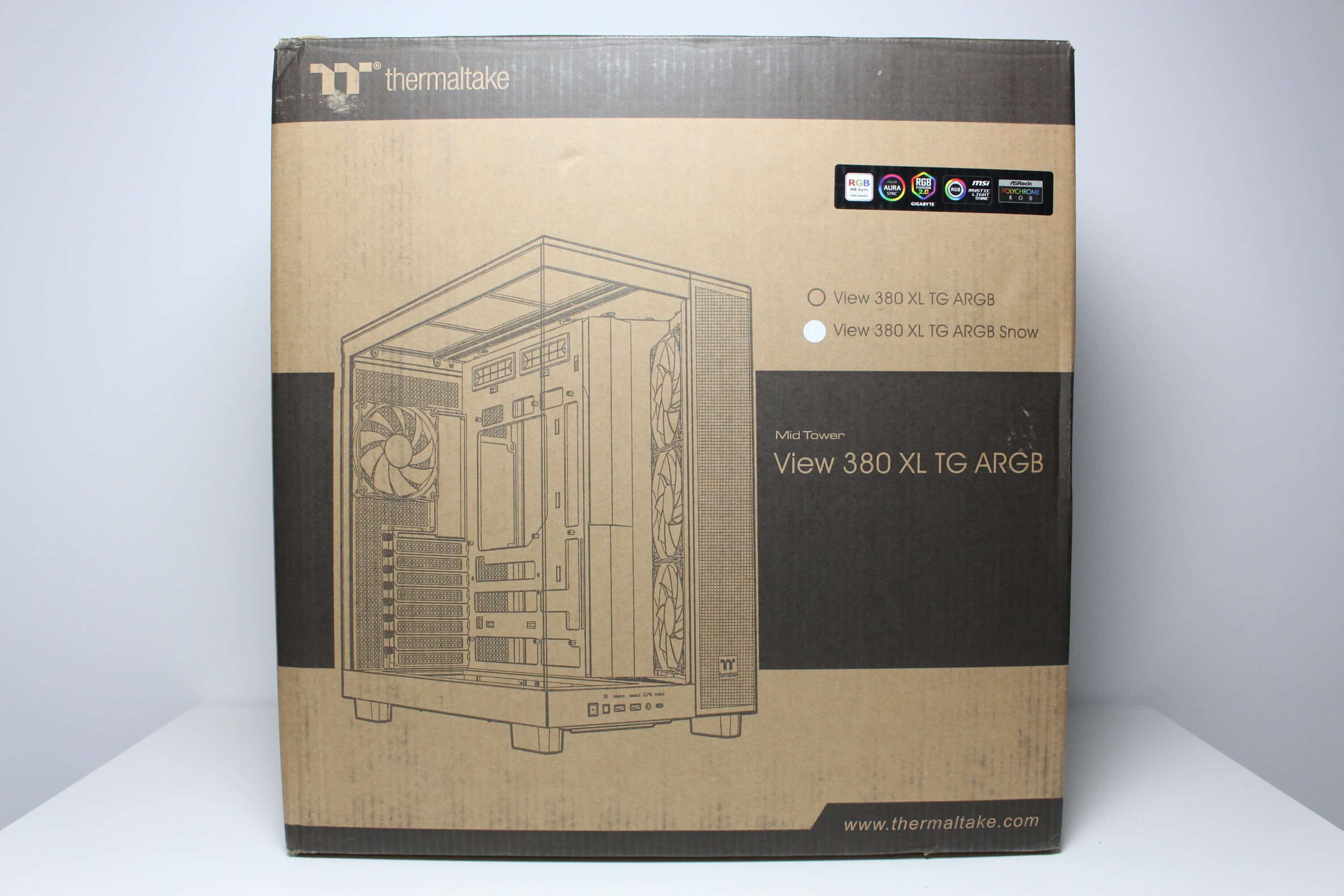 Thermaltake verpackt das View 380 XL TG ARGB in einem einfachen Karton aus brauner Pappe. Auf drei Seiten der Verpackung platziert der Hersteller eine Abbildung des Gehäuses, welches hoffentlich im Inneren zu finden ist. Auf die Vorderseite klebt Thermaltake dann noch eine kleine Info zur ARGB-Unterstützung sowie einen Sticker, der eine Indikation auf die Farbe des Midi-Towers gibt. Zuletzt darf natürlich auch die Tabelle mit allen technischen Informationen nicht fehlen.
