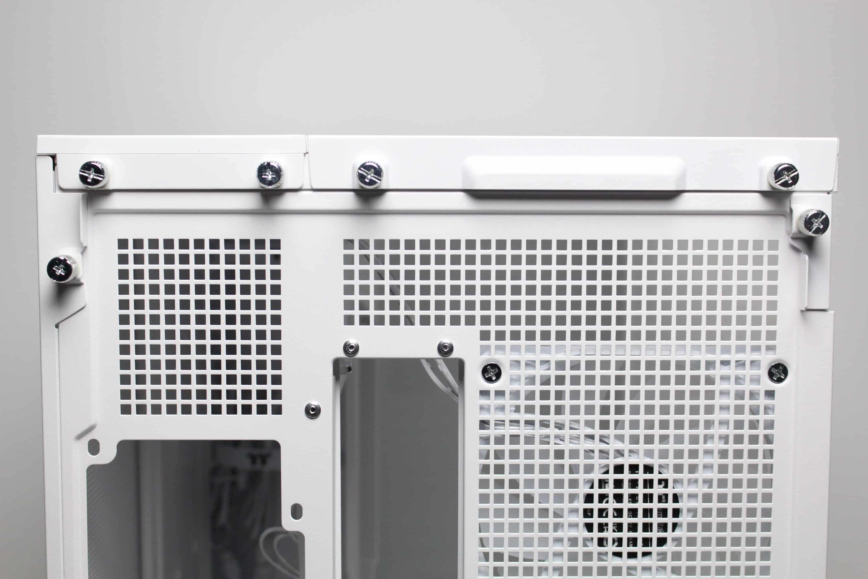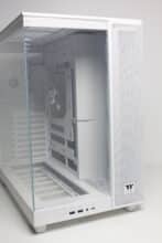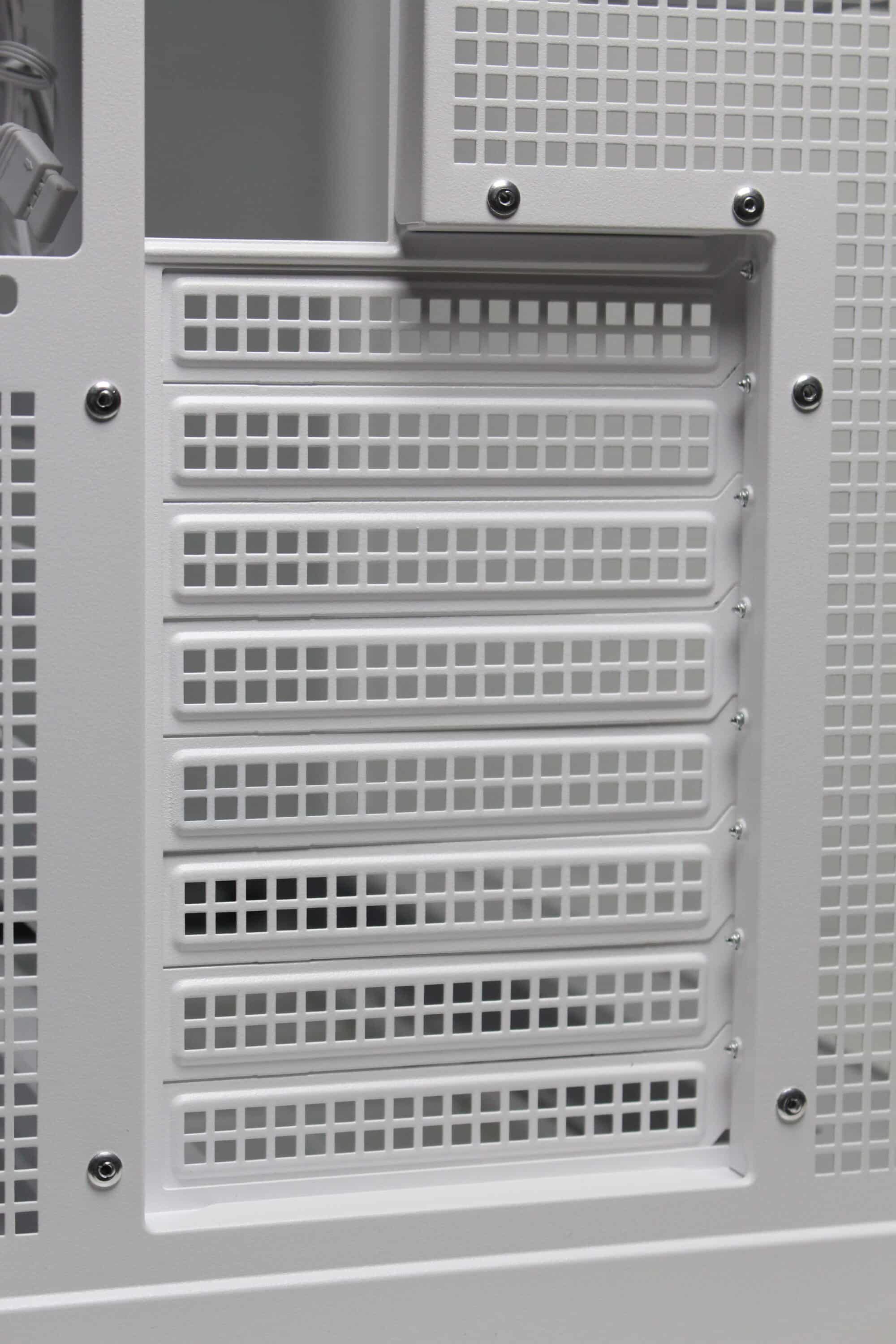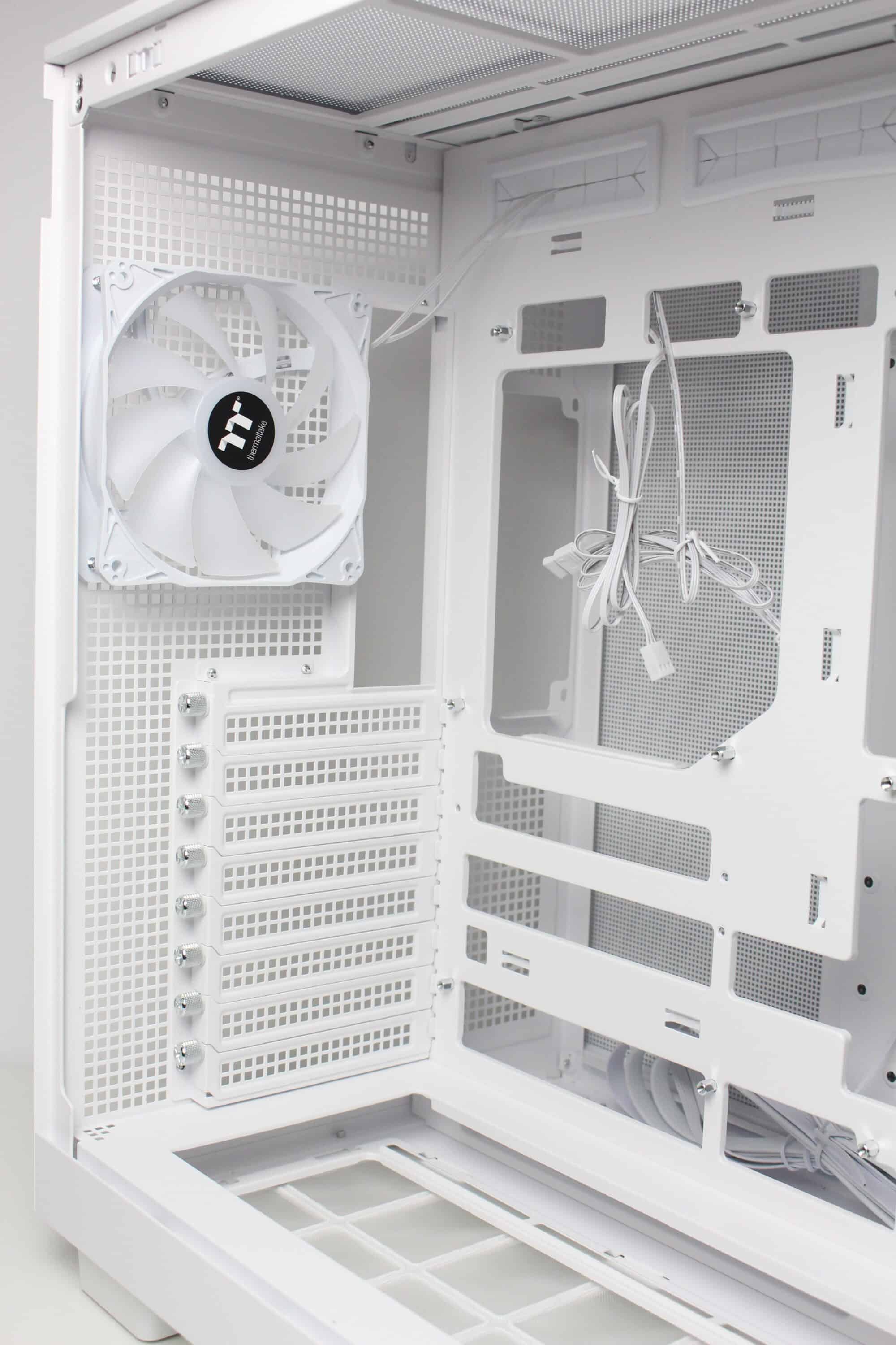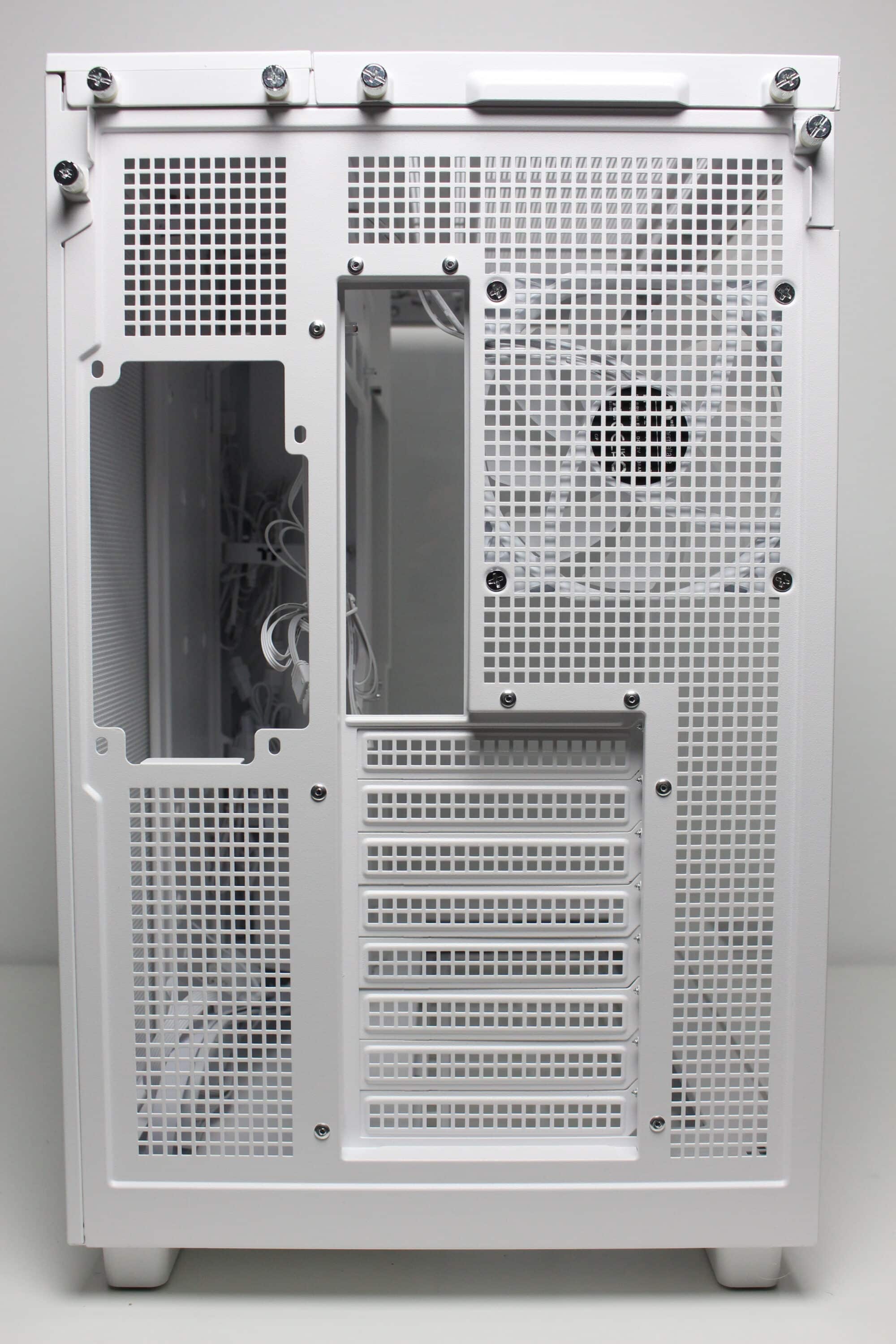 Der Aufbau an der Rückseite wirkt bekannt und ähnelt dem vieler anderer „Aquarium“-Gehäuse, welche über zwei vertikale Kammern verfügen. Auf der linken Seite lassen sich zahlreiche Belüftungsöffnungen sowie die Montageposition für das vertikal orientierte Netzteil erkennen. An der rechten Seite verbaut Thermaltake den vierten vorinstallierten Gehäuselüfter sowie acht Slots für Erweiterungskarten, die im Inneren mit Rändelschrauben verschraubt wurden und perforiert sind. Oberhalb des Lüfters und auch seitlich hat Thermaltake zudem weitere Belüftungsöffnungen implementiert.