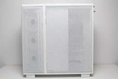 Die linke Seite des View 380 XL TG ARGB besteht, wie die Front, aus Tempered Glass und wurde auf einen Stahlrahmen geklebt. Die Montage am Korpus erfolgt über Push-Pins. Gleiches gilt für das rechte Seitenteil, dass jedoch aus Stahl besteht und ein riesiges Belüftungsgitter ist. Außerdem hat es dieselbe Optik bzw. Struktur wie das Gitter im Deckel und das gebogene Element zwischen Front und Seitenteil. Als zusätzliche Fixierung für den Transport verfügen beide Seitenteile an der Rückseite jeweils über eine Rändelschraube.