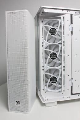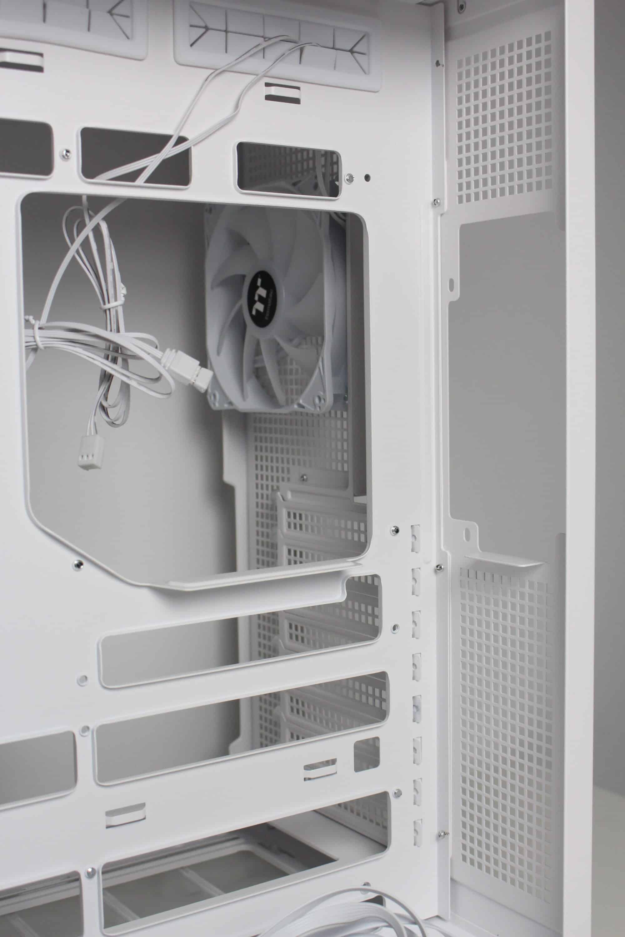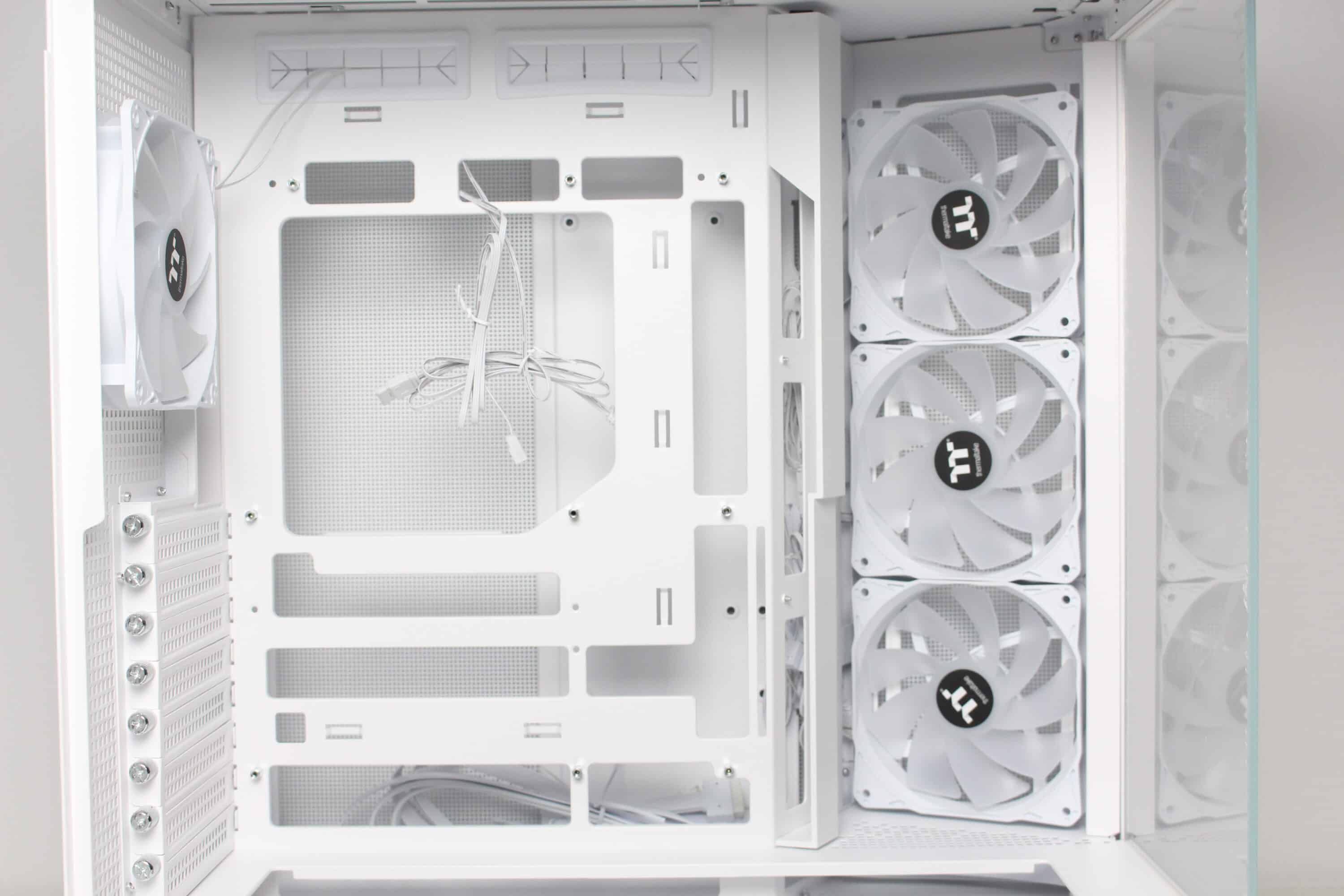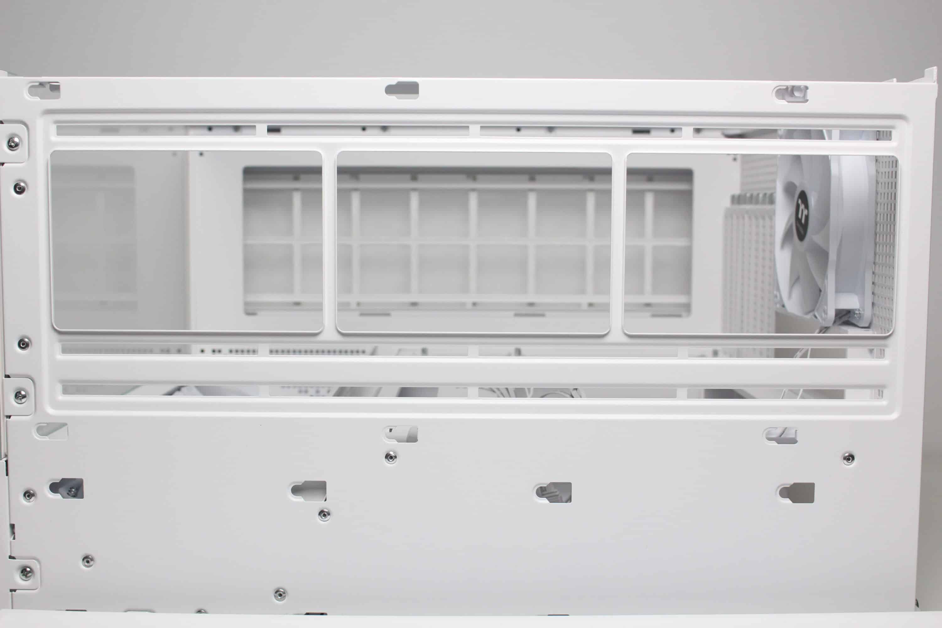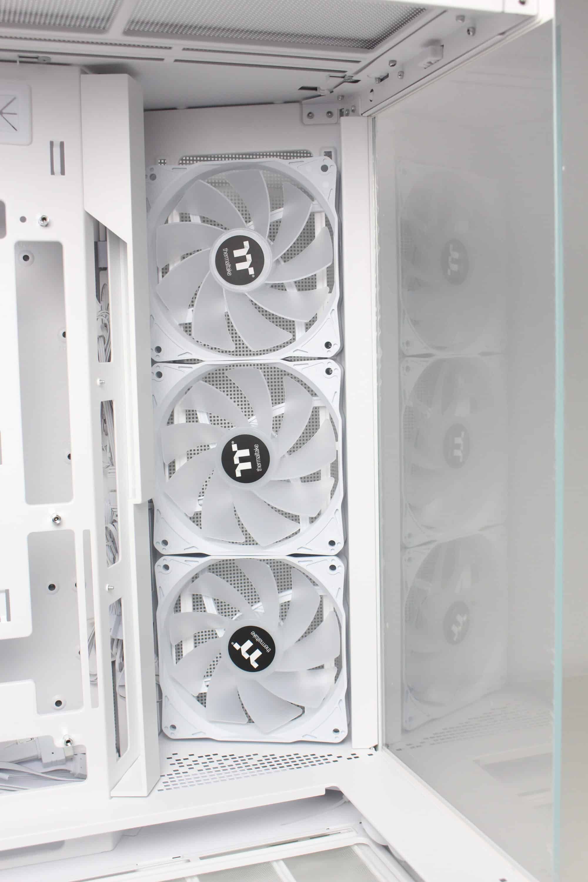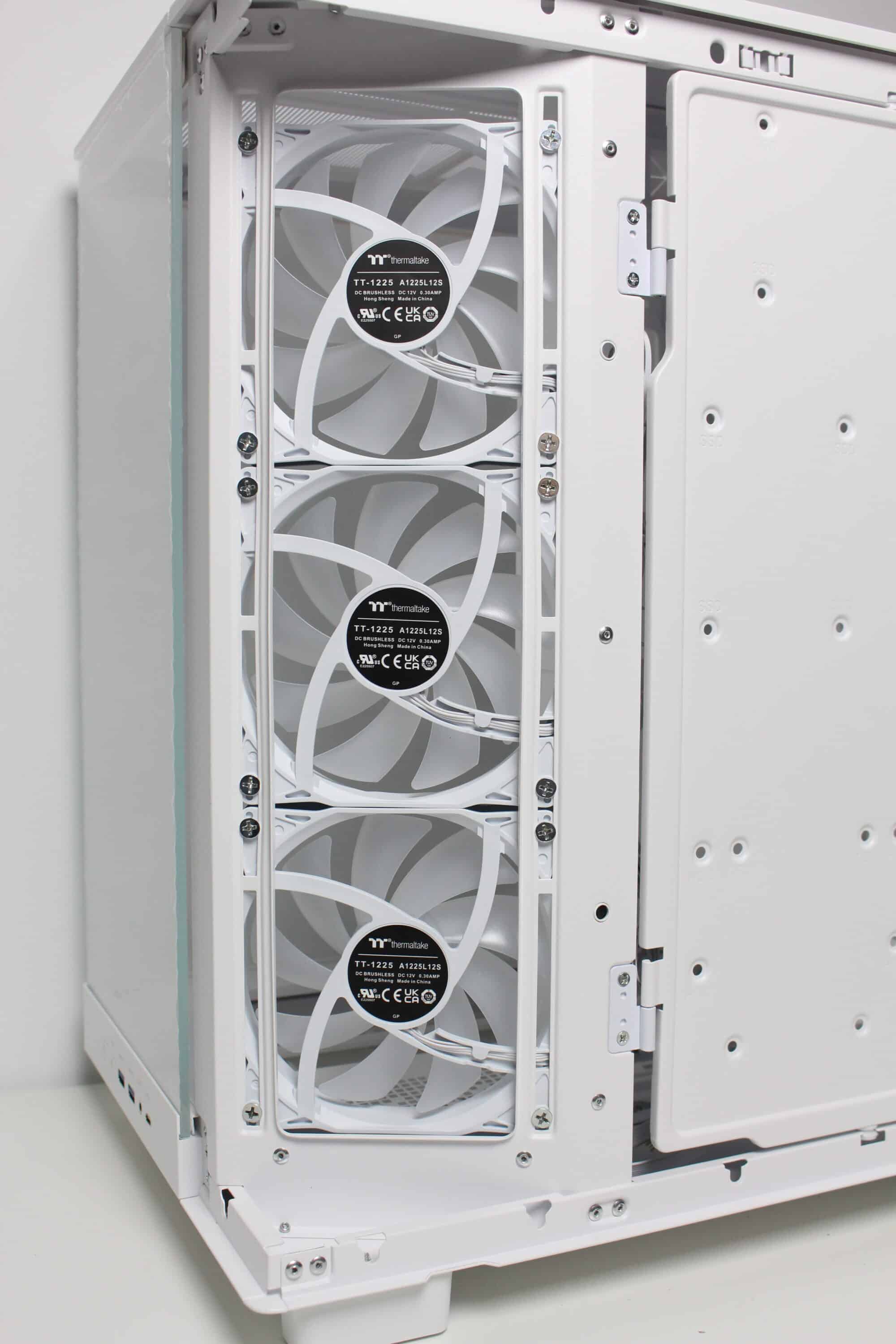 Damit trotz Glasfront ausreichend Luft in den Innenraum befördert werden kann, verbaut Thermaltake zwischen der Front und der rechten Seite einen Montagerahmen für drei 120-mm-Lüfter und bestückt ab Werk auch alle Plätze. Der Winkel des Rahmens soll dafür sorgen, dass die kalte Luft direkt zu den Komponenten gelangt und nicht erst auf die andere Gehäuseseite prallt und um 90 Grad abgelenkt wird. Vor den Lüftern wurde ein Lüftergitter platziert, das mittels Schrauben entfernt werden kann, jedoch nicht mit einem weiteren Staubfilter ausgestattet wurde.