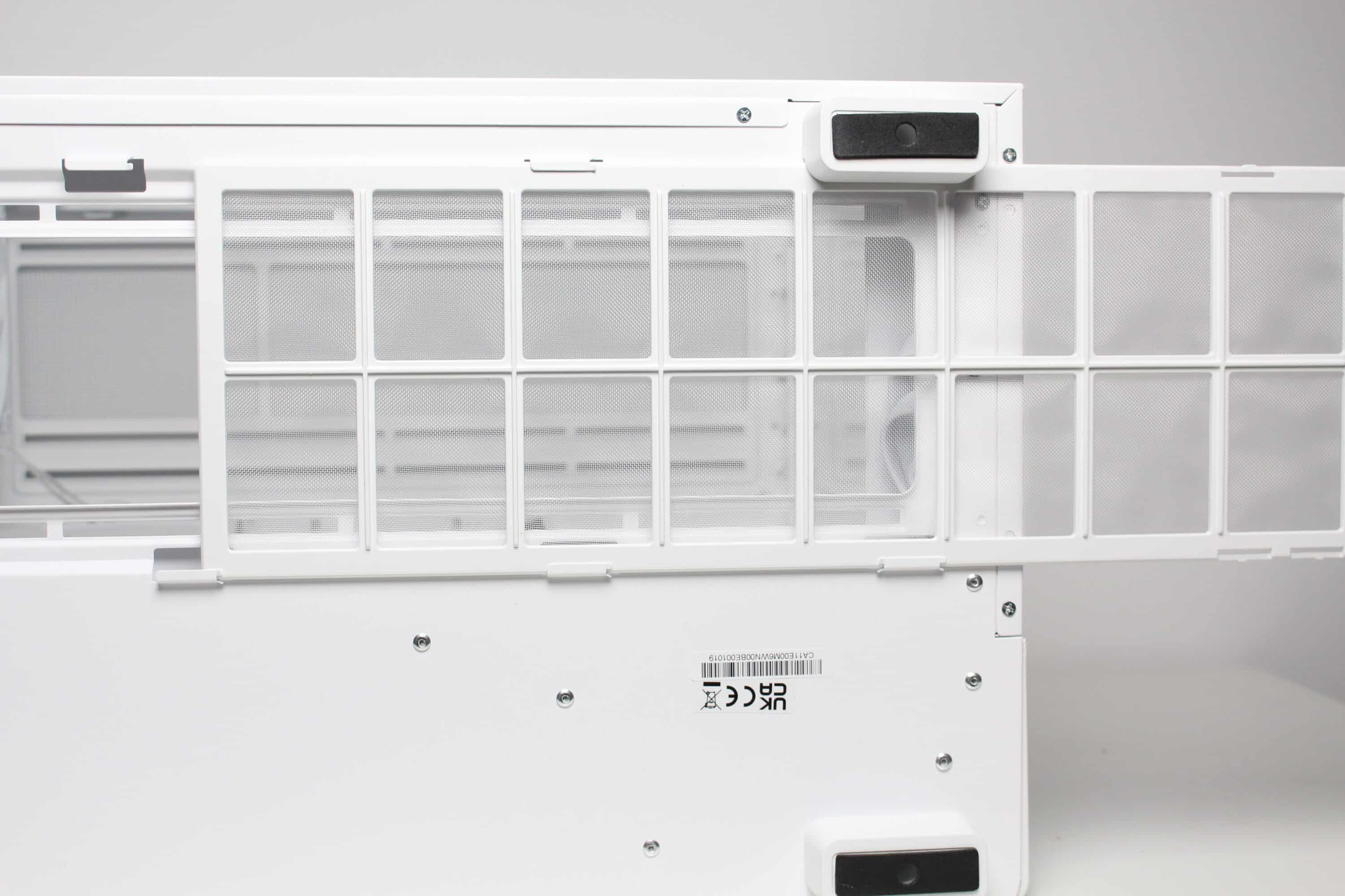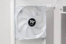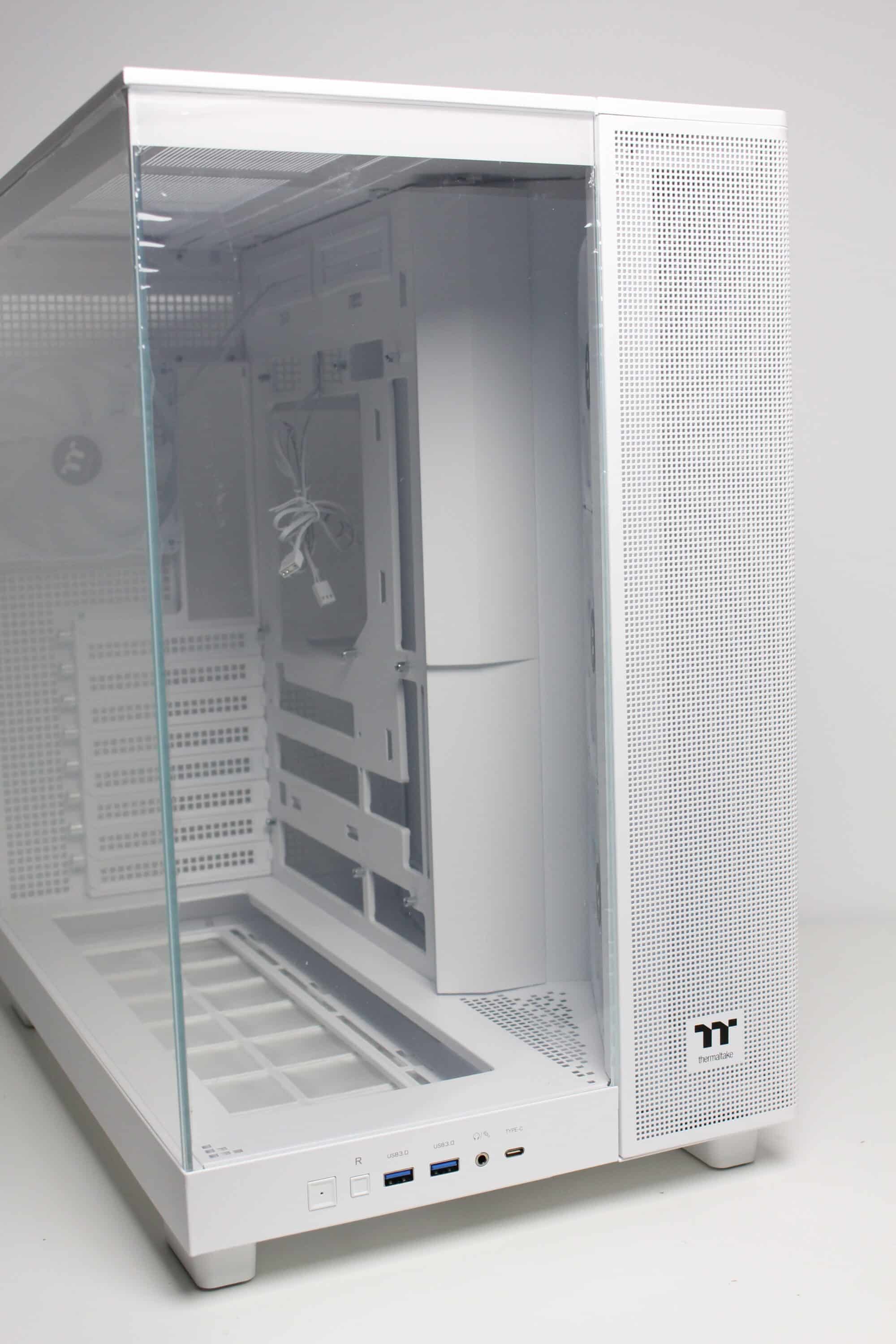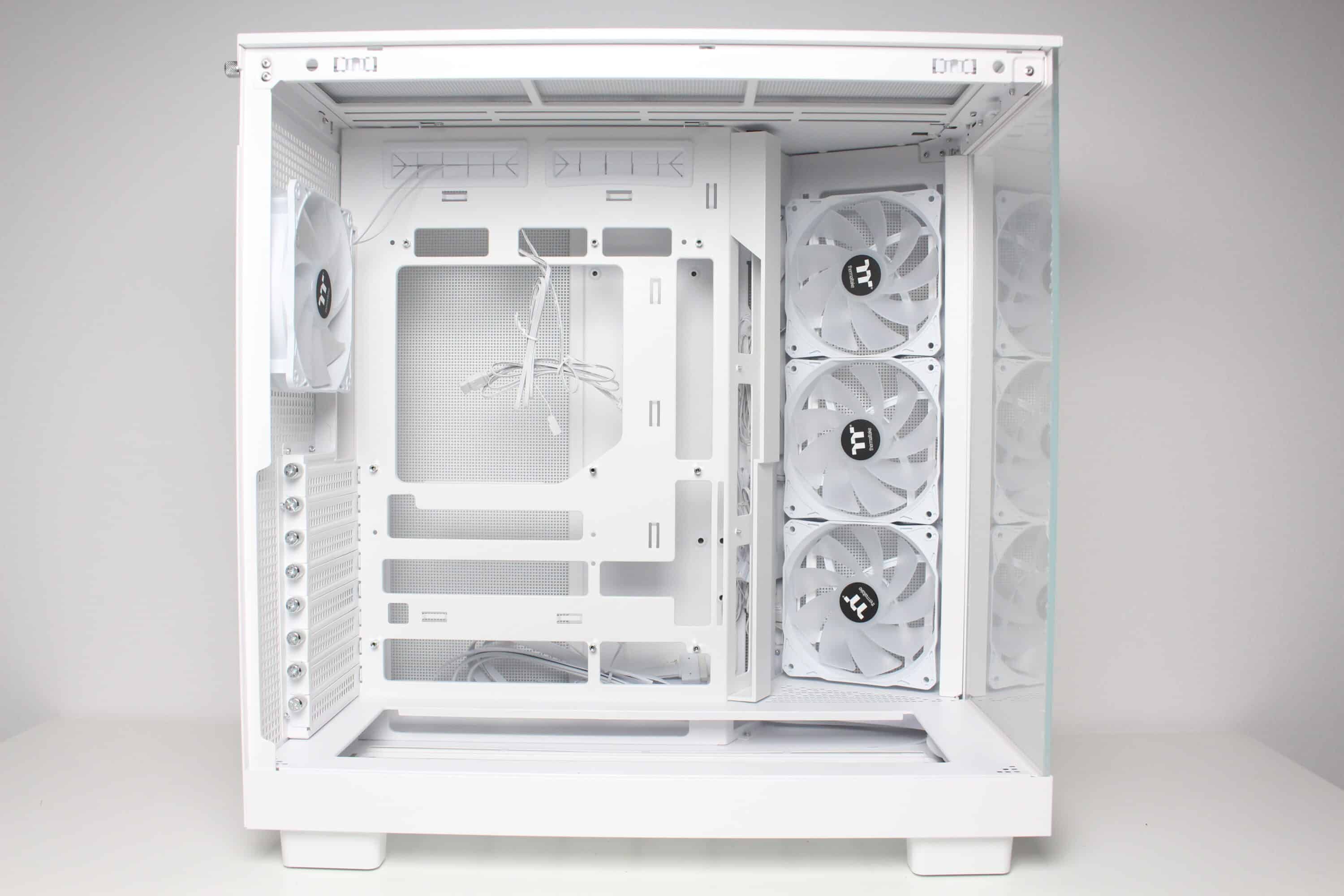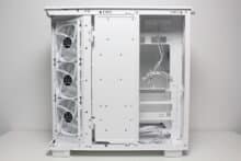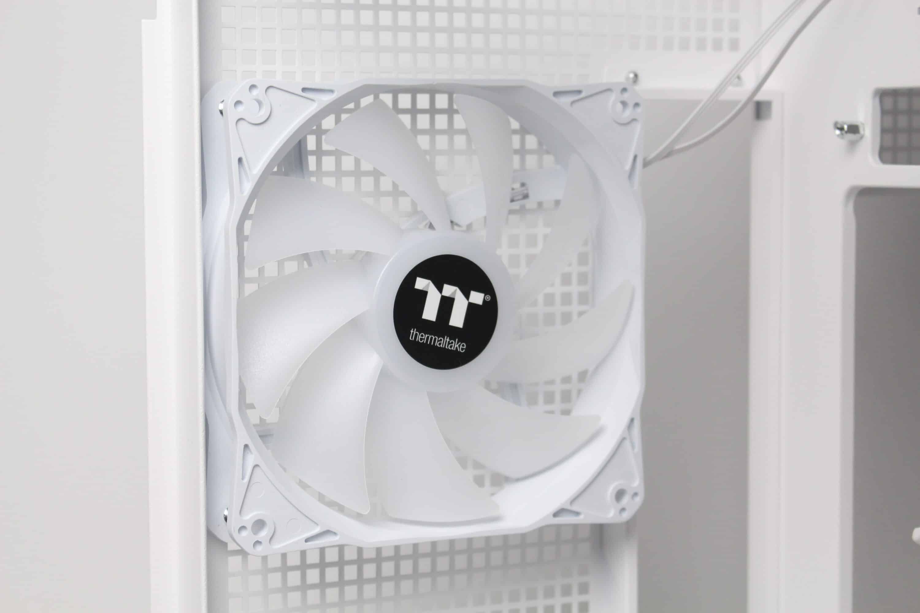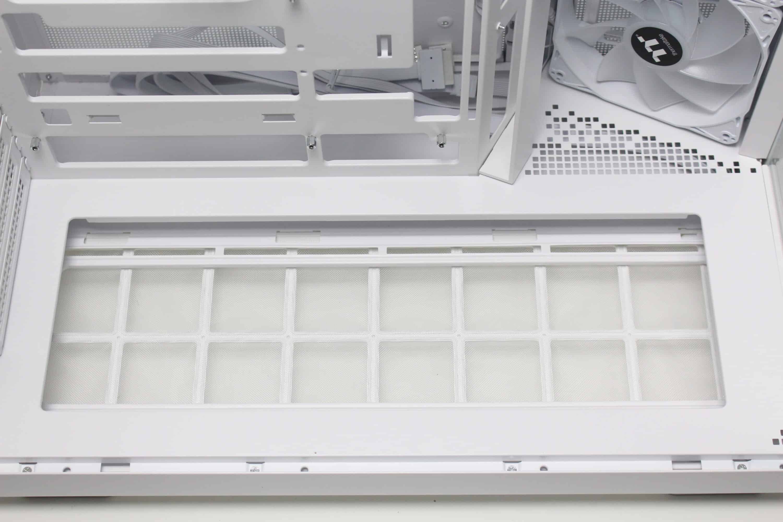 Damit trotz Glasfront ausreichend Luft in den Innenraum befördert werden kann, verbaut Thermaltake zwischen der Front und der rechten Seite einen Montagerahmen für drei 120-mm-Lüfter und bestückt ab Werk auch alle Plätze. Der Winkel des Rahmens soll dafür sorgen, dass die kalte Luft direkt zu den Komponenten gelangt und nicht erst auf die andere Gehäuseseite prallt und um 90 Grad abgelenkt wird. Vor den Lüftern wurde ein Lüftergitter platziert, das mittels Schrauben entfernt werden kann, jedoch nicht mit einem weiteren Staubfilter ausgestattet wurde.
