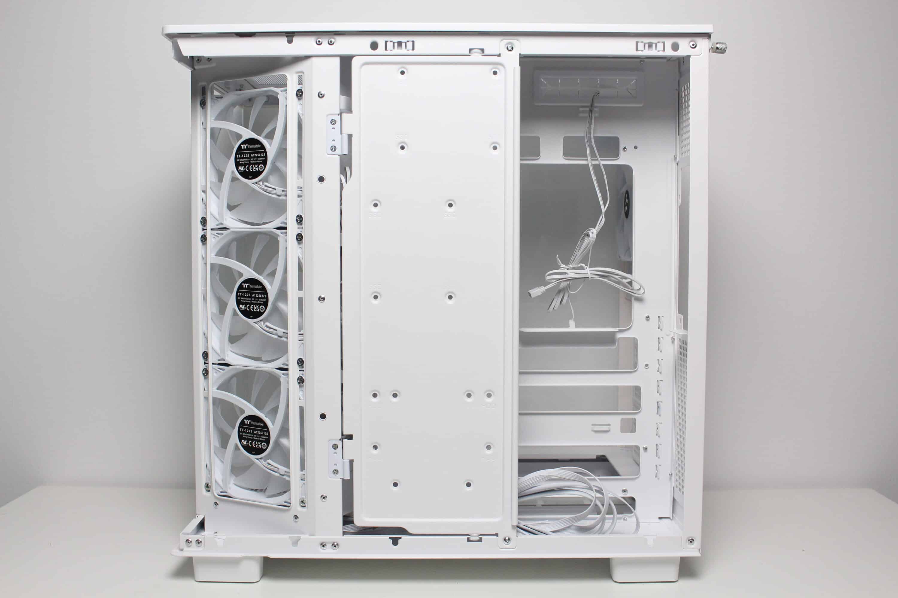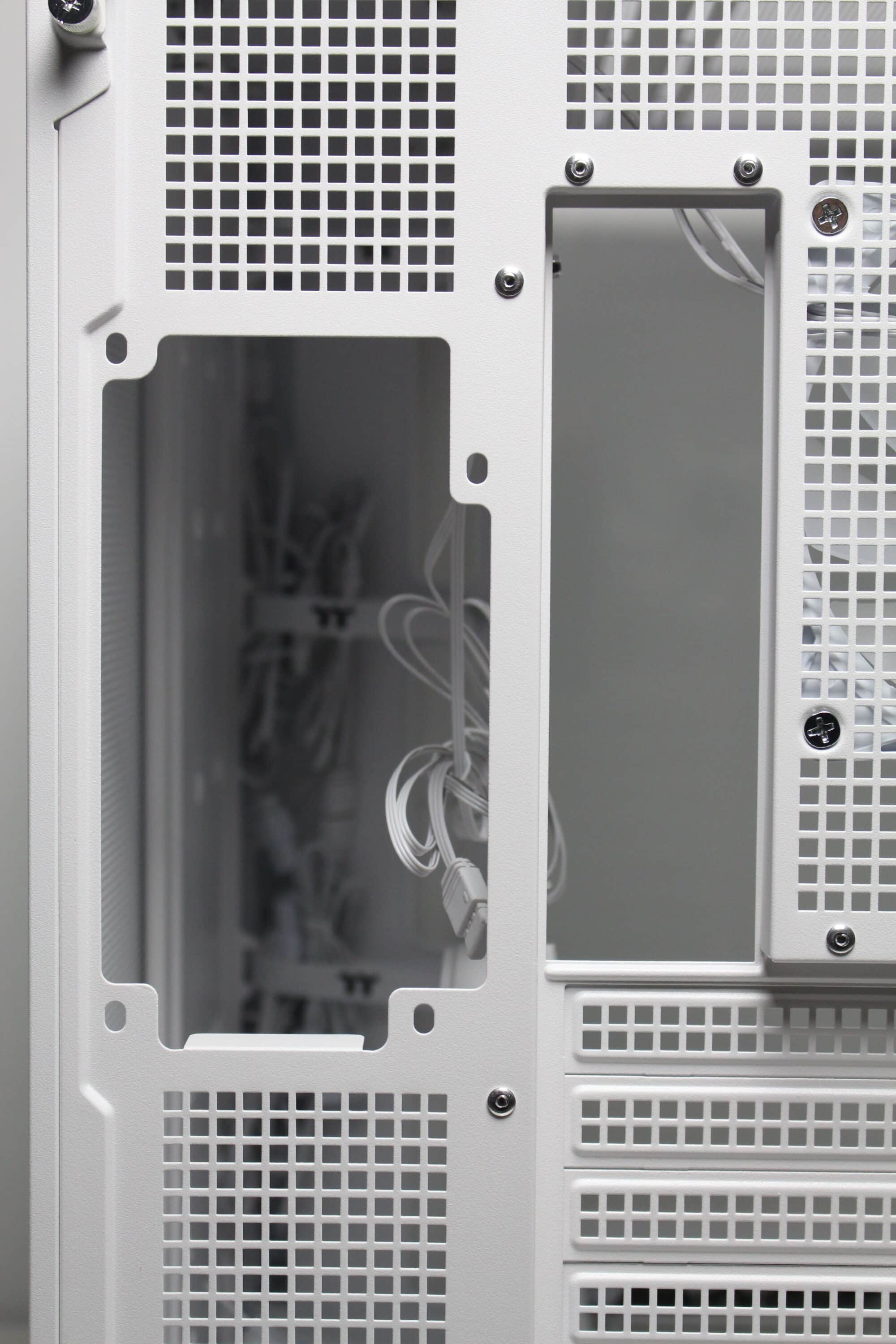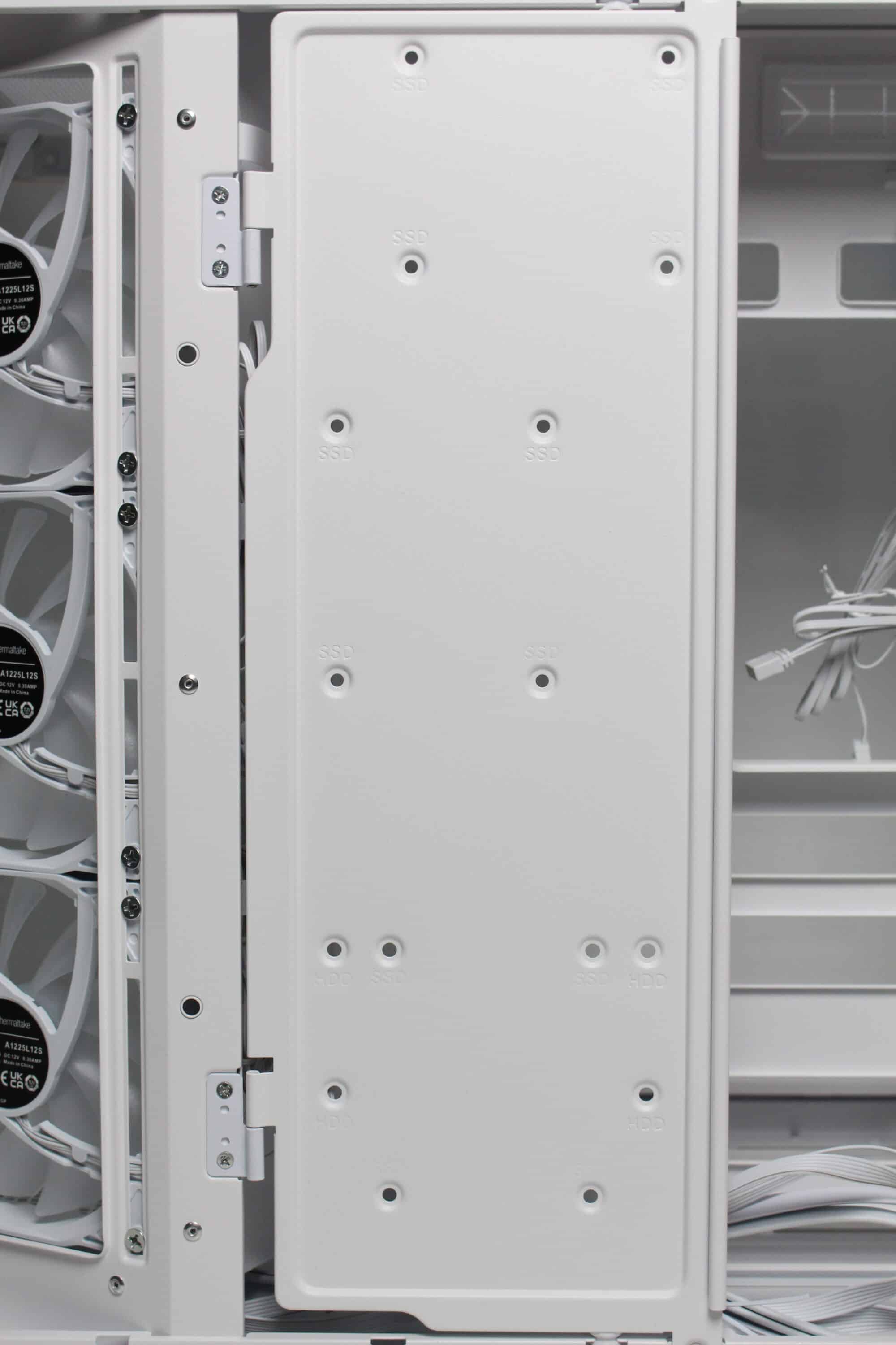 Nachdem wir das rechte Seitenteil entfernt haben, fiel der Blick zunächst auf eine große, weiße Fläche, die ungefähr die Hälfte der zweiten Kammern verdeckt. Die Fläche dient als Montagepunkt für mehrere Datenträger und kann nach dem Lösen von zwei Schrauben einfach aufgeklappt werden. Dahinter kommt dann die sehr geräumige Netzeilkammer zum Vorschein. Neben dem Platz für das Netzteil hat Thermaltake die Rückseite auch mit zahlreichen Ösen für Kabelbinder bzw. mit drei wiederverwendbaren Klettstreifen ausgestattet. Kabelmanagementprobleme sollte es im View 380 XL TG ARGB also nicht geben.