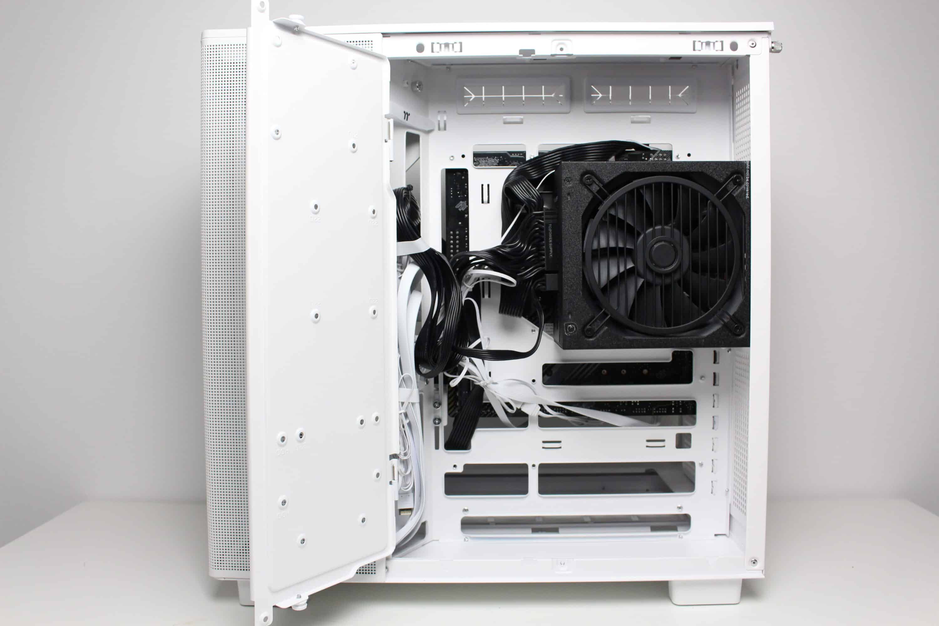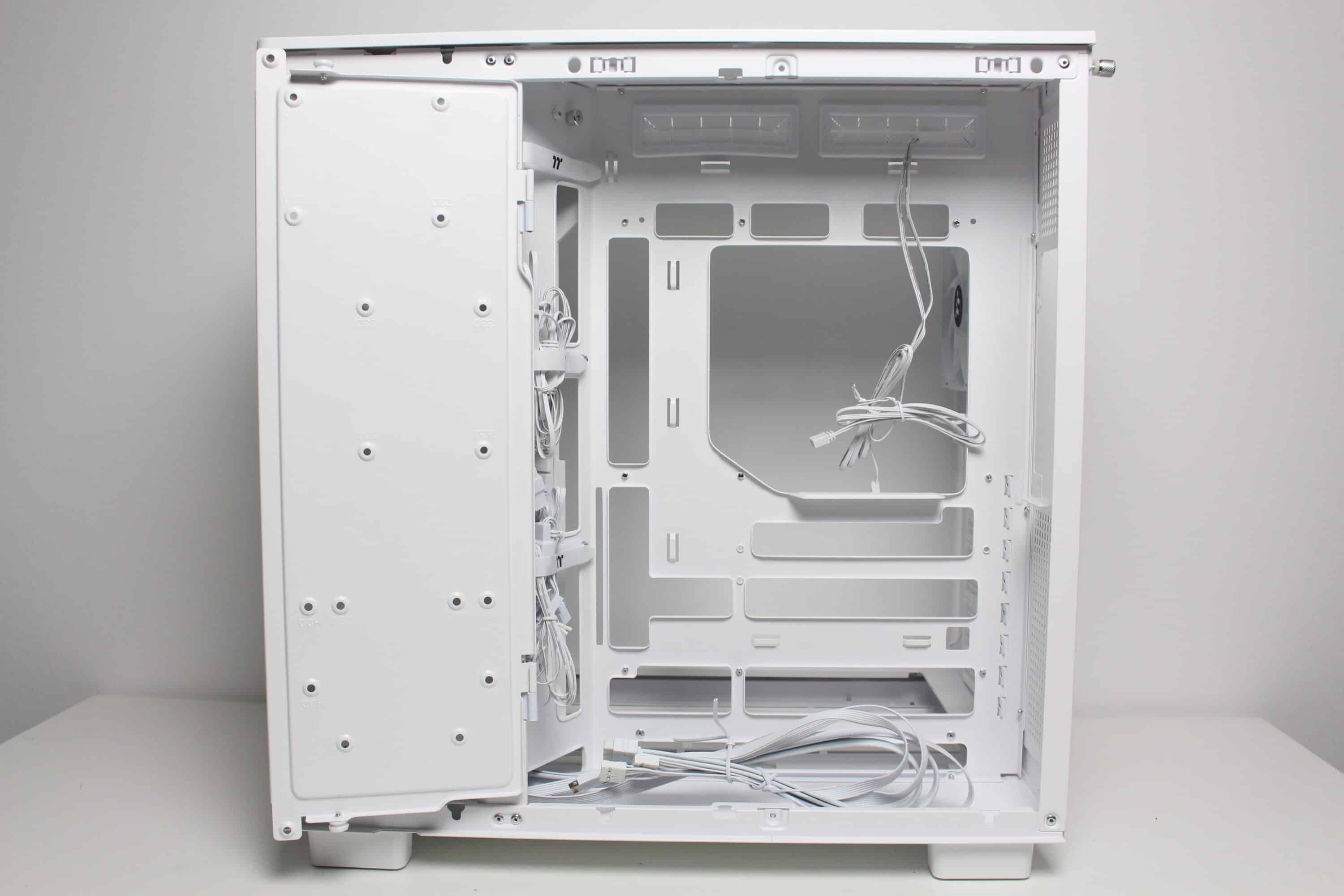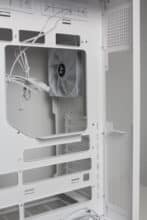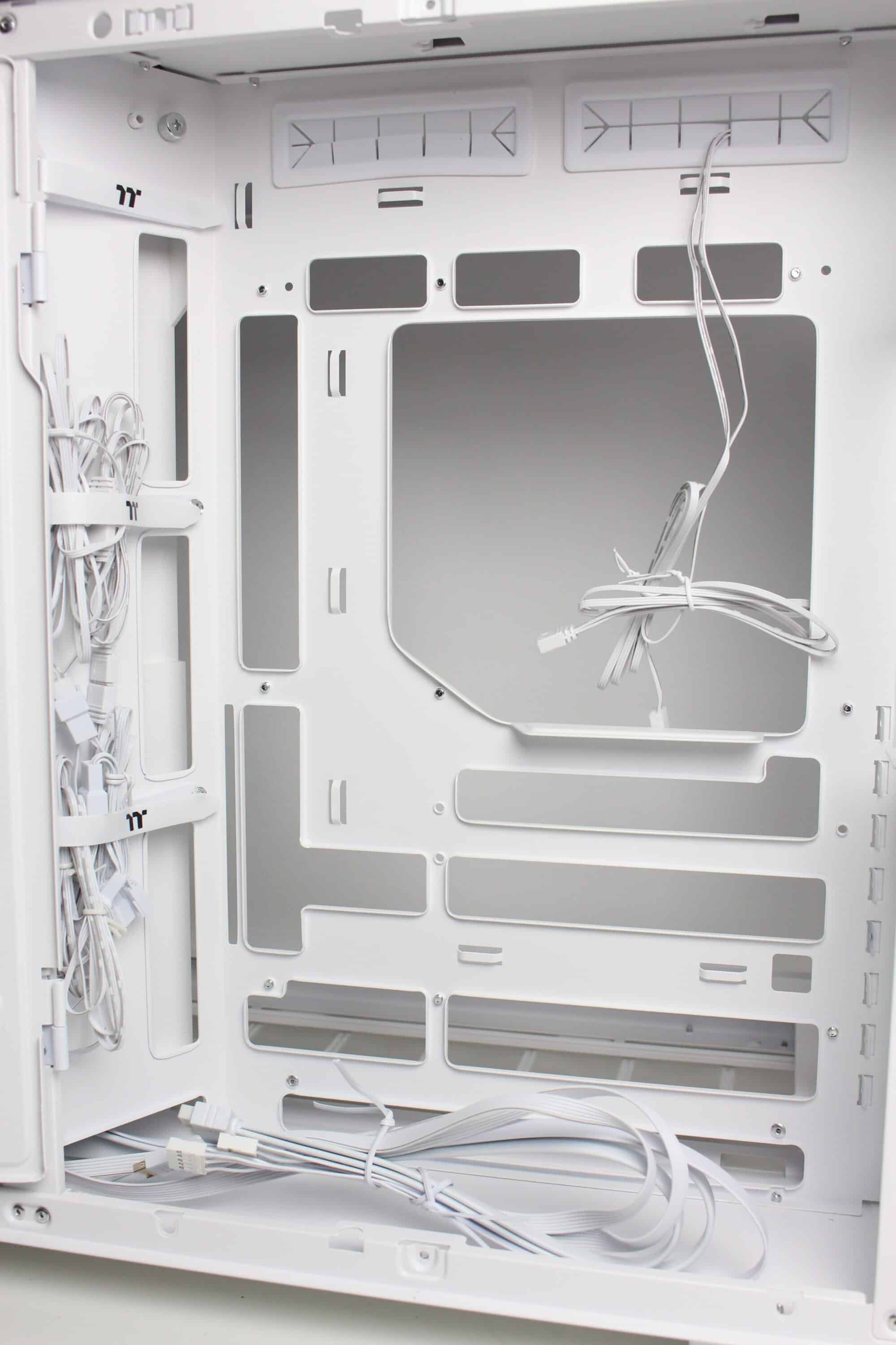 Nachdem wir das rechte Seitenteil entfernt haben, fiel der Blick zunächst auf eine große, weiße Fläche, die ungefähr die Hälfte der zweiten Kammern verdeckt. Die Fläche dient als Montagepunkt für mehrere Datenträger und kann nach dem Lösen von zwei Schrauben einfach aufgeklappt werden. Dahinter kommt dann die sehr geräumige Netzeilkammer zum Vorschein. Neben dem Platz für das Netzteil hat Thermaltake die Rückseite auch mit zahlreichen Ösen für Kabelbinder bzw. mit drei wiederverwendbaren Klettstreifen ausgestattet. Kabelmanagementprobleme sollte es im View 380 XL TG ARGB also nicht geben.