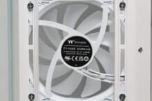 Ab Werk verbaut Thermaltake im View 380 XL TG ARGB vier Lüfter. Dazu gehören drei 120-mm-Lüfter mit ARGB-Beleuchtung an der seitlichen Front, die über sogenannten „Reverse-Blades“ verfügen sowie ein weiterer 120-mm-ARGB-Lüfter an der Rückseite des Midi-Towers. Optisch sind alle vier Lüfter ähnlich. Der milchig-weiße Rotor ist von einem weißen Rahmen umrandet und pro Lüfter gibt es einen 3-Pin 12V-Anschluss für die Stromversorgung sowie einen 3-Pin 5V-Anschluss zur Adressierung der LEDs. Der Drehzahlbereich lag in unserem Test zwischen 390 und 930 Umdrehungen pro Minute. Eine Entkopplung des Rahmens, z.B. über gummierte Ecken, gibt nicht.