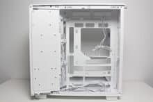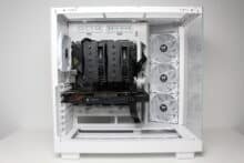 Der Einbau und die Verkabelung unseres Testsystems waren schnell erledigt und gingen leicht von der Hand. Die grundlegenden Platzverhältnisse sind sehr großzügig und es gibt überall genug Raum zum Arbeiten. Zusätzlich brachten die vorinstallierten Abstandshalter, die Rändelschrauben sowie die Push-Pin-Montage der Seitenteile eine ordentliche Zeitersparnis mit sich. Zuletzt ist auch das Kabelmanagementsystem gut durchdacht und es gibt überall sinnvoll benutzbare Kabeldurchführungen und Haltepunkte für Kabelbinder. Das Gesamtergebnis wirkt ordentlich, aber ohne Radiatoren und eine besonders lange Grafikkarte gibt es im Innenraum sehr viel gähnende Leere.