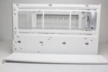 Als letztes verlieren wir in diesem Kapitel verlieren noch ein Wort über die Kapazitäten für Datenträger. Gemessen an seiner Größe und dem Platz hinter dem Mainboard-Tray ist das jedoch keine besonders vorzeigbare Eigenschaft dieses Midi-Towers. Lediglich eine 3,5″- und 2,5″ oder drei 2,5″-Datenträger können an der aufklappbaren Tür gleichzeitig verbaut werden, obwohl es unter dem Netzteil theoretisch noch viel mehr Platz geben würde. Zudem gibt es keine Entkopplung und die Montage erfolgt nicht werkzeuglos.